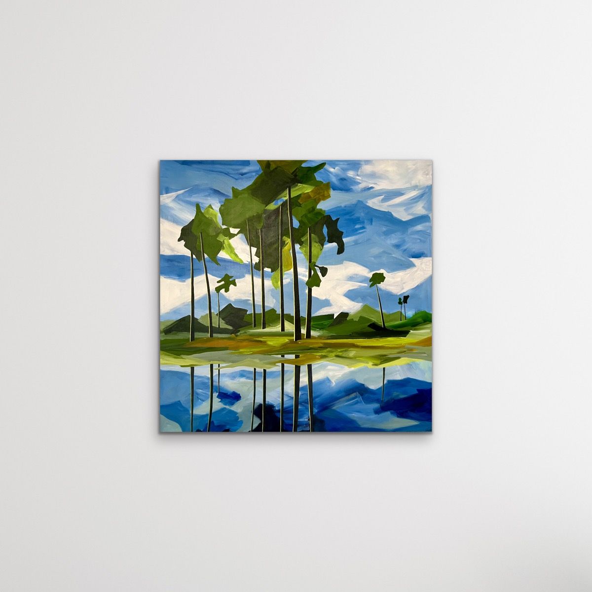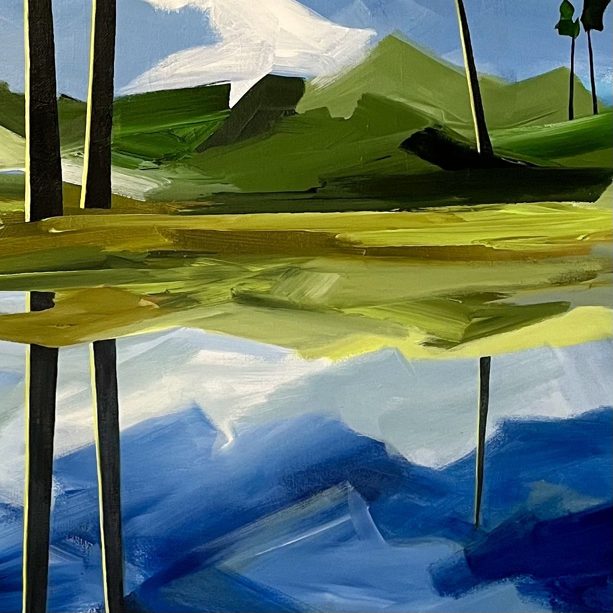 Painting this piece was a dream. It was wonderful scene when I came these trees whilst walking. I sketched and took photos and then planned it further, breaking the image down into shapes and playing with the colours. There is something very peaceful about water and as