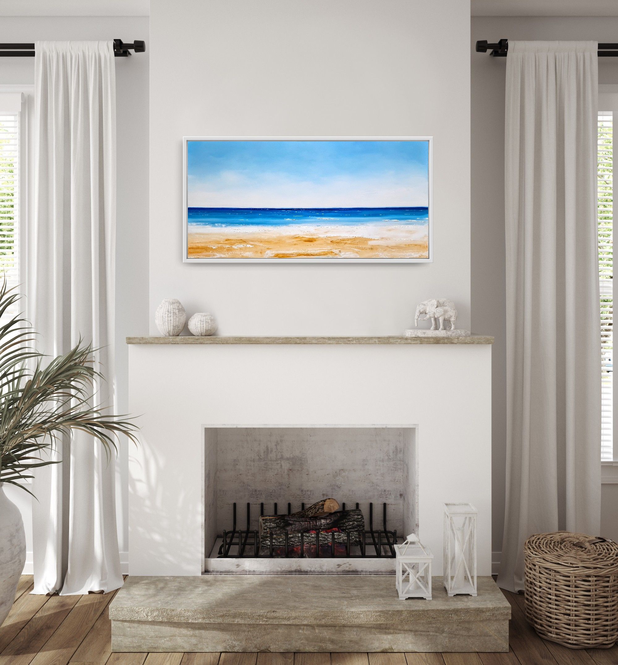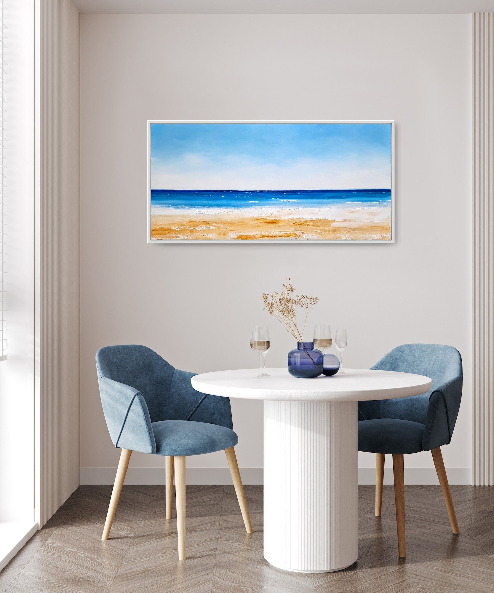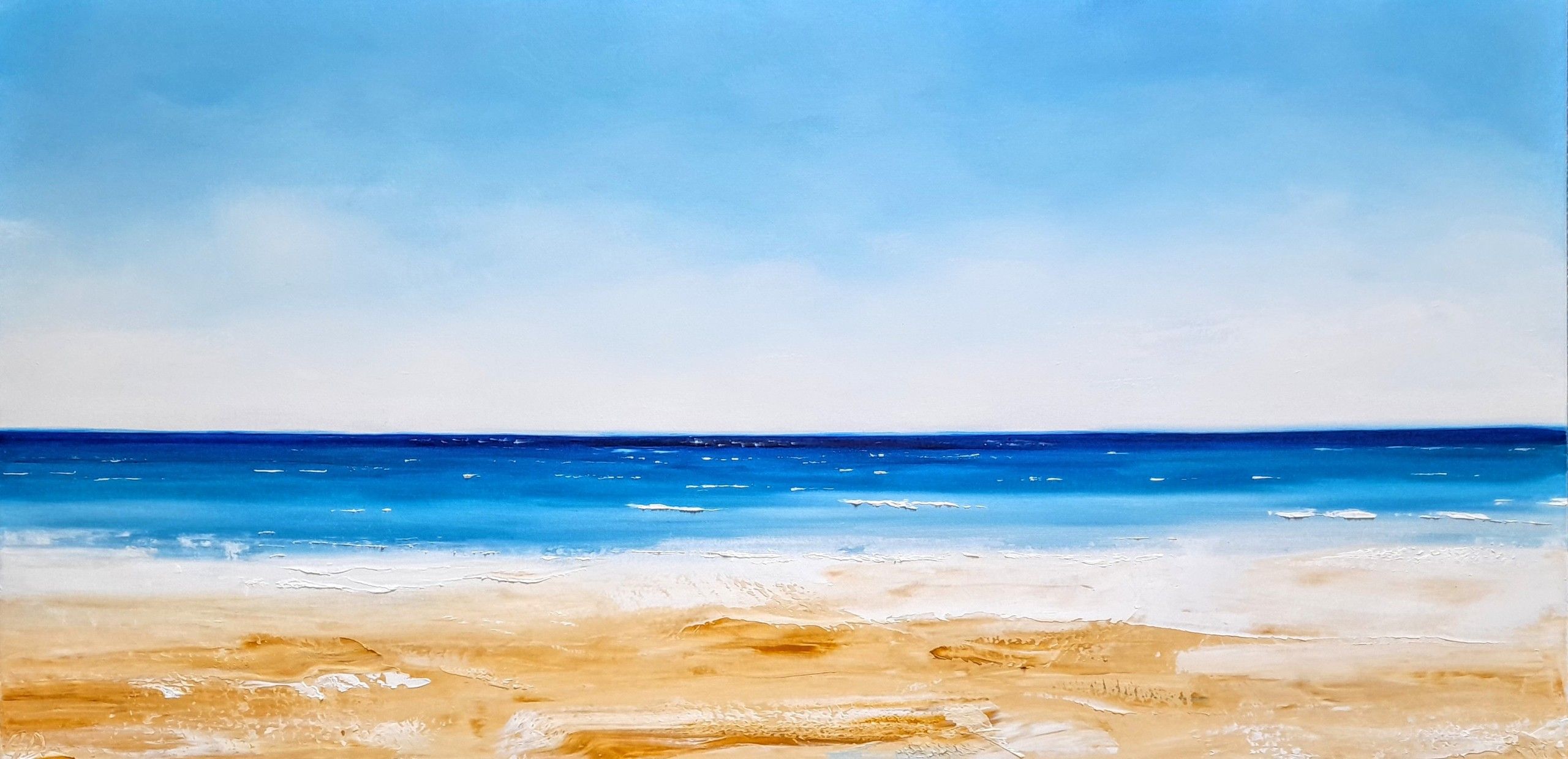 An original oil painting by Georgie Dowling on fine cotton canvas portraying a beautiful summers day on the beach. The distant sea sparkles under the bright sky of the day while gentle waves make their way through the sea and over the sand into the foreground. The vivid blues and