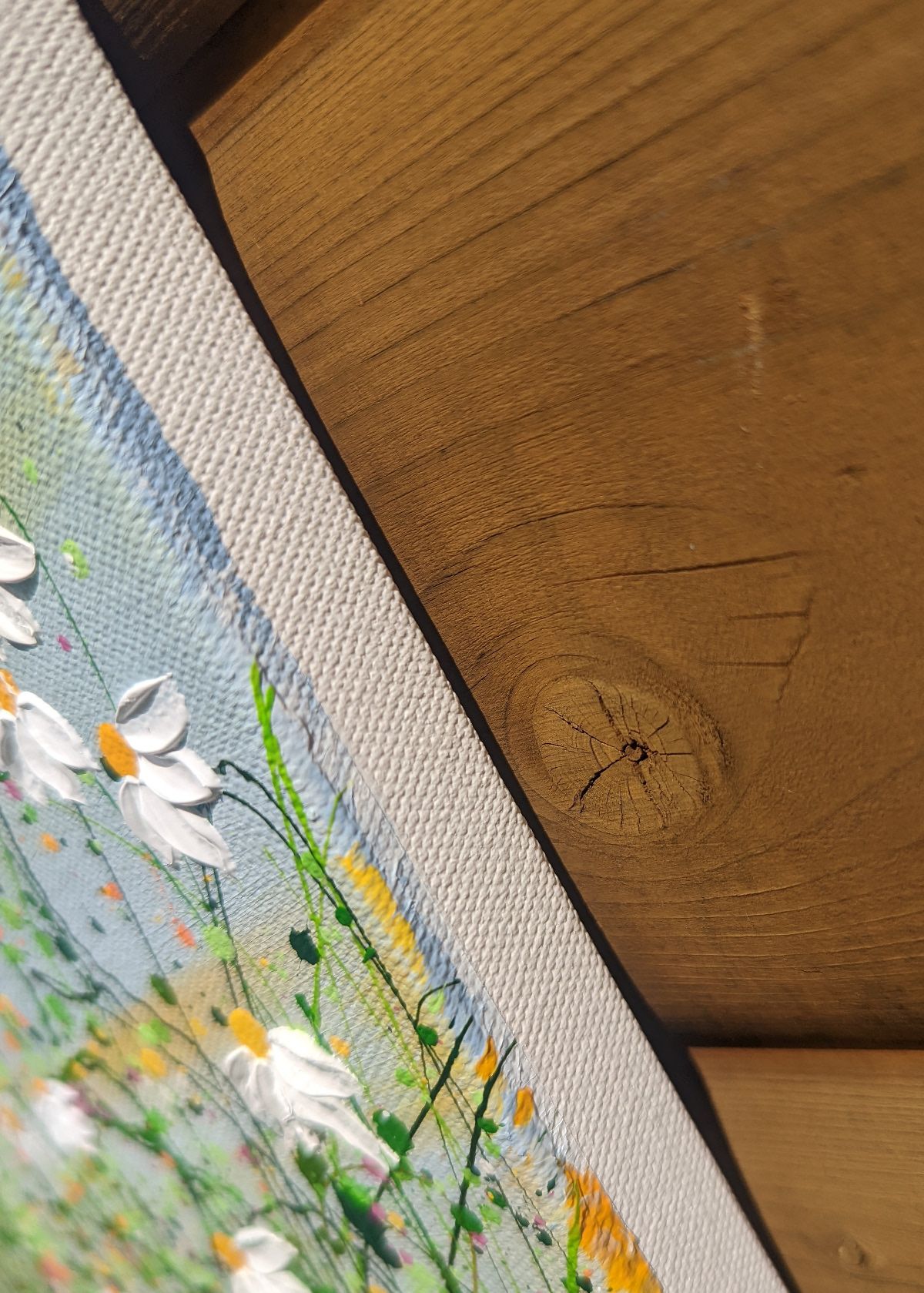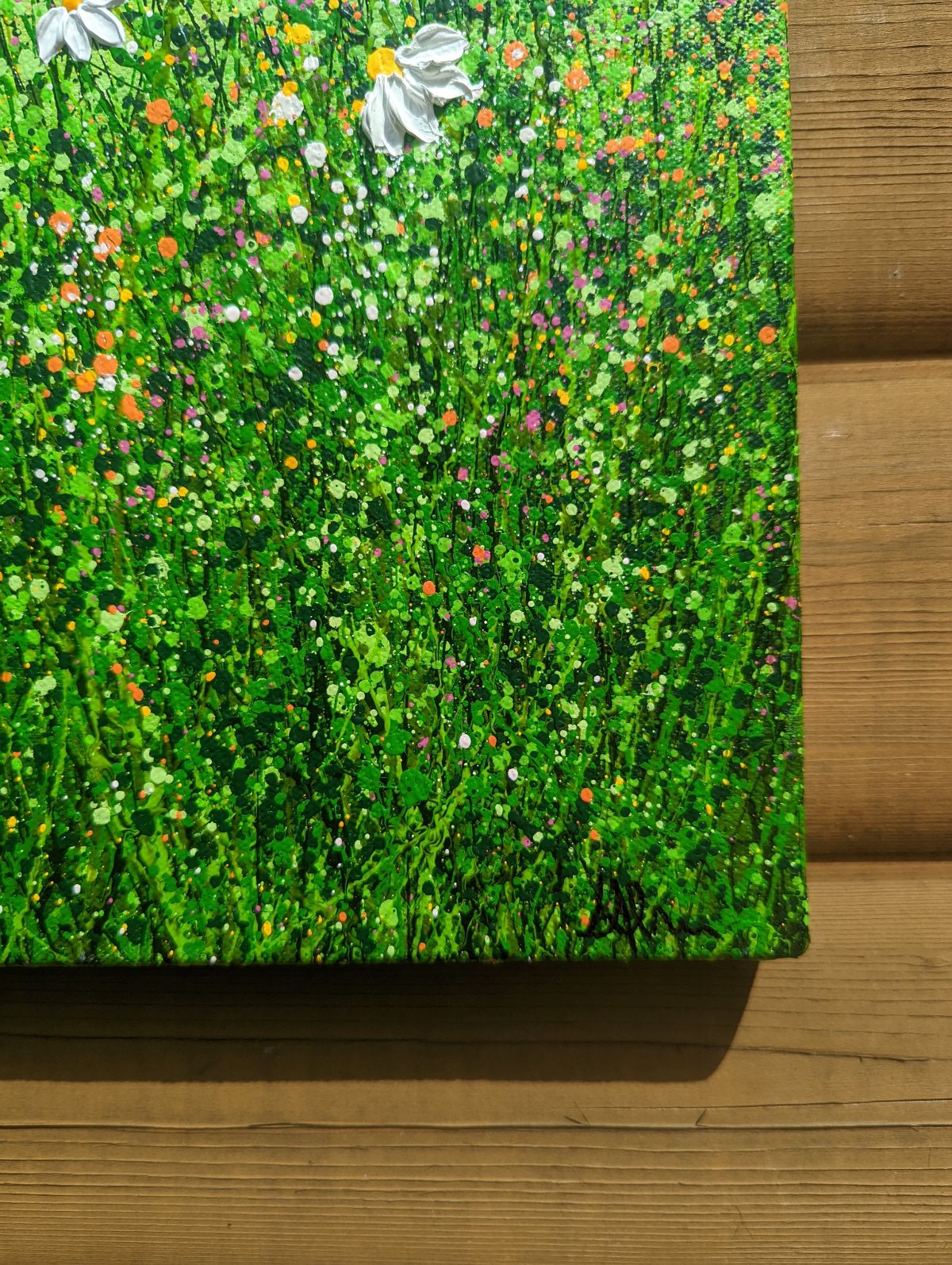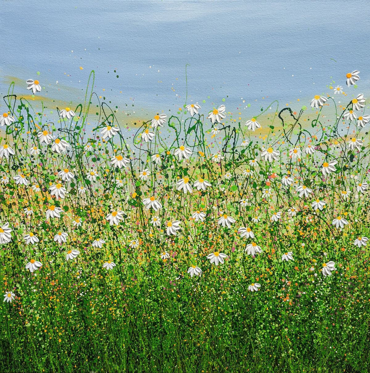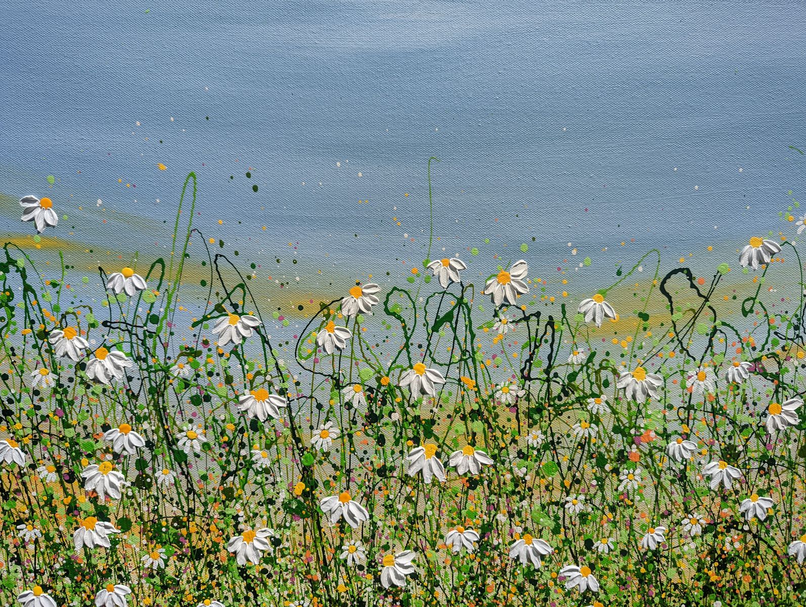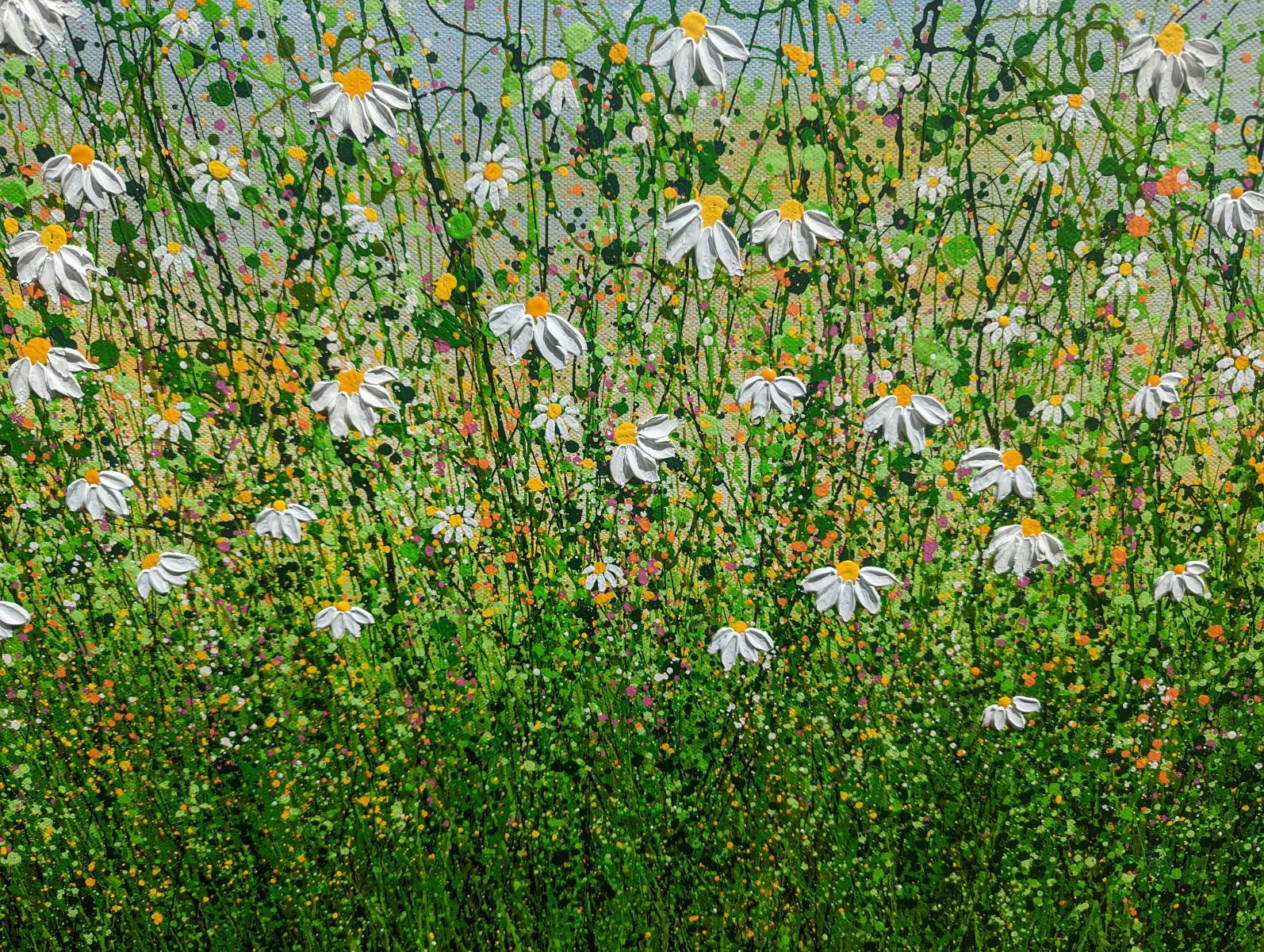 An Original semi-abstract painting by Lucy Moore, Using texture I have created this Daisy meadow popping with vibrancy. I used heavy acrylic to sculpt the daisies. I love painting abstract landscapes, using my techniques to put movement into the painting bringing it to life Wychwood Art comments " We