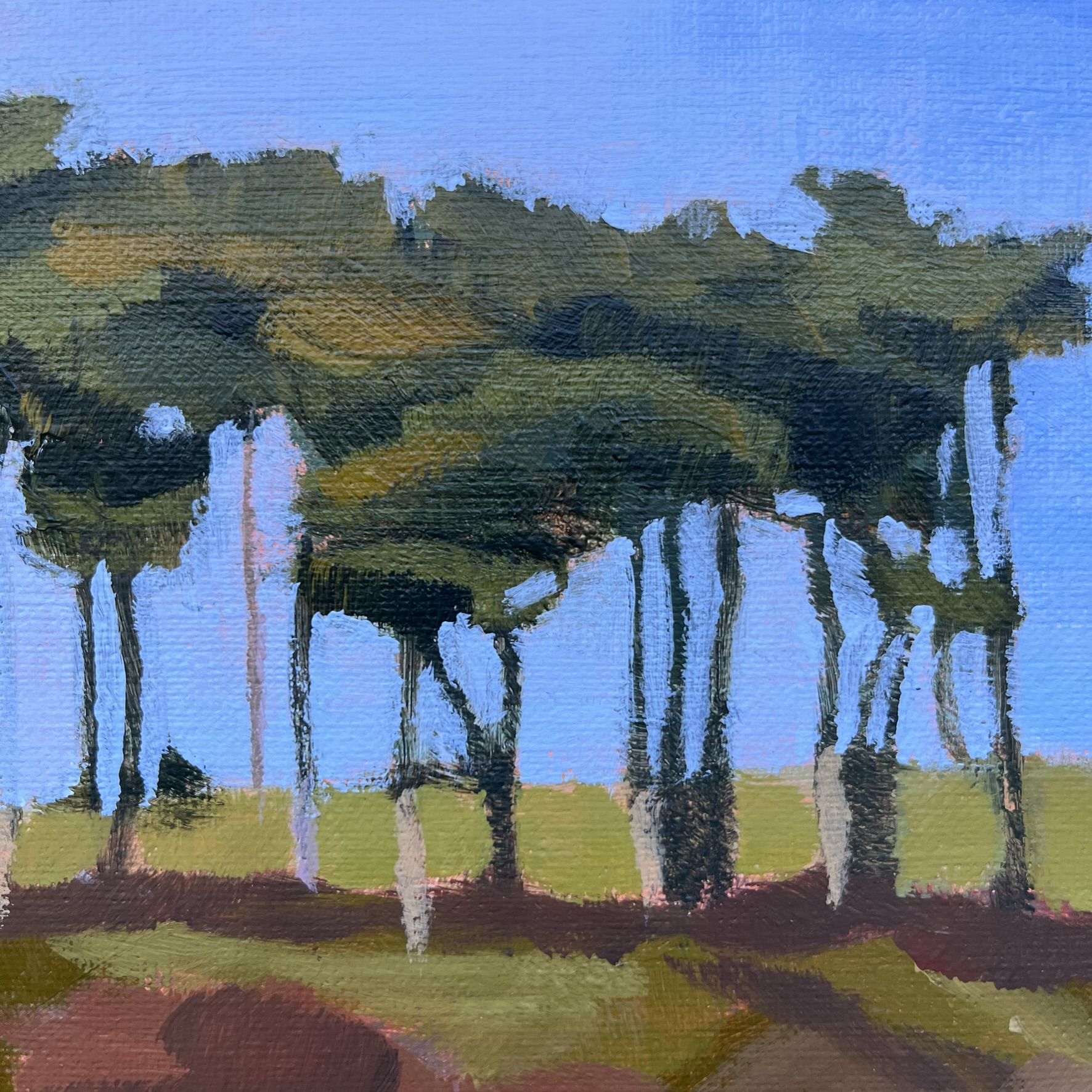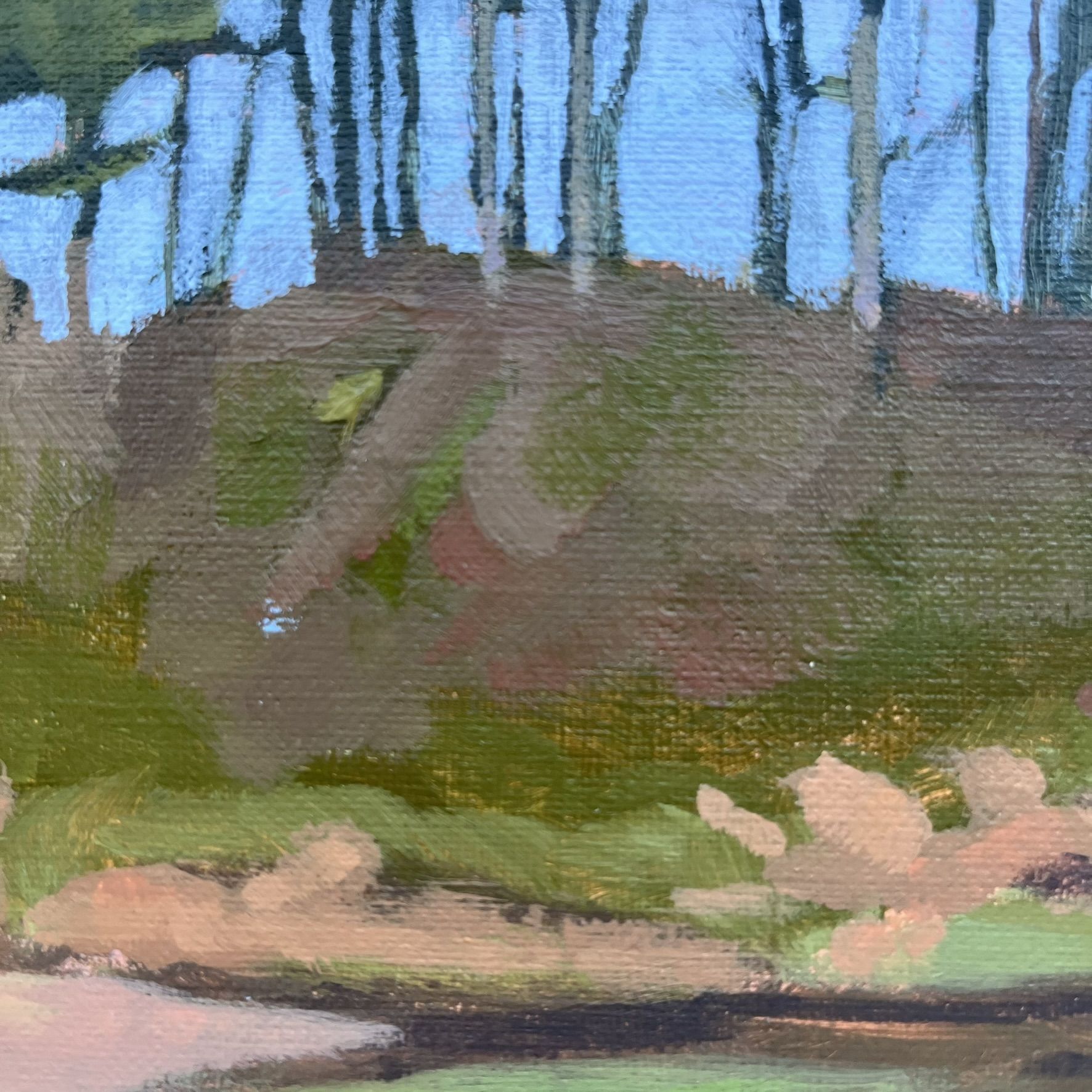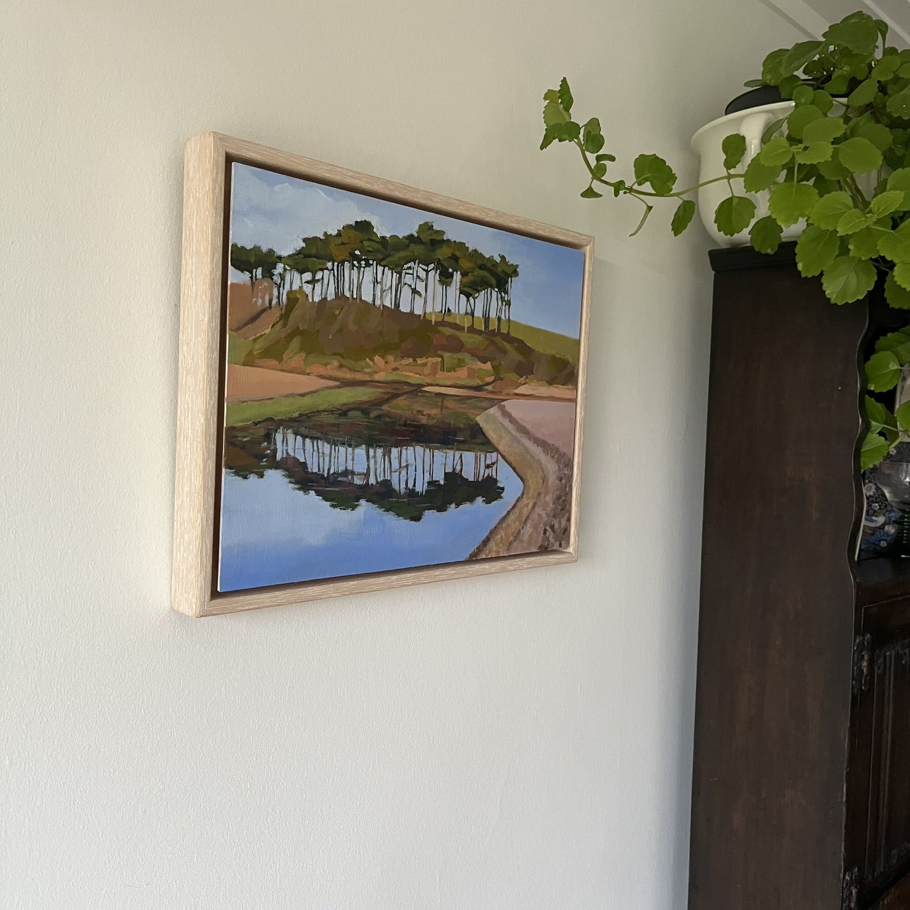 This is a view of the estuary of the River Otter as it winds its way to the sea at Budleigh Salterton, Devon. It is a clear, bright day. The reflections of the pines on the cliff are hardly moving in the calm water. The red Devon