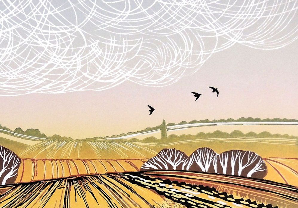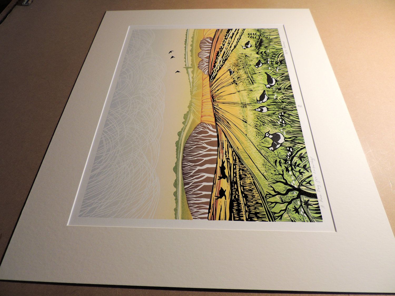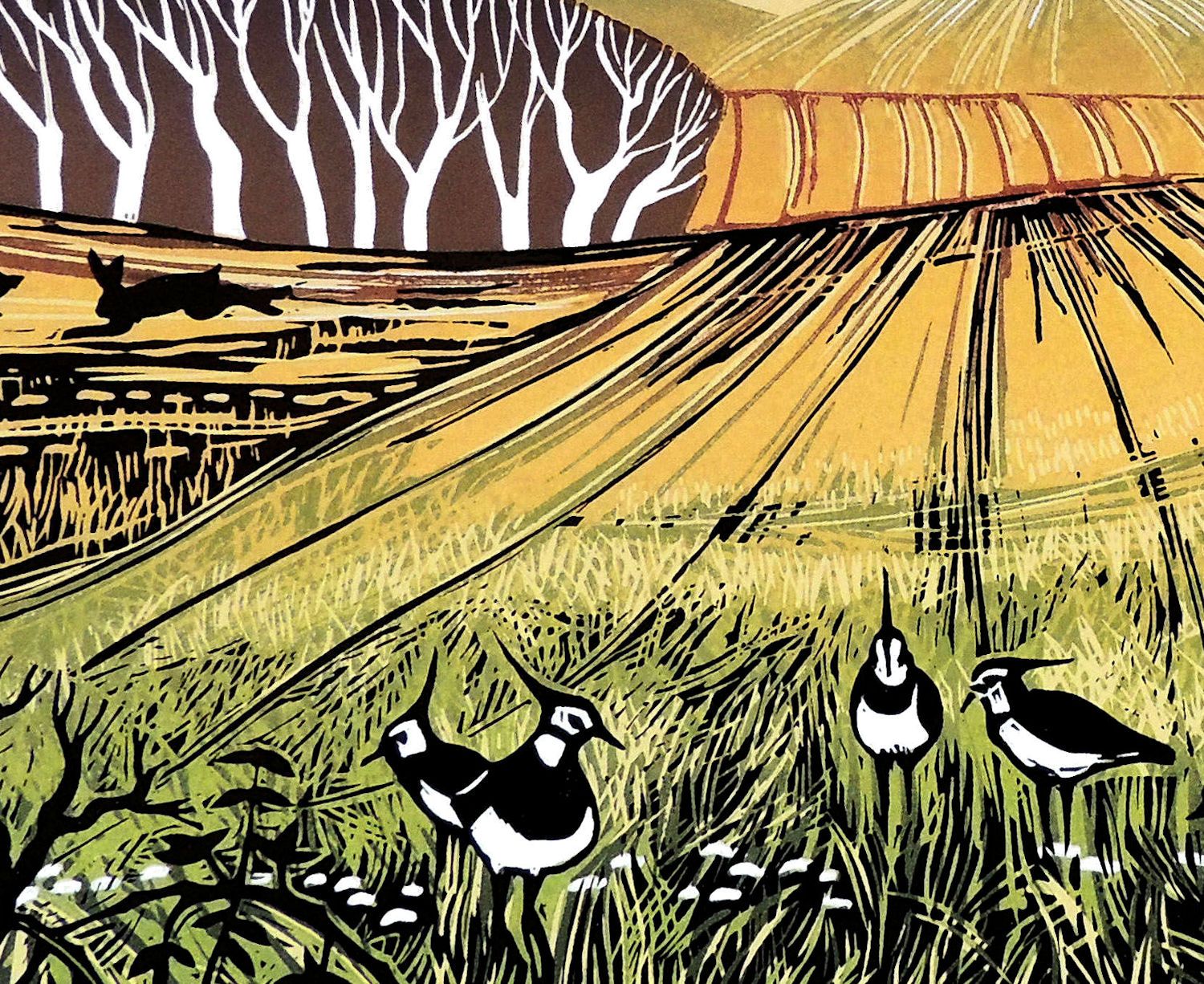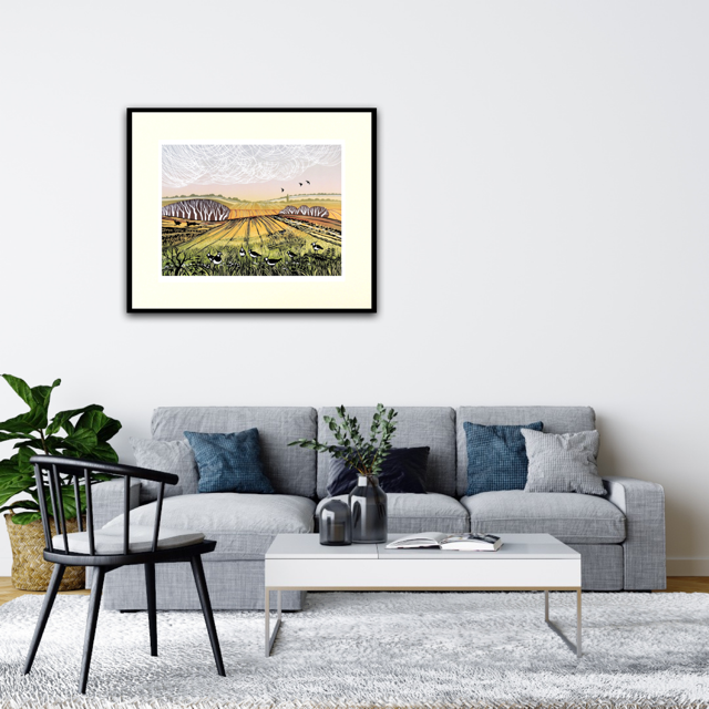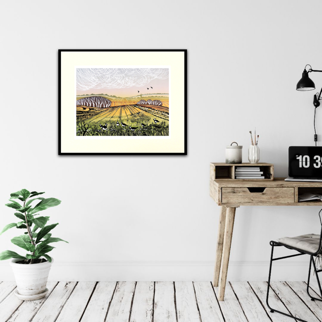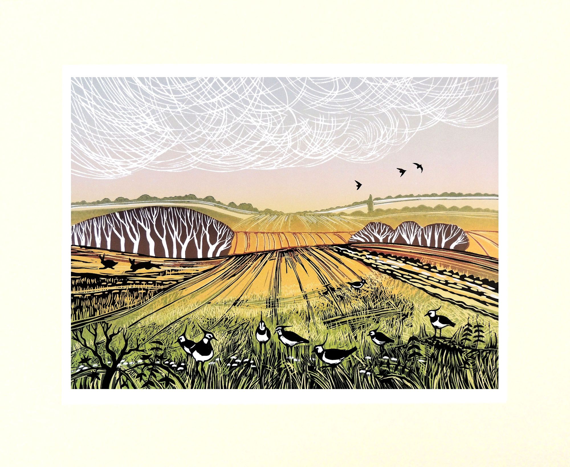 This linocut was inspired by seeing lapwings in the field opposite. My intention was to create a late summer end of day feel about the work.
