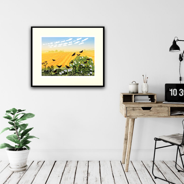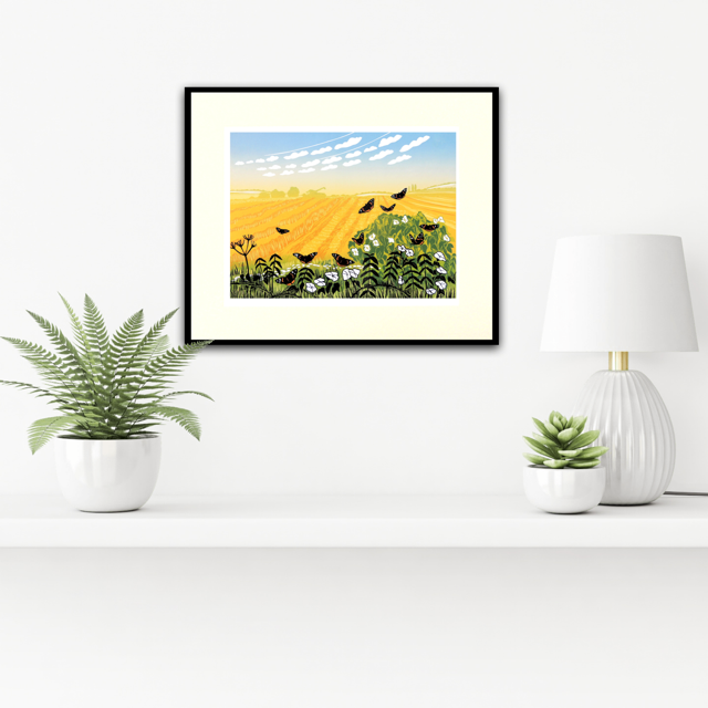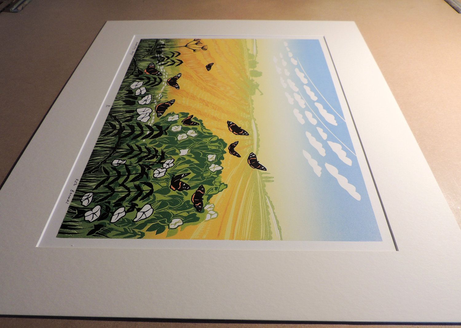 Butterfly Days by Rob Barnes in an edition of 50. I love this time of year when Red Admiral butterflies abound. They make such unique patterns as the land, fly further and return.