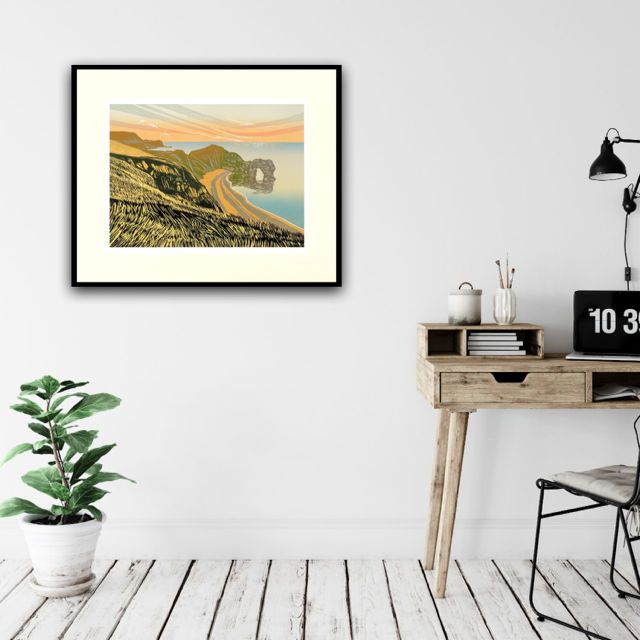 Rob Barnes Durdle Door Limited Edition Linocut Print Edition of 50 Image Size H 44cm x W 33cm Sheet Size H 49cm x W 61cm Sold Unframed mounted in Antique White mountboard Free Shipping Please note that in situ images are purely an indication of how a piece may look. Durdle Door by Rob Barnes is a limited edition