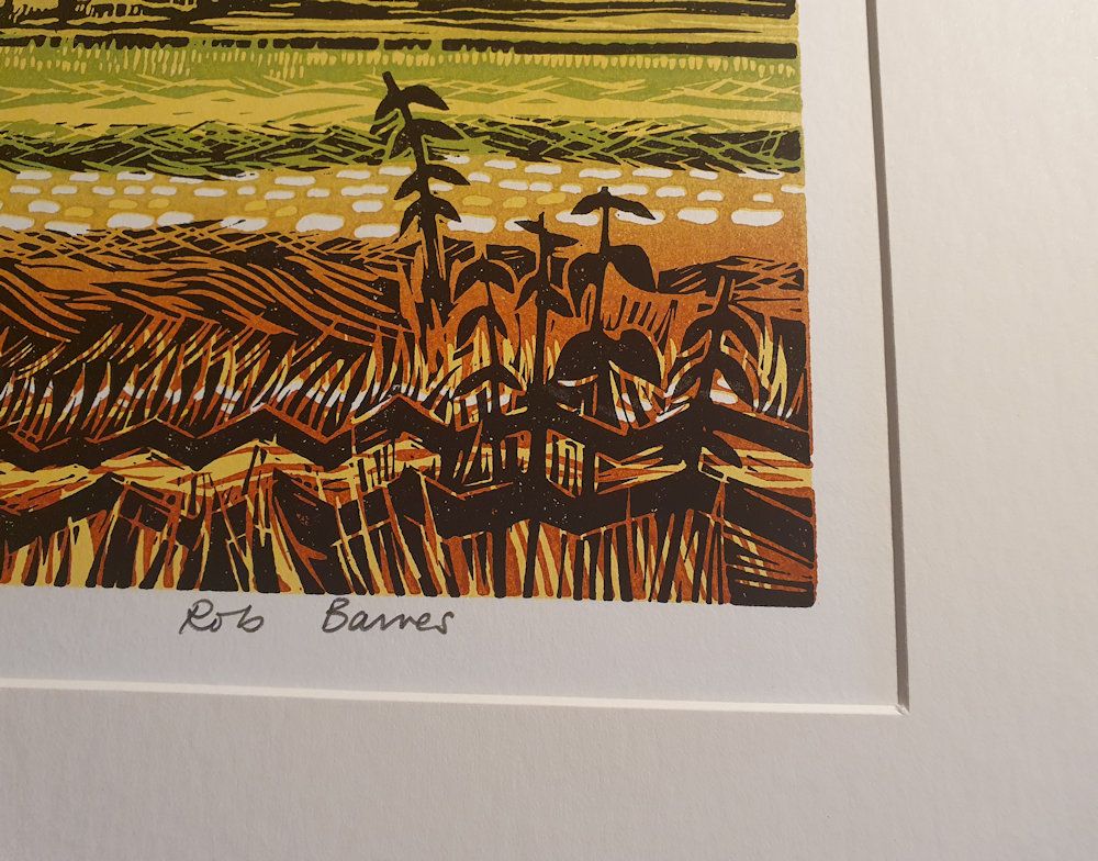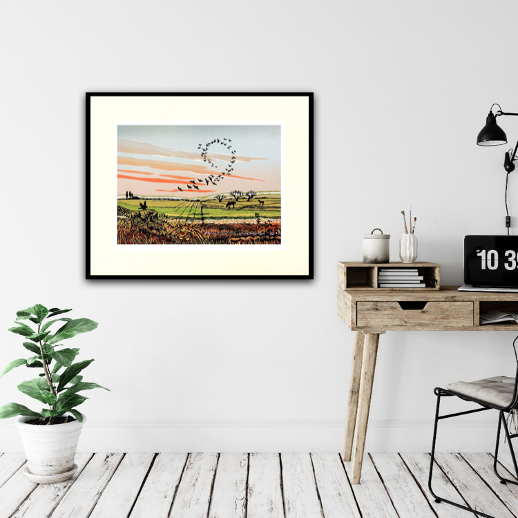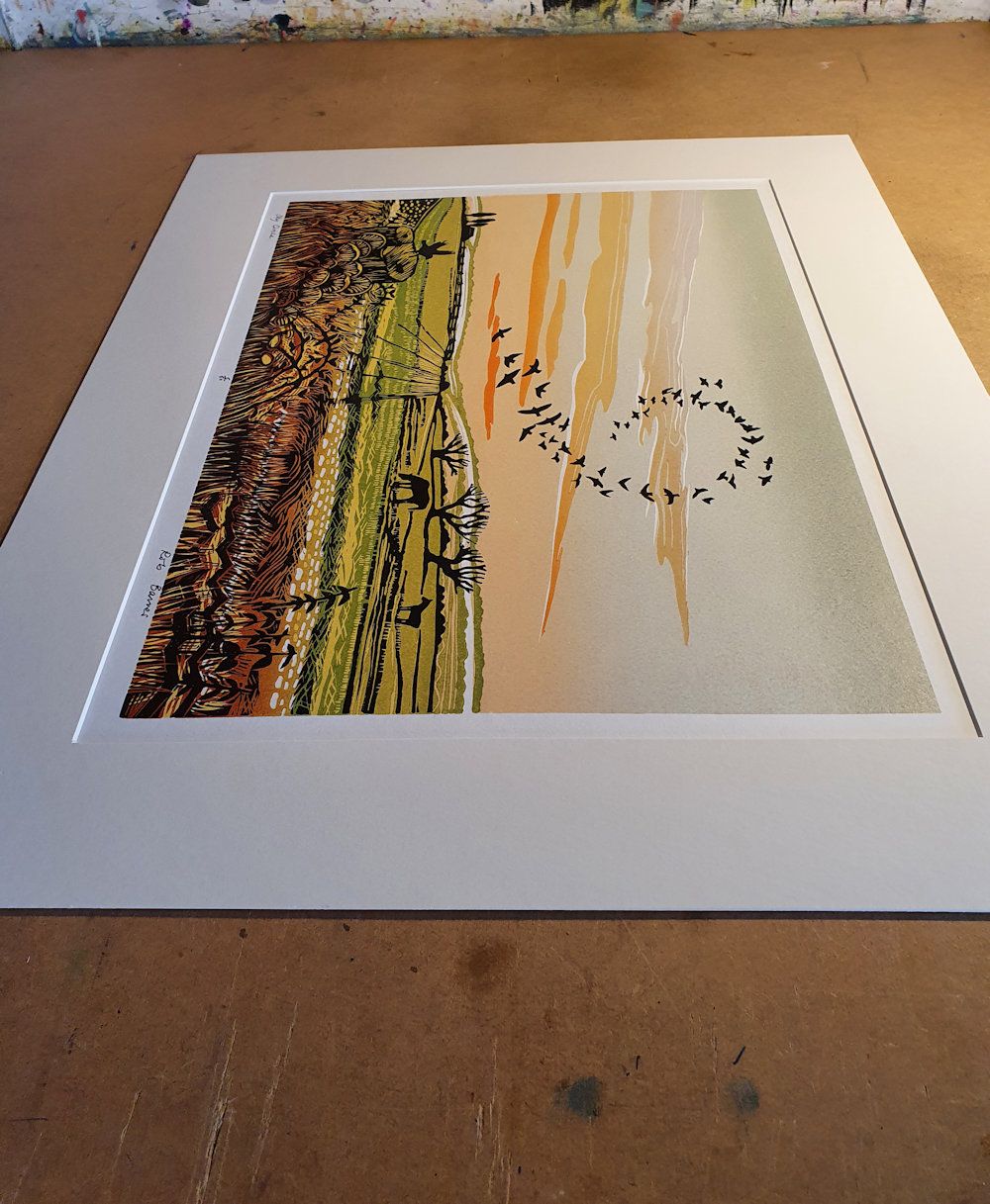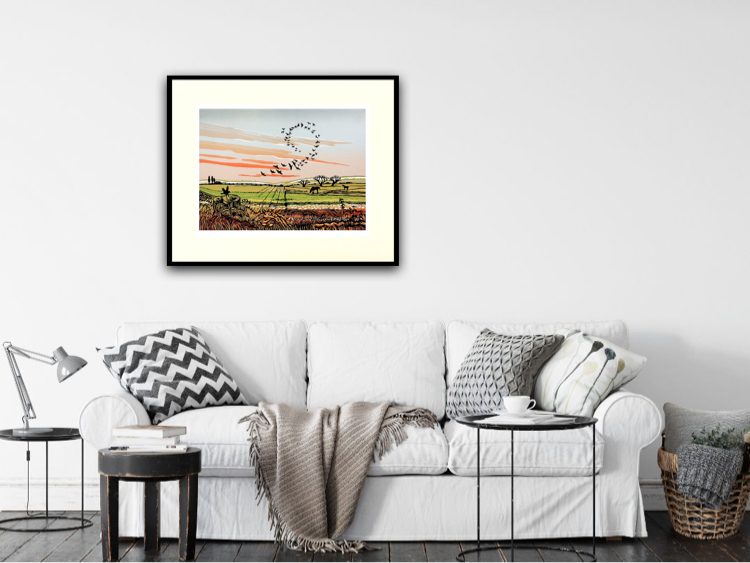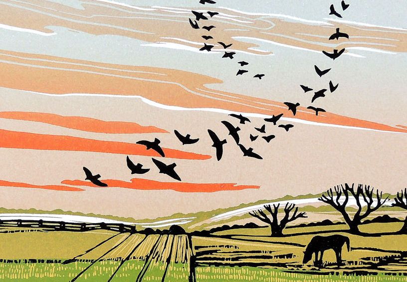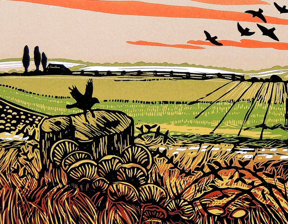 Sky Circle is a limited edition print by Rob Barnes. There is a great deal of movement in the local landscape and this has inspired moments such as this. Birds cross the sky forming patterns as they fly.The distant view also has a foreground of garden edge honeysuckle, a detail