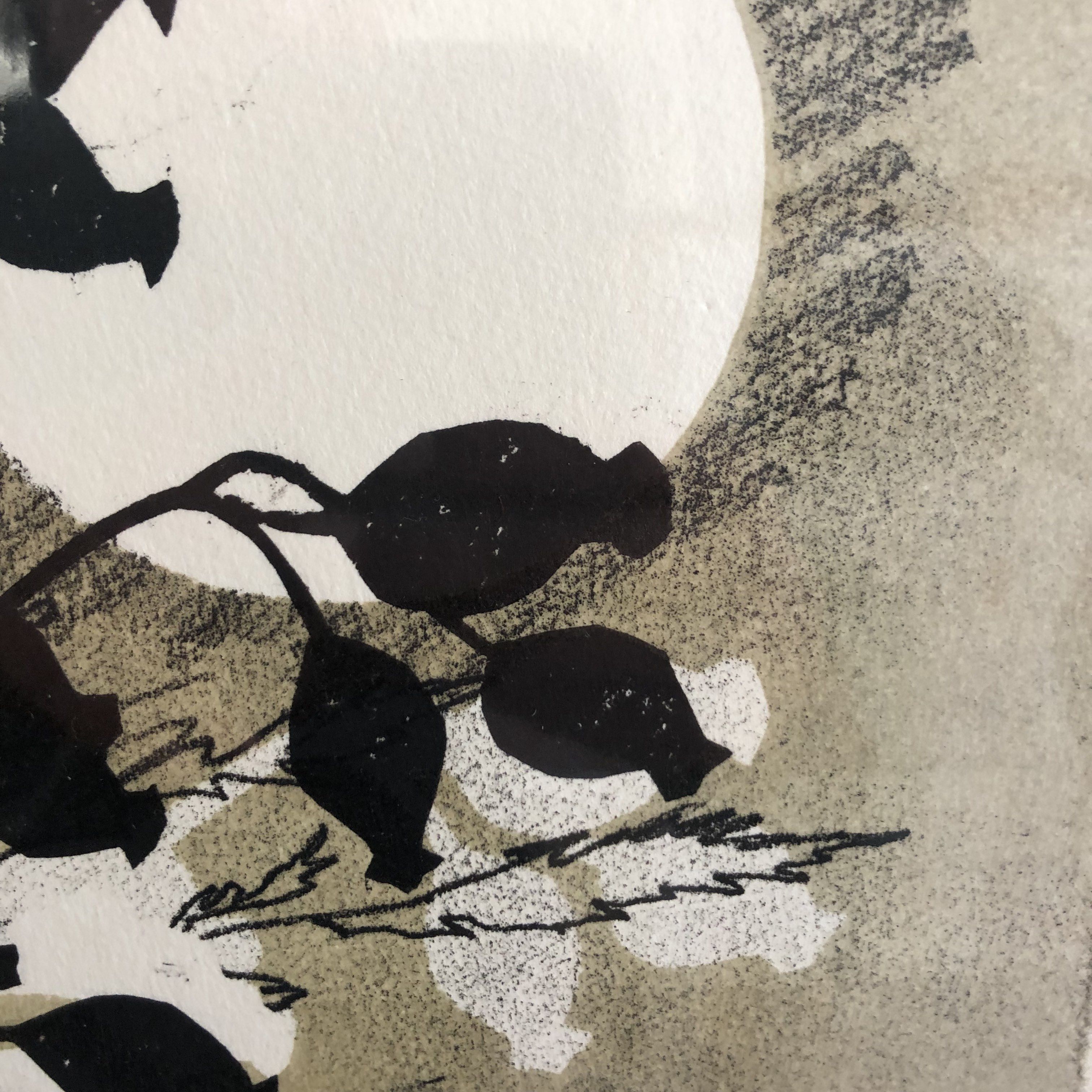 Rosemary Farrer Rosehips Unique Monoprint Image size: H:36cm x W:30cm Mount size: H:44.5cm x W:38cm Sold Unframed Free Shipping Rosehips is a unique still life monotype by Rosemary Farrer. Monotype is a method that it yields just 1 unique image. It is on acid free Hahnemulle rag paper. This is unframed. It is inspired by gleanings from