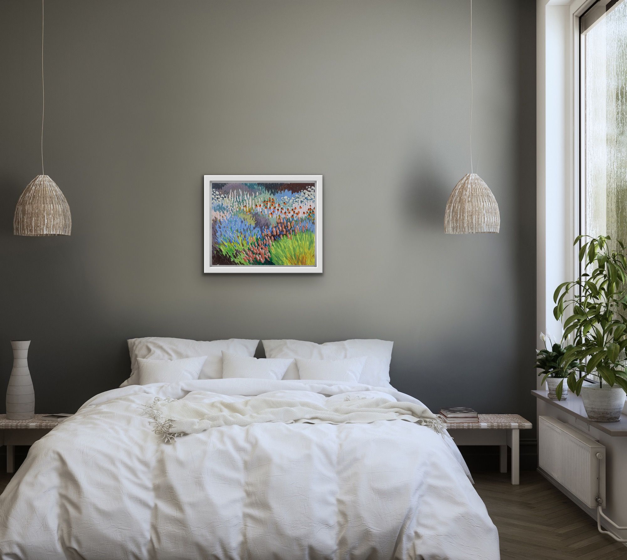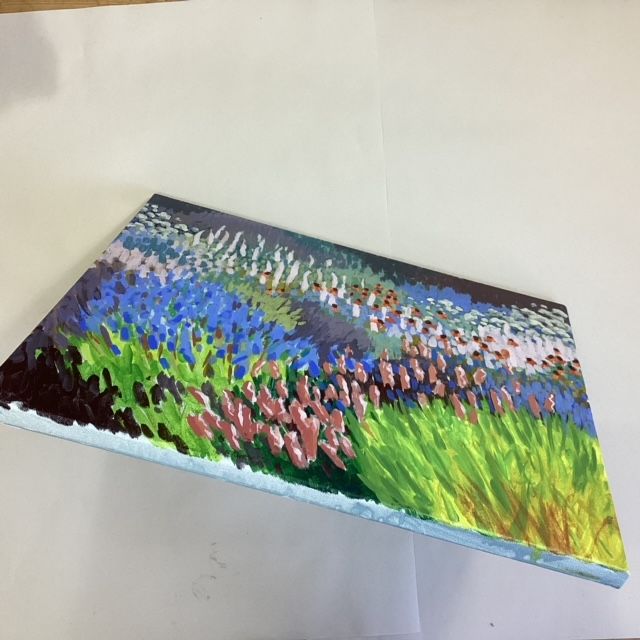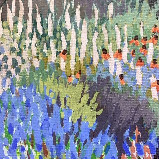 Pale spires and shots of vivid colour weave their way through this painting creating a feeling of abundant fullness. Painted in high summer it evokes the richness of that season.