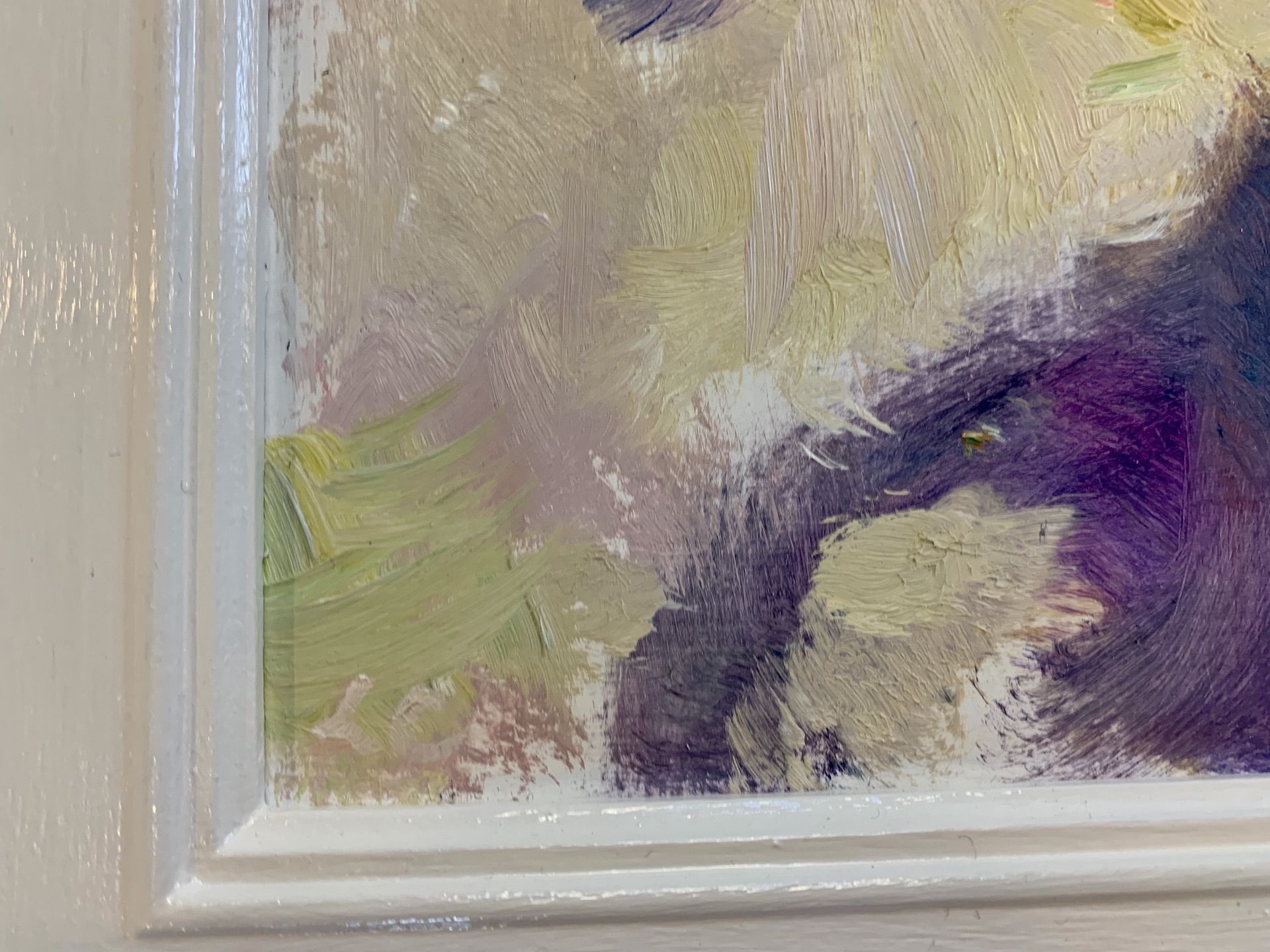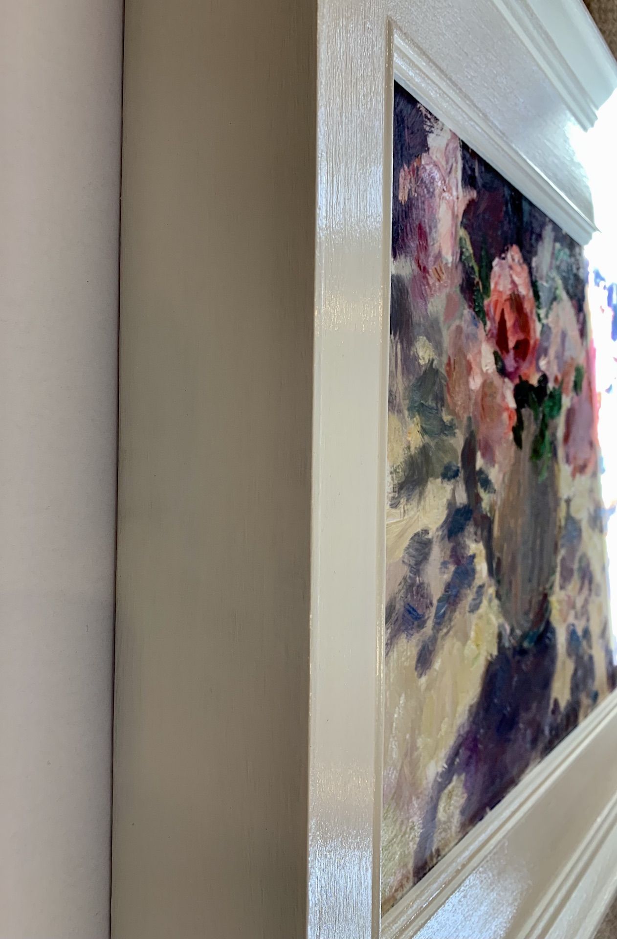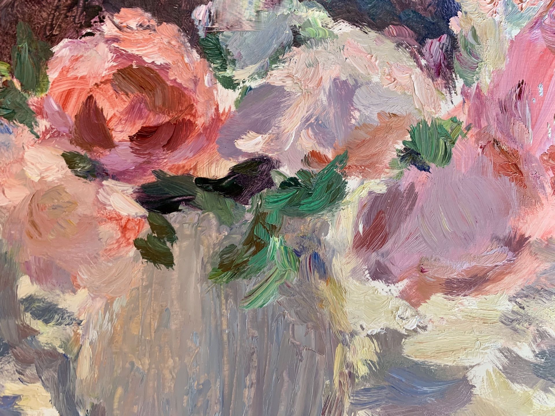 Roses In Dappled Sunlight is an original oil painting on board by Lynne Cartlidge of a bouquet of pink roses in a jug with sunlight shining from above and creating beautifully interesting shadows.