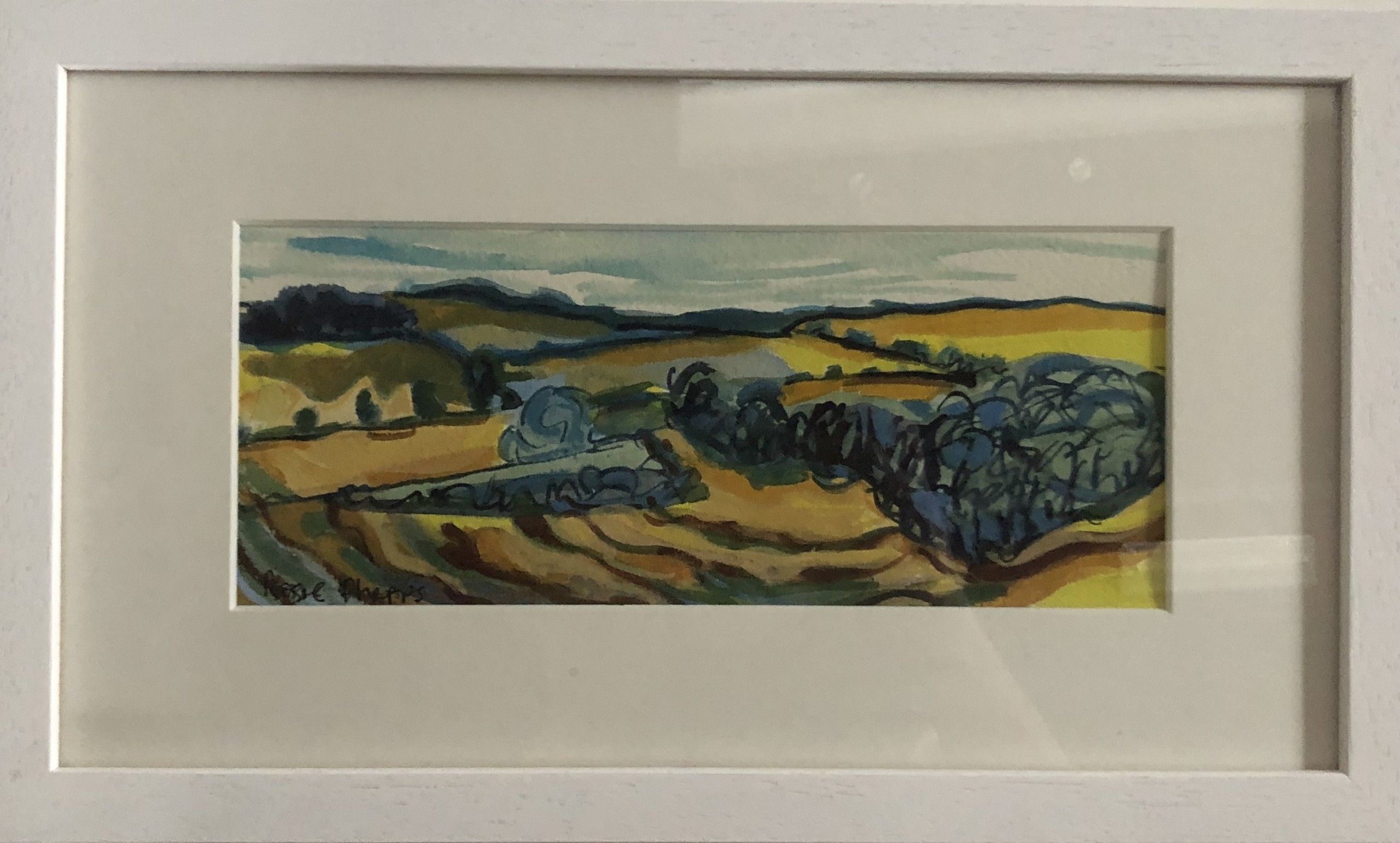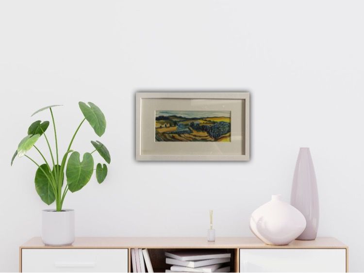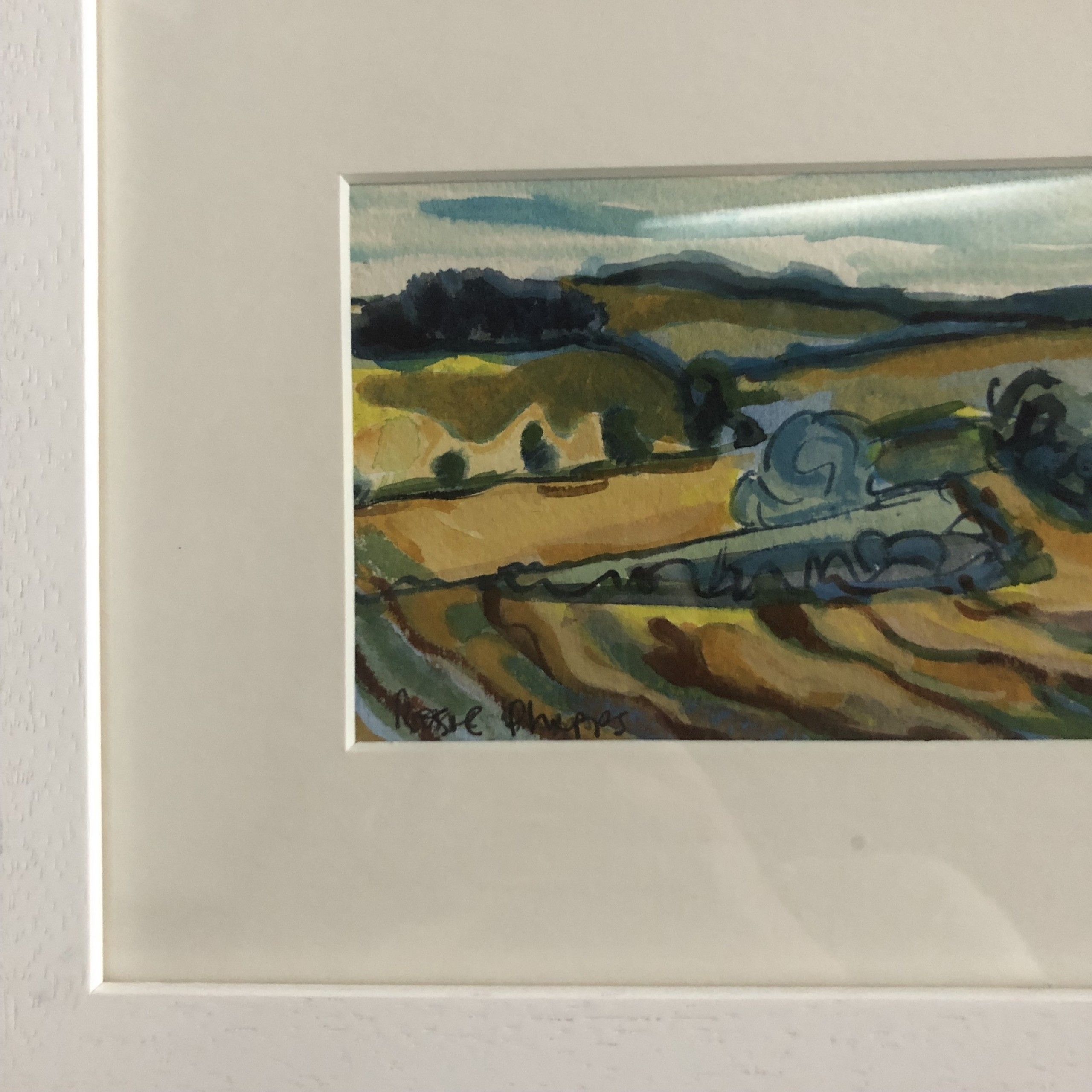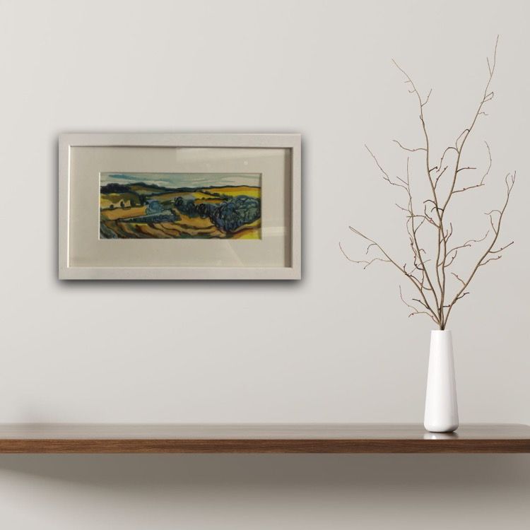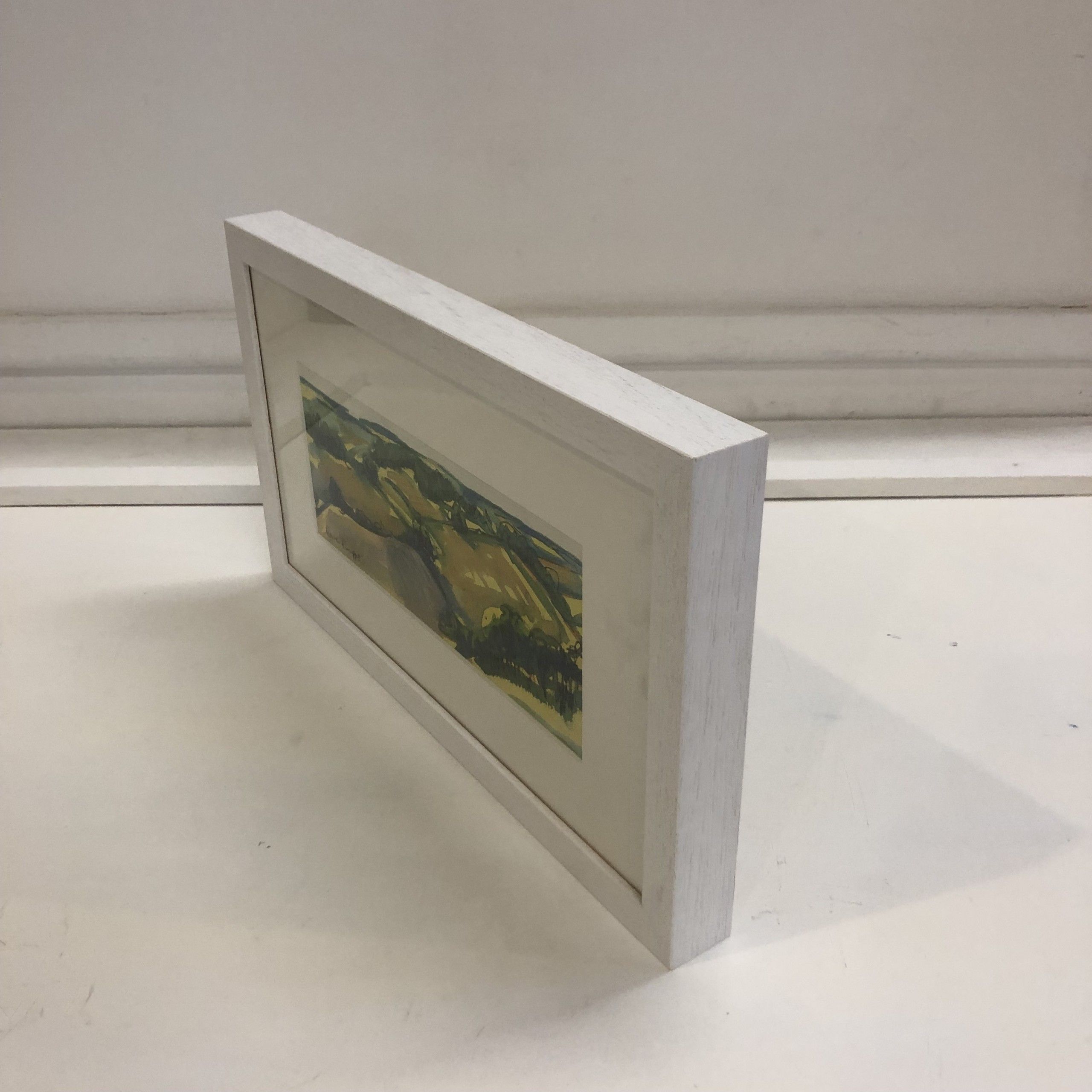 Rosie Phipps Green Fields Original Landscape Painting Water Colour Paint, Gouache and Pastel on Paper Image Size: H 10cm x W 25cm Mounted Size: H 18.5cm x W 34.5cm Framed Size: H 23cm x W 40cm x D 3.5cm Sold Framed in a White Wood Grain Frame Green Fields is an original impressionist landscape painting by Rosie Phipps. The