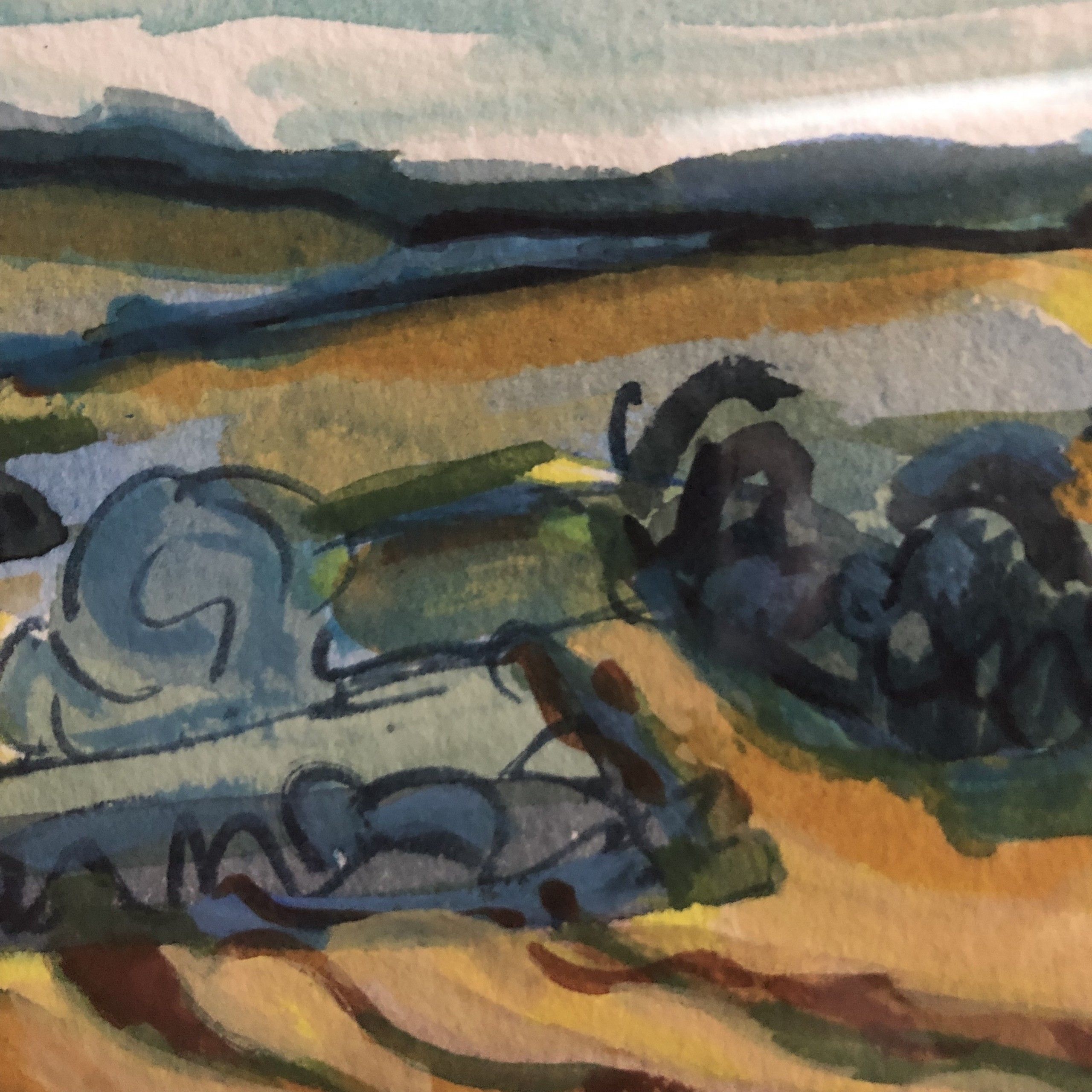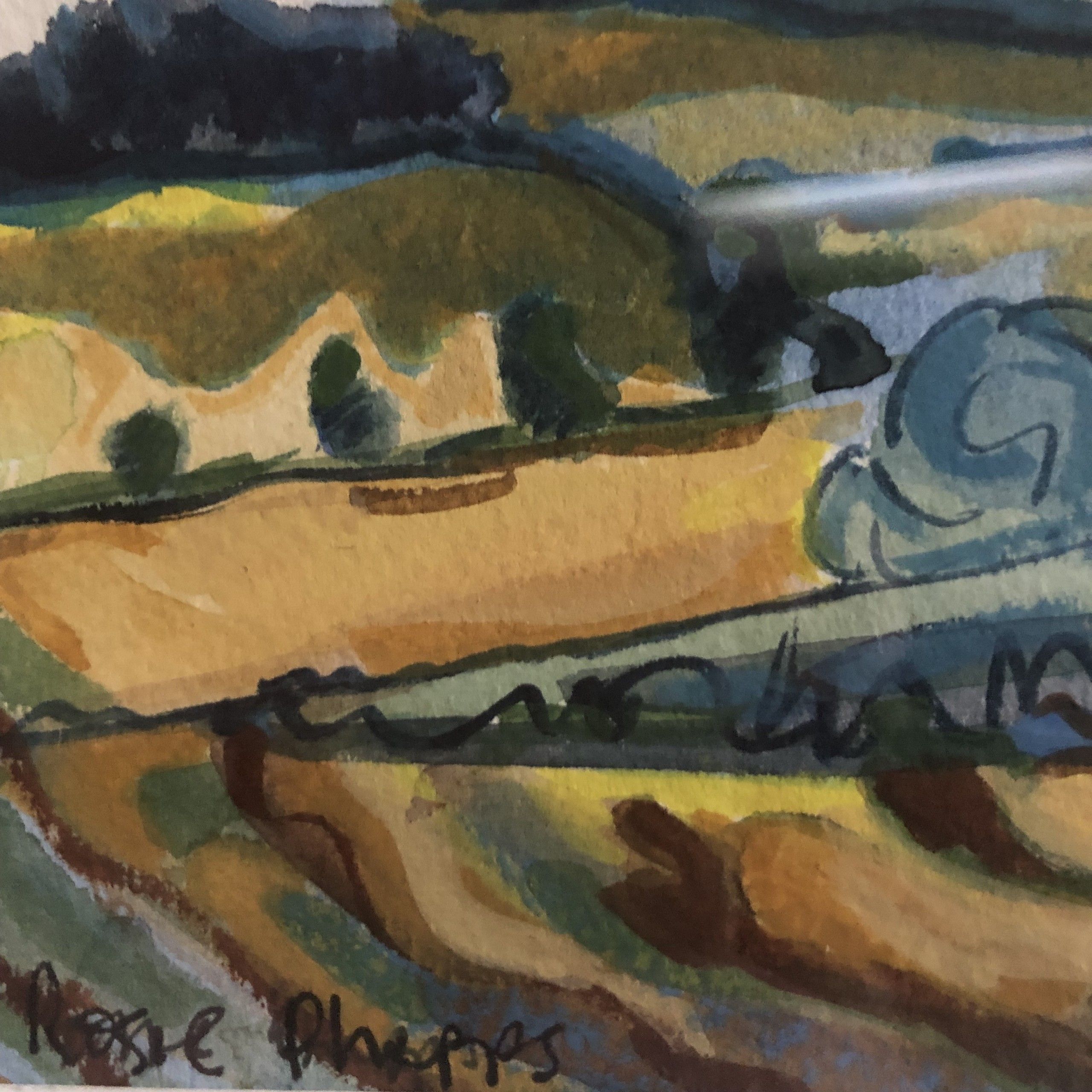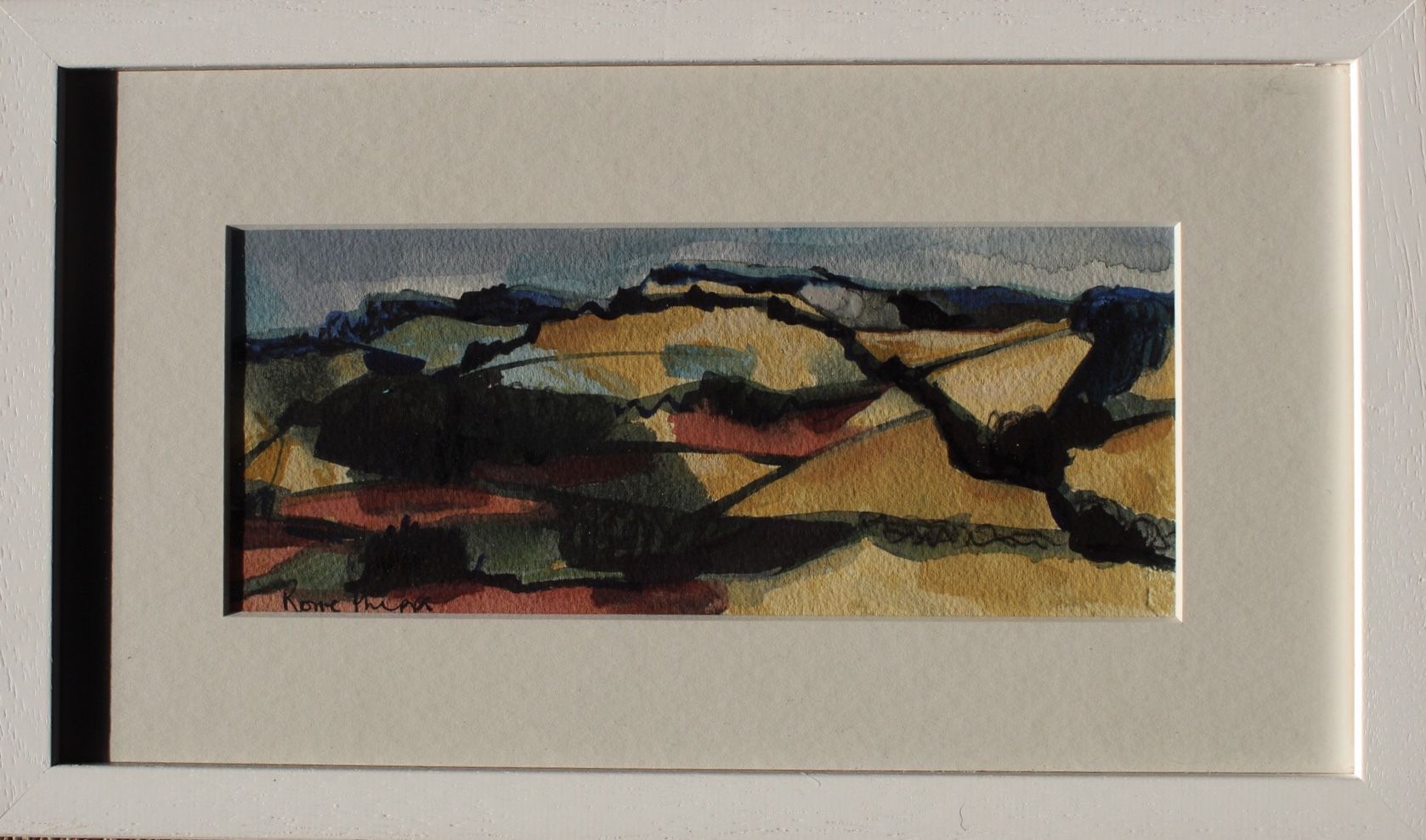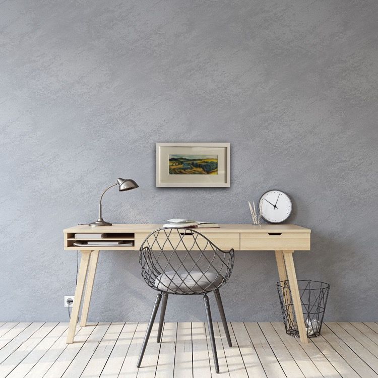 Rosie Phipps Green Fields Original Landscape Painting Water Colour Paint, Gouache and Pastel on Paper Image Size: H 10cm x W 25cm Mounted Size: H 18.5cm x W 34.5cm Framed Size: H 23cm x W 40cm x D 3.5cm Sold Framed in a White Wood Grain Frame Green Fields is an original impressionist landscape painting by Rosie Phipps. The