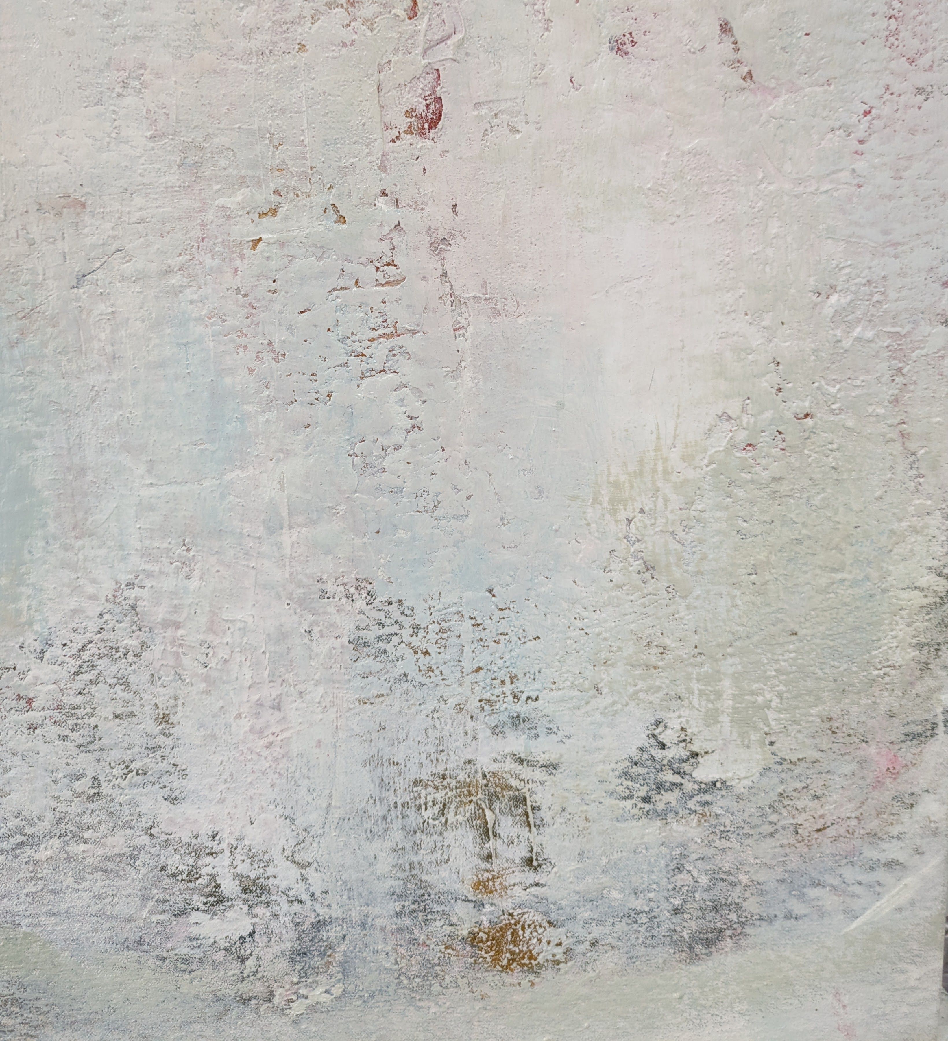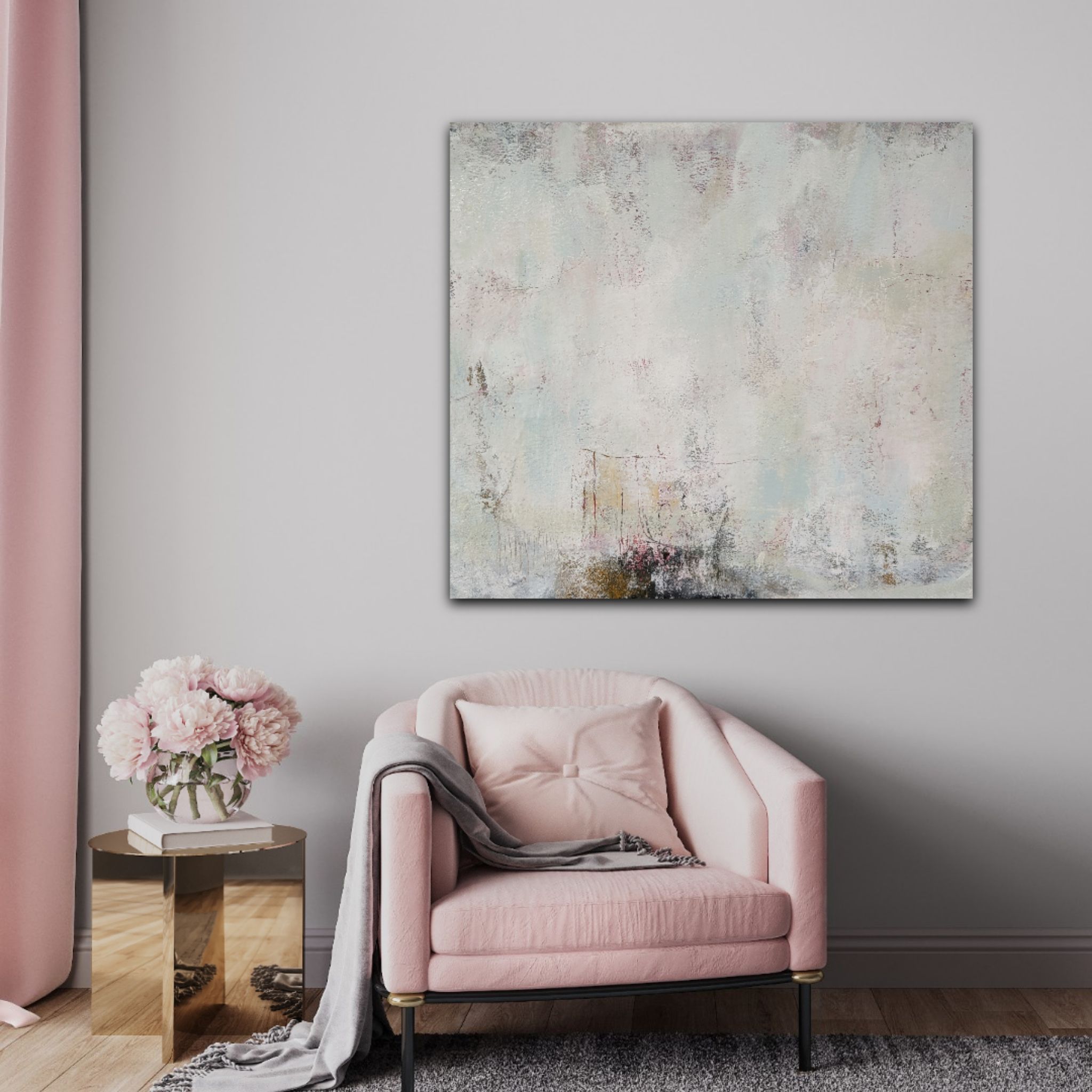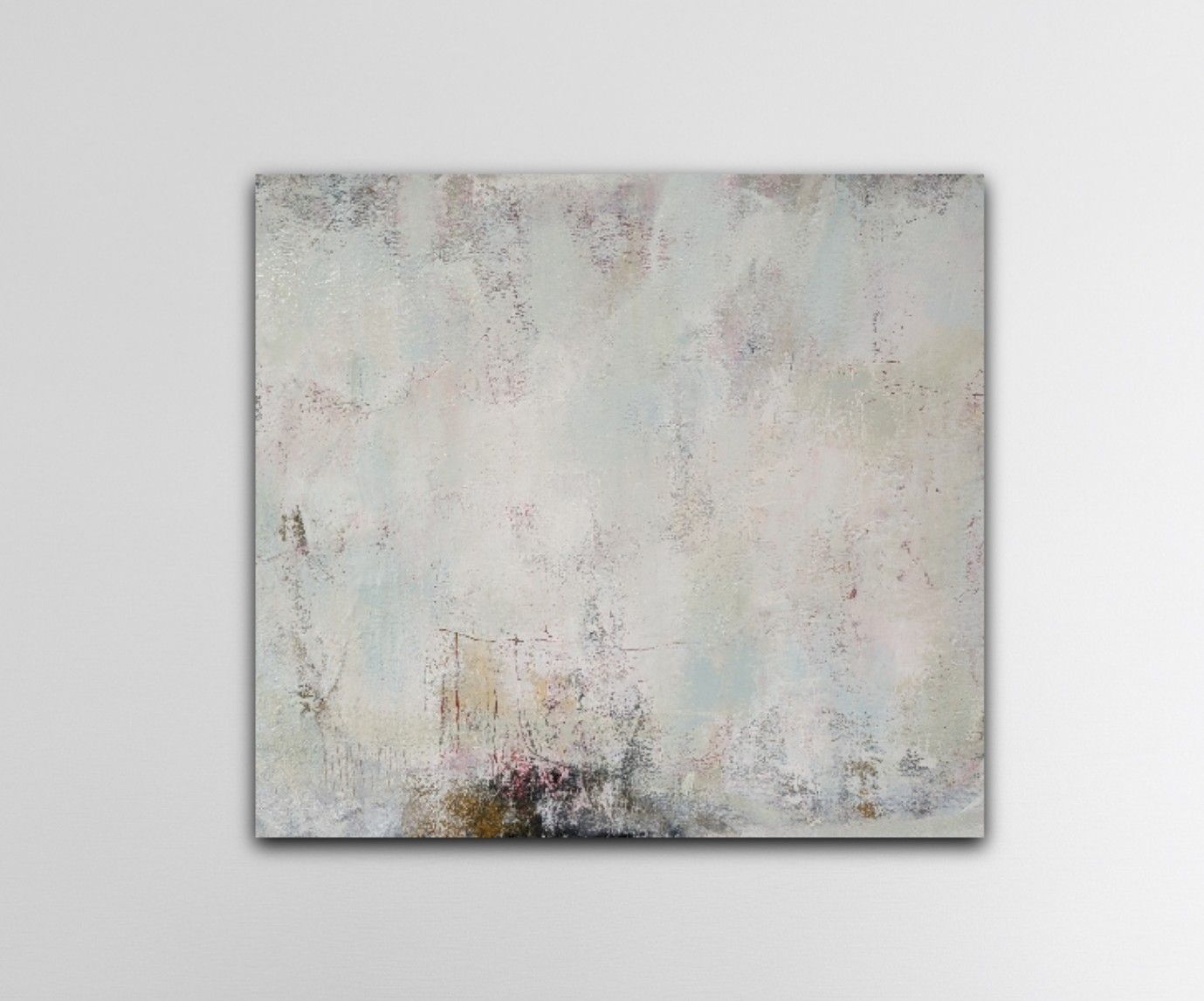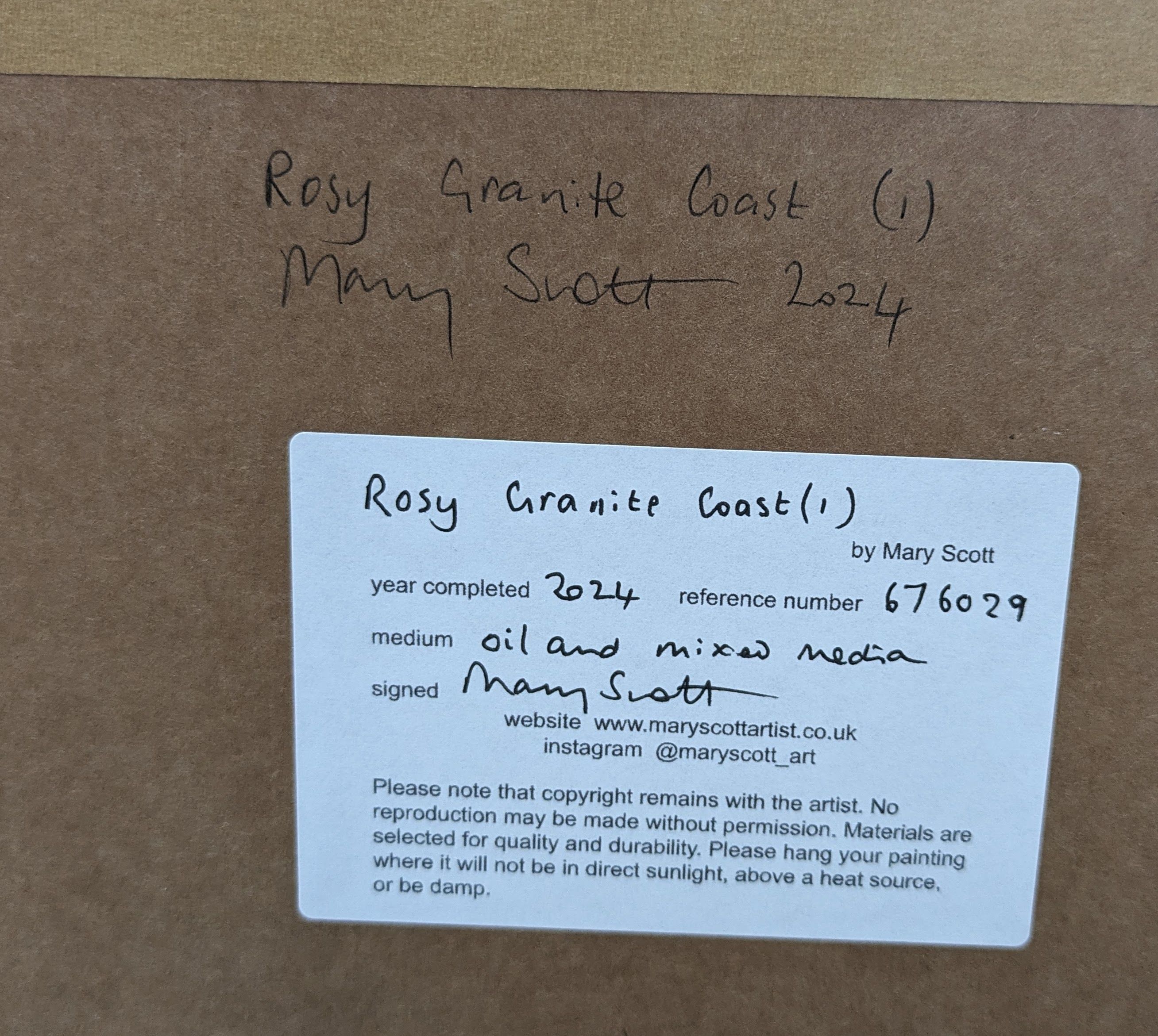Rosy Granite Coast (I) is an original abstract landscape painting by Mary Scott. This is the first work in a series of four large abstract interpretations of the granite rocks of West Cornwall near Land's End. Created in oil paint mixed with pigment, cold wax and rock powder to give it