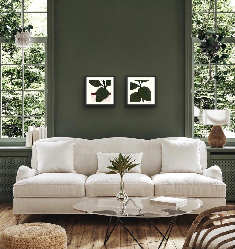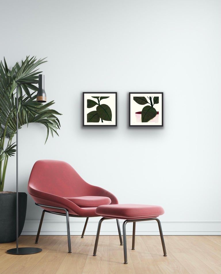 Rubber Plant II and Rubber Plant III diptych Overall sheet size: H86 x W84 Rubber Plant II by Kerry Day [2017] limited_edition Linocut Print Edition number 10 Image size: H:30.5 cm x W:30.4 cm Complete Size of Unframed Work: H:43 cm x W:42 cm x D:0.1cm Sold Unframed 'Rubber Plant II' by Kerry Day is a multi layered reduction