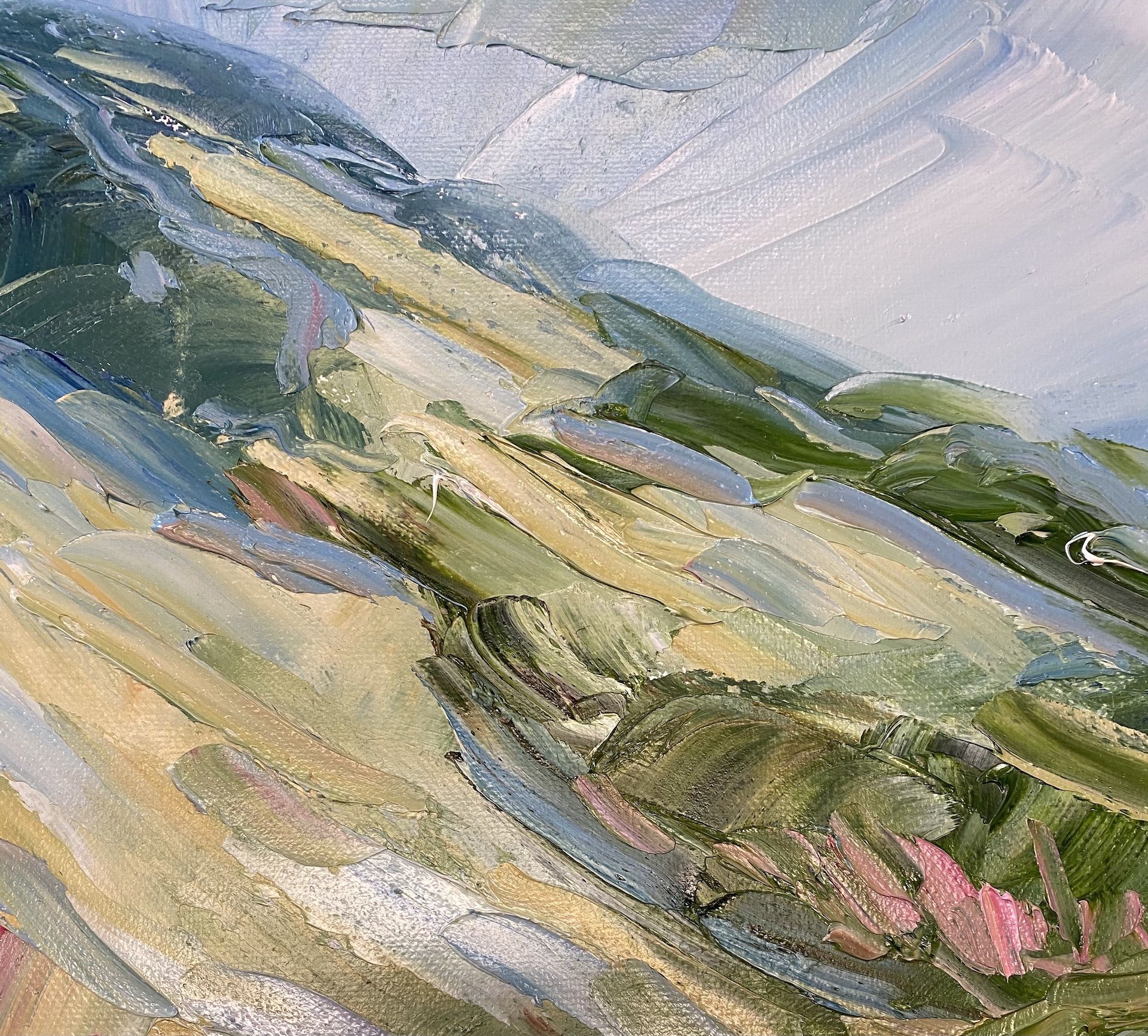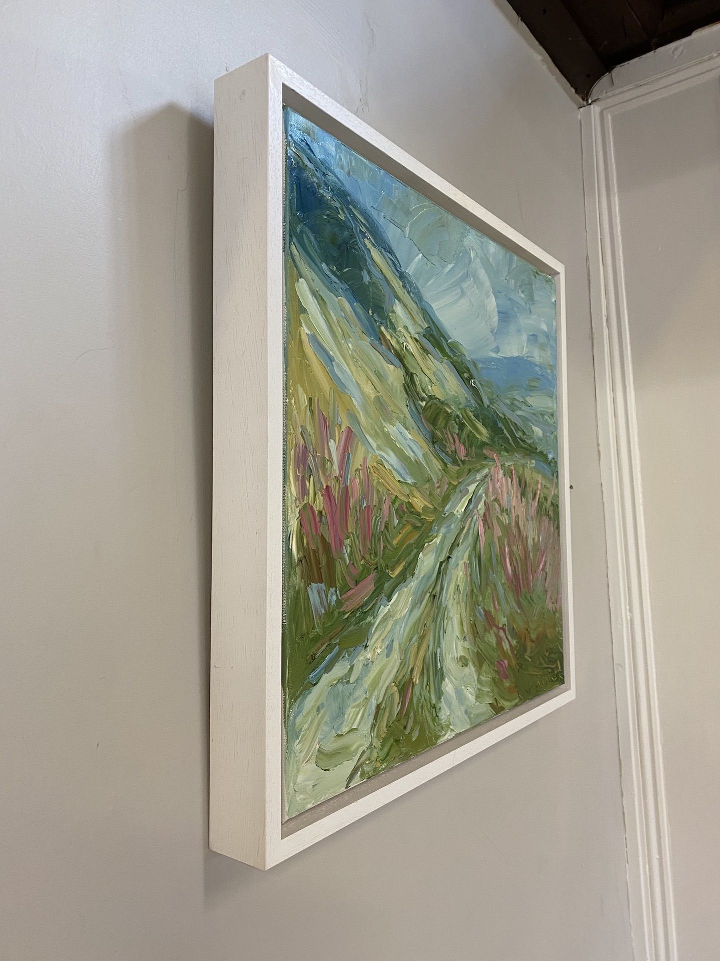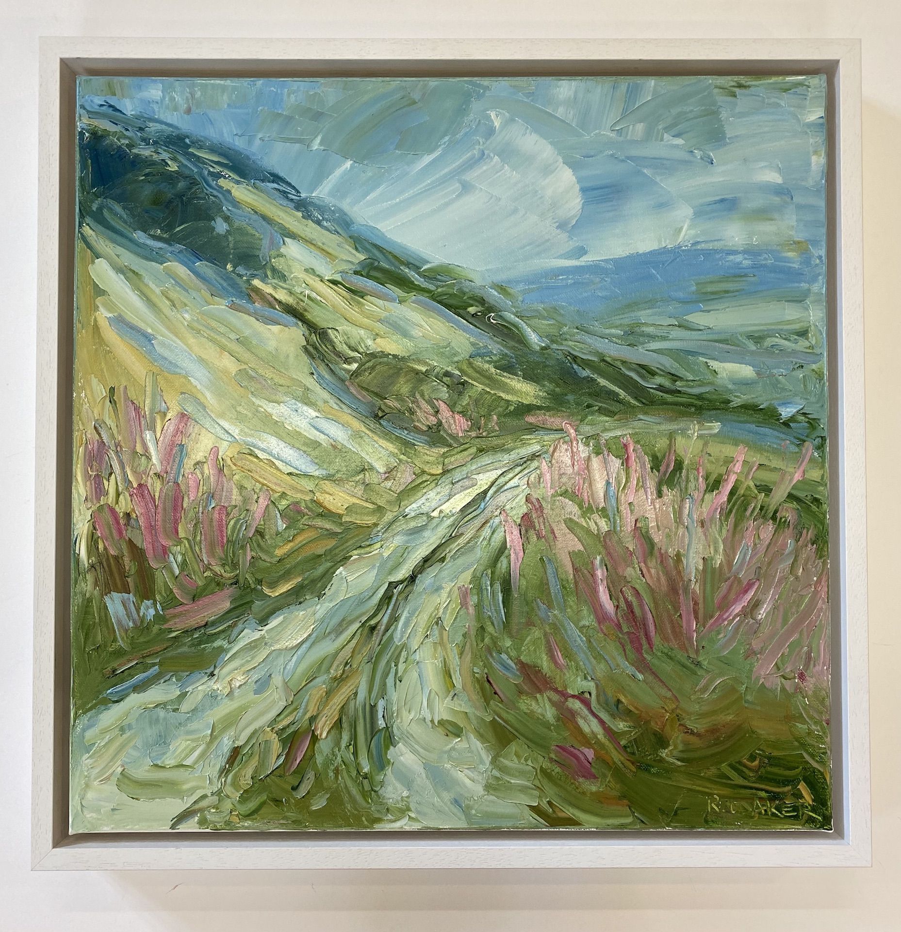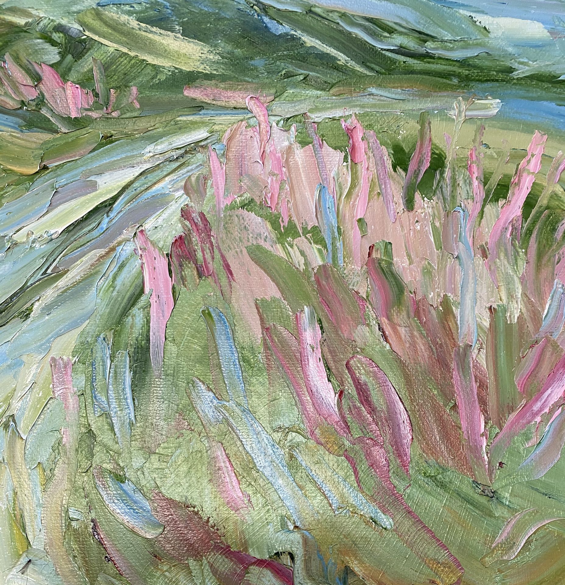 Crickley Hill is an original painting by Rupert Aker. It features a beautiful landscape of a hill with green and pink hued plants in the foreground and a bright blue sky in the background.