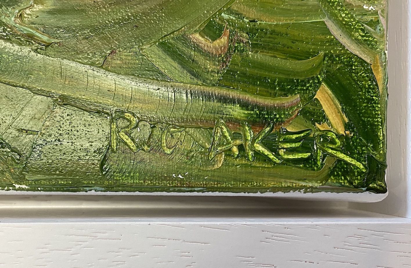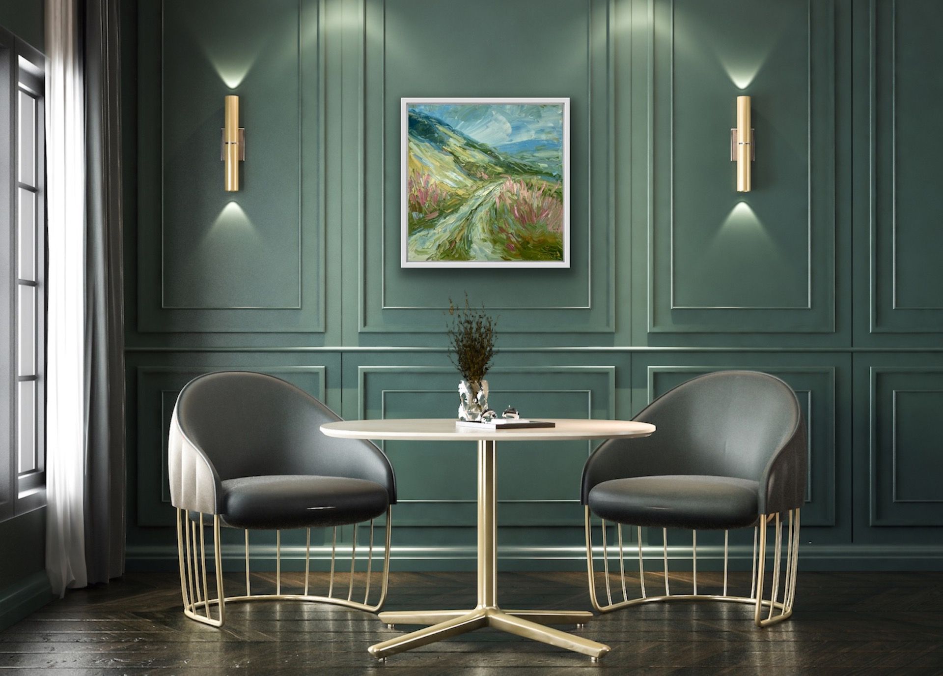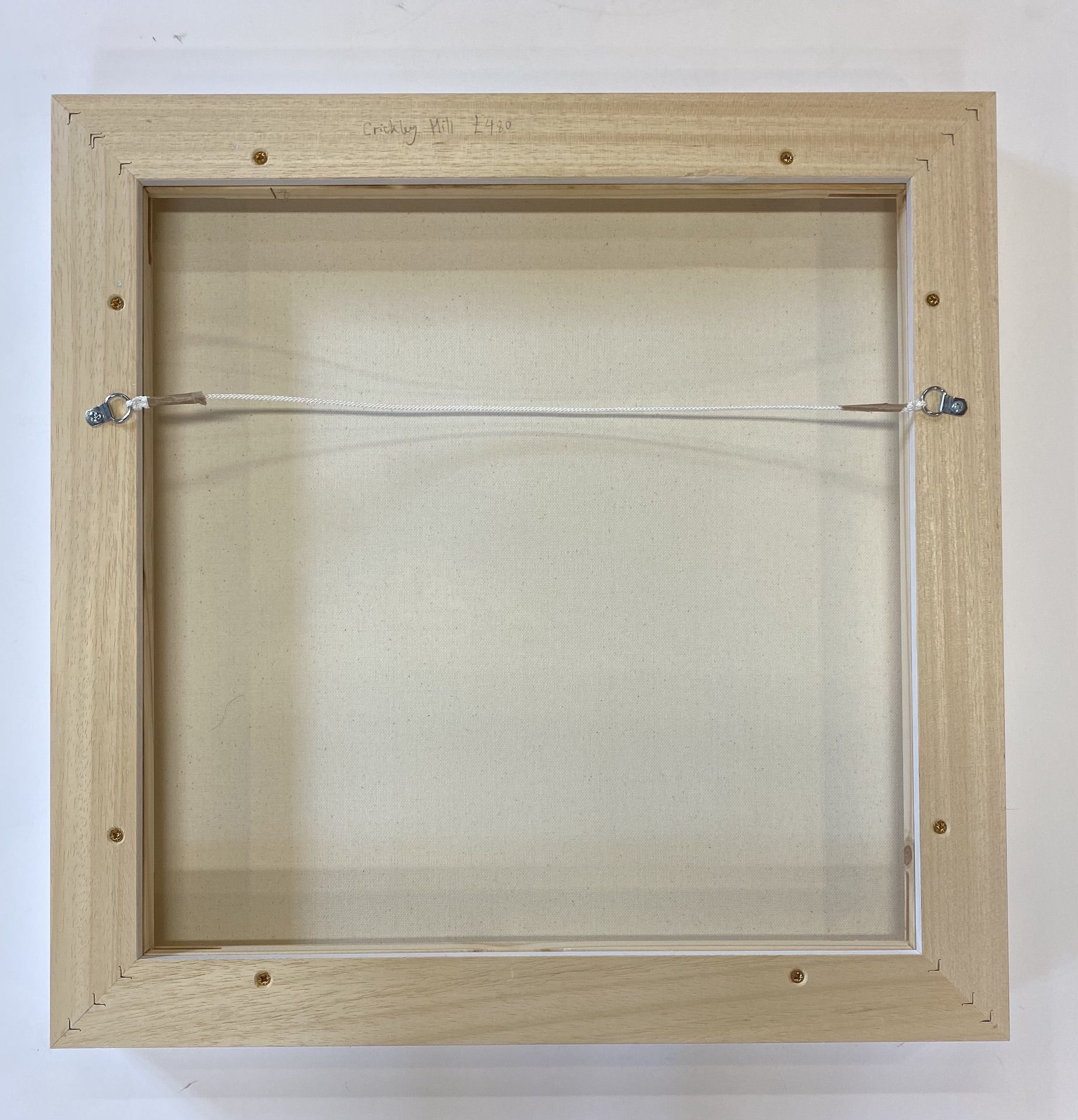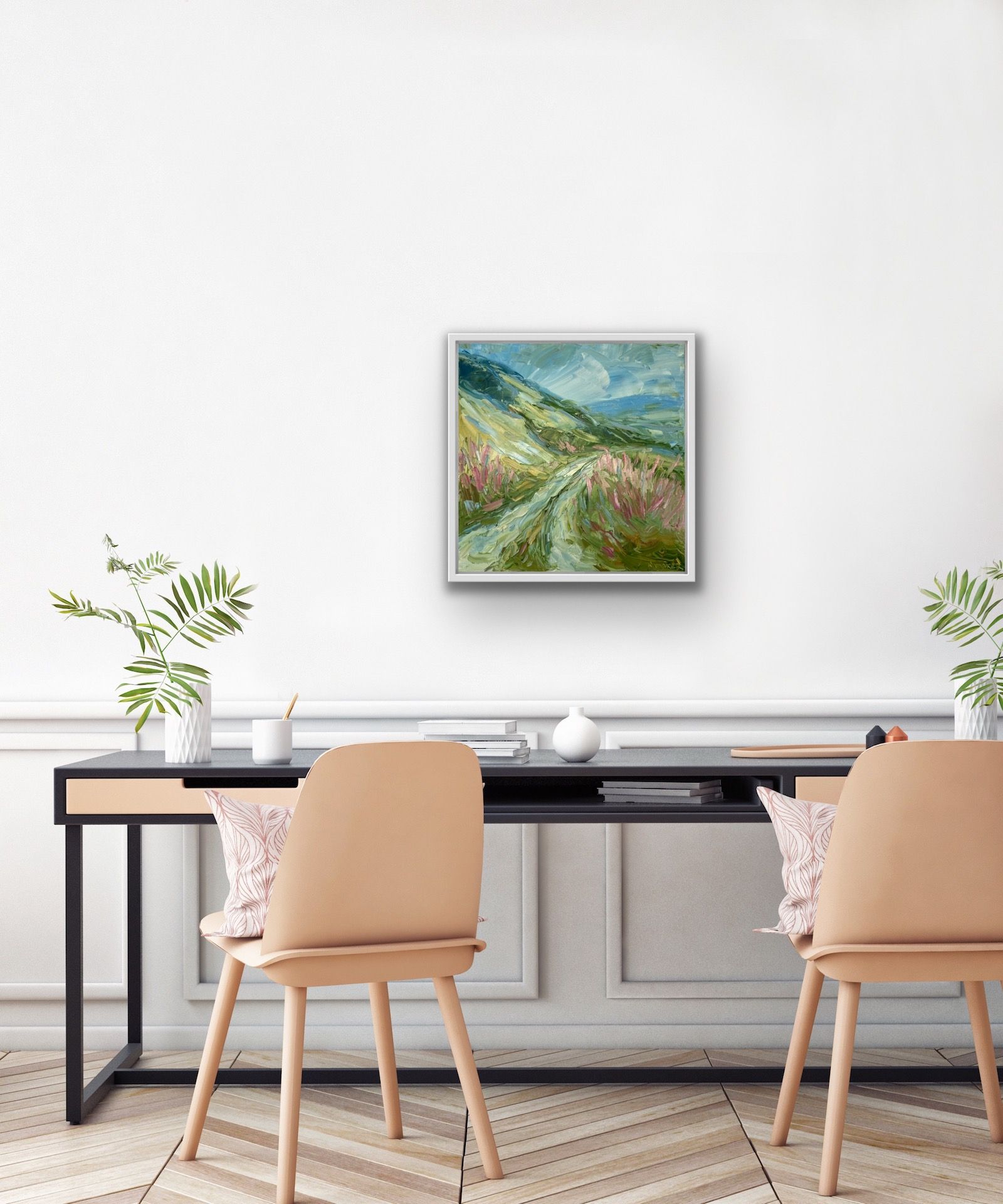Crickley Hill is an original painting by Rupert Aker. It features a beautiful landscape of a hill with green and pink hued plants in the foreground and a bright blue sky in the background.