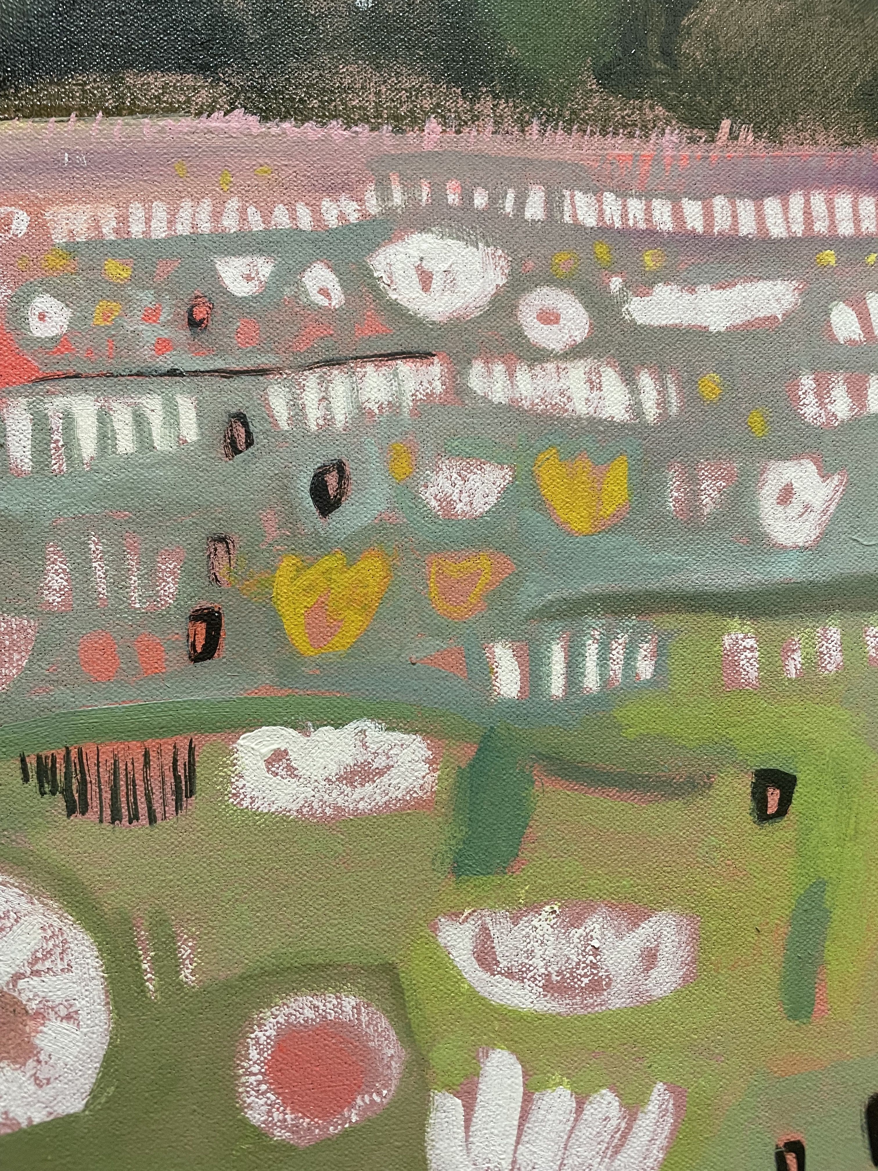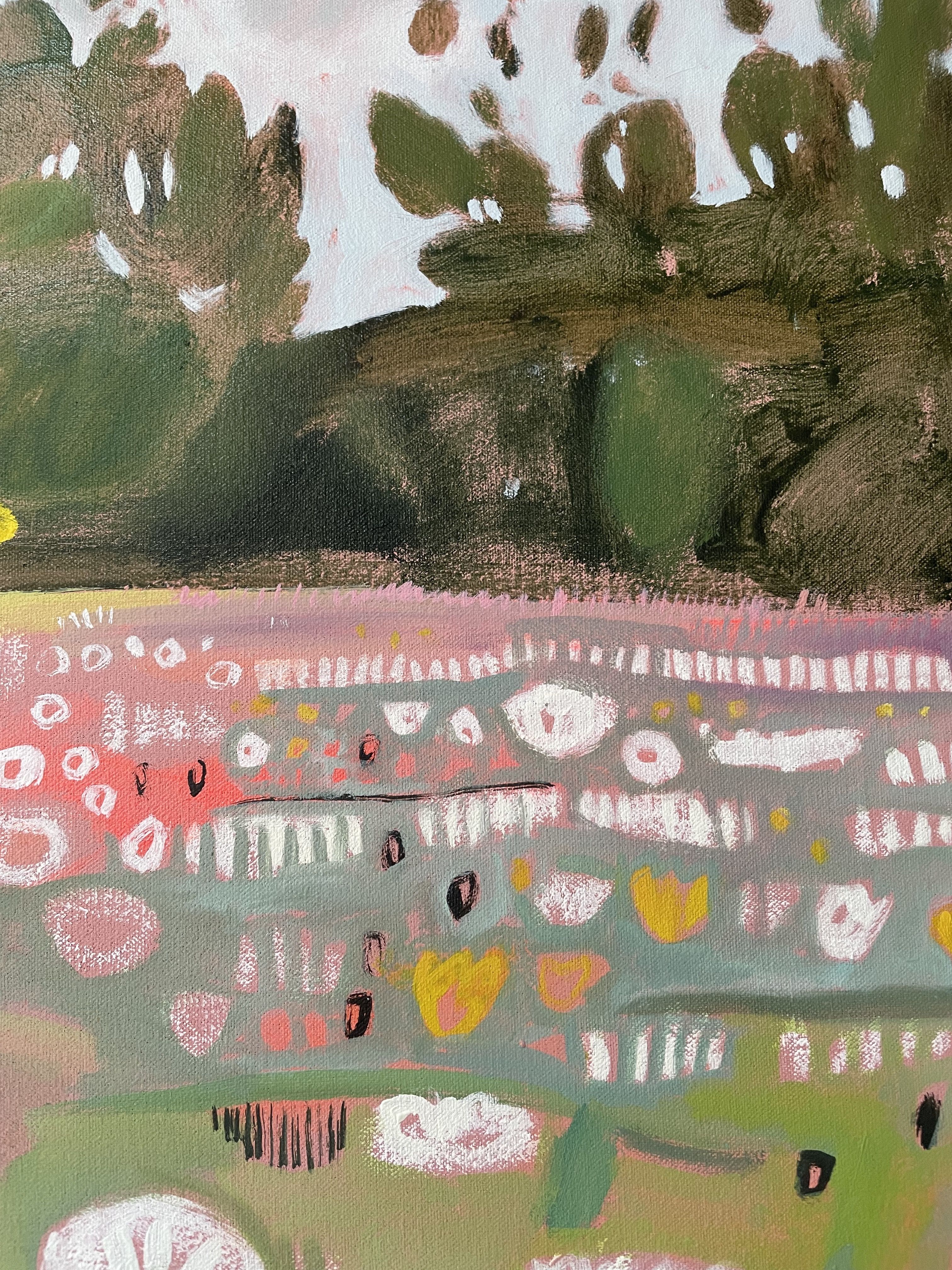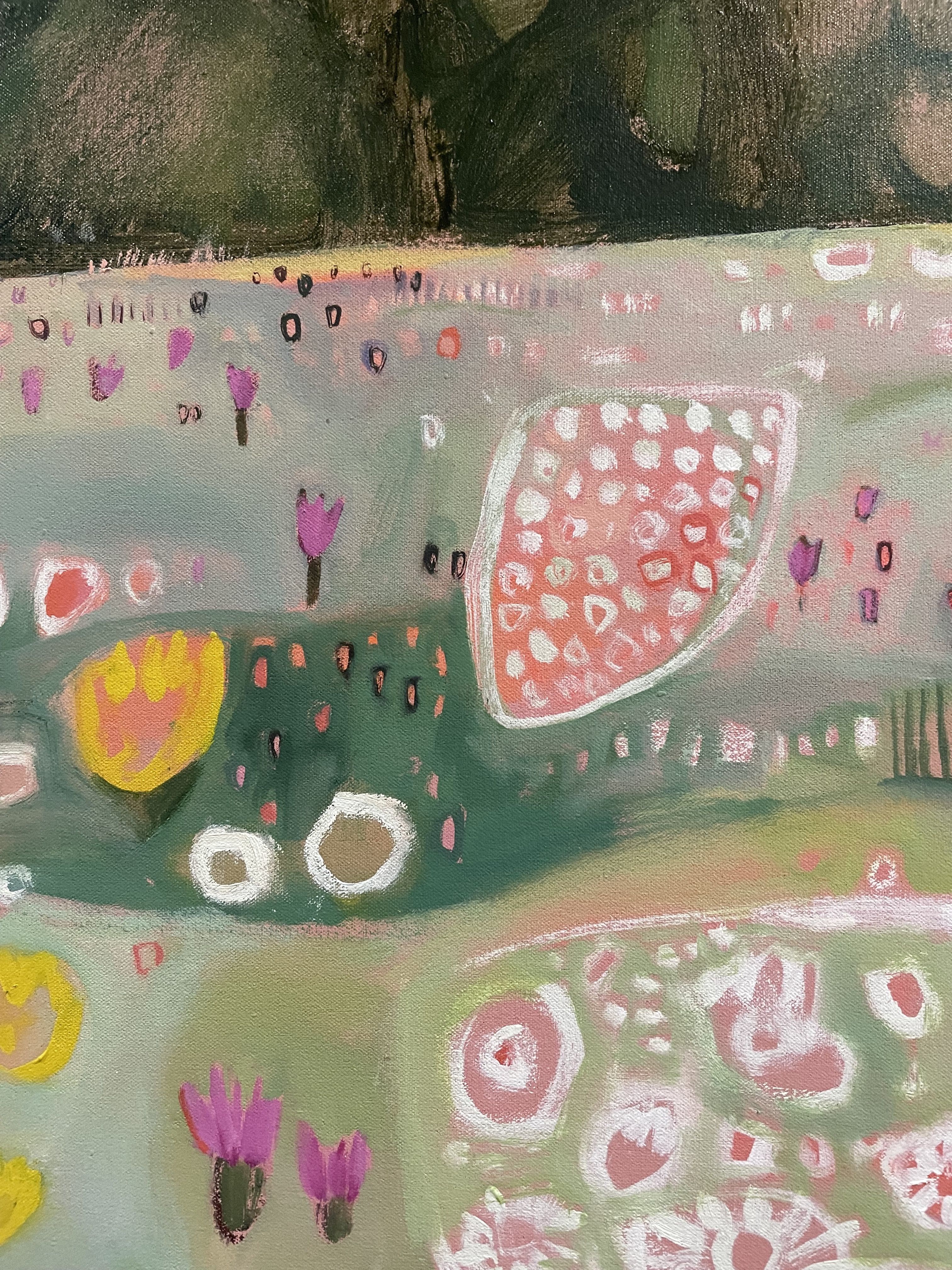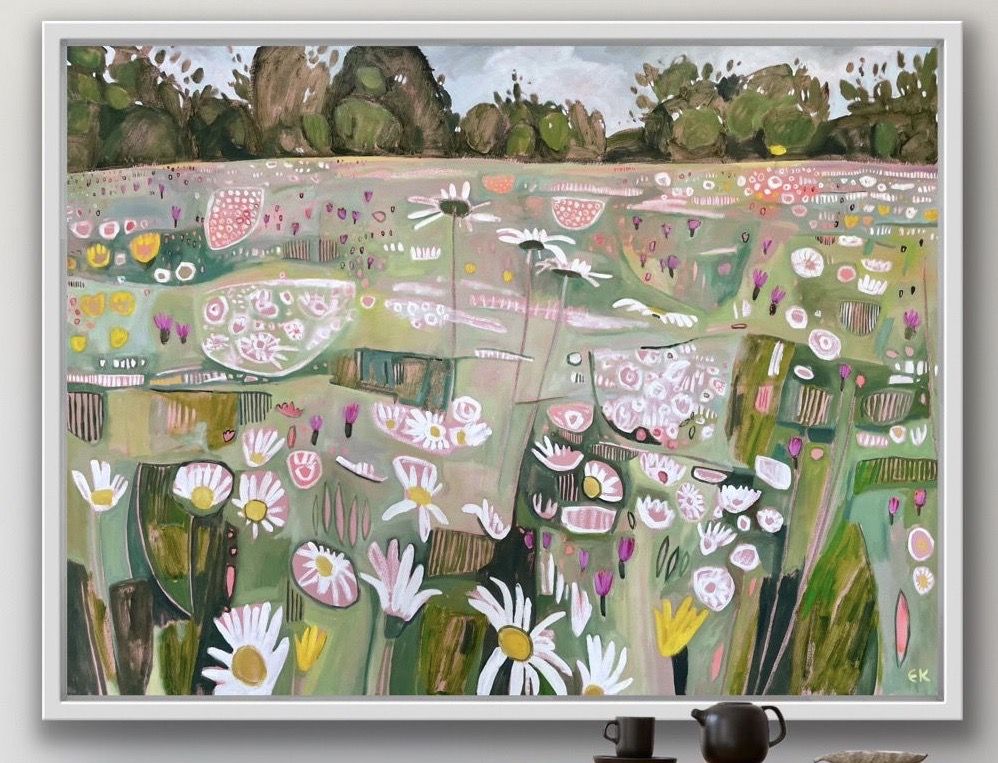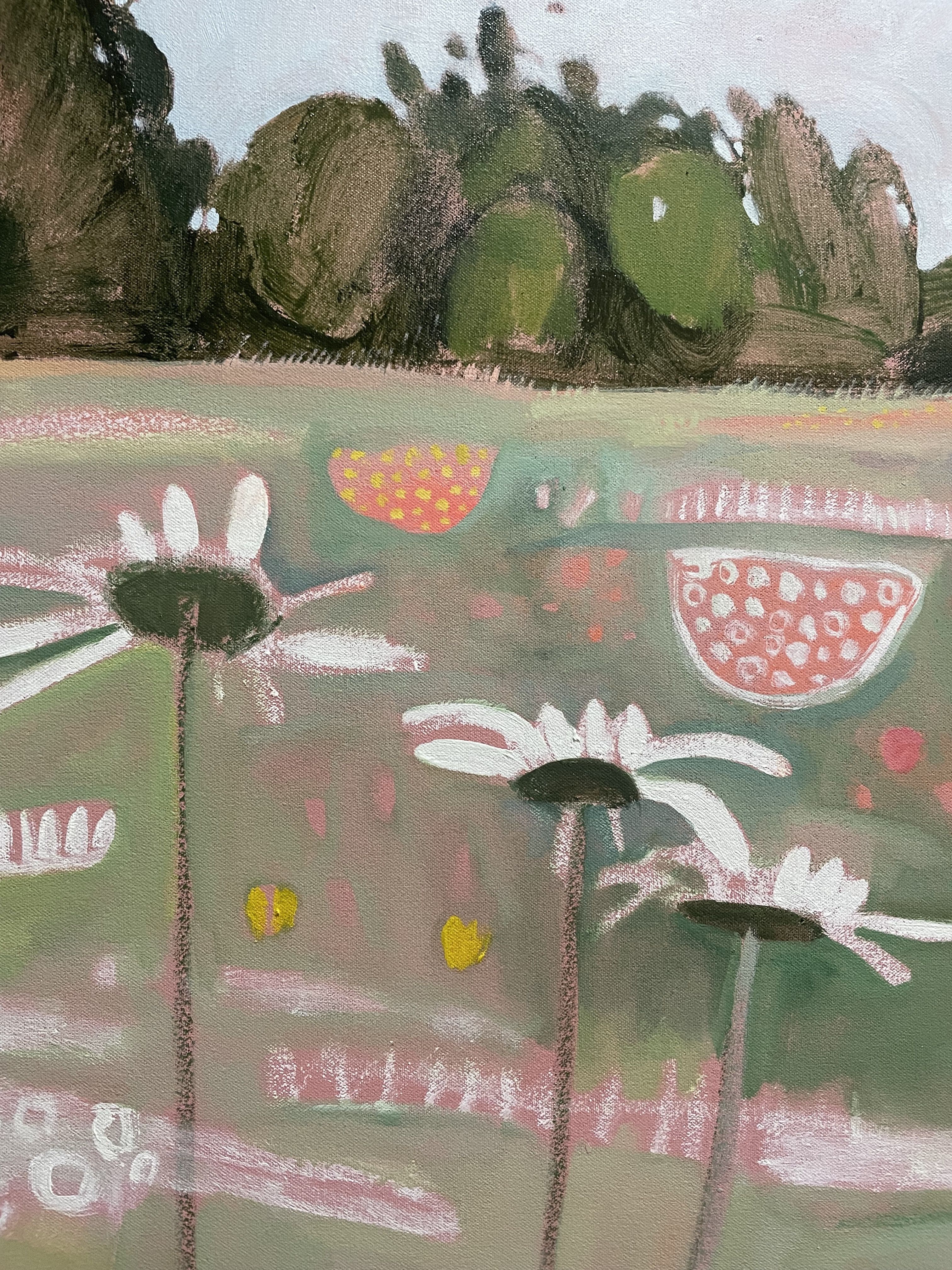 This painting in delicate summery pastel shades depicts a traditional wildflower meadow in full bloom. The colours are drawn from soft green grasses and the pretty pinks and yellows of the native wild flowers in this meadow. Ryewater Farm, Dorset, is part of a reserve managed by the charity Plantlife,