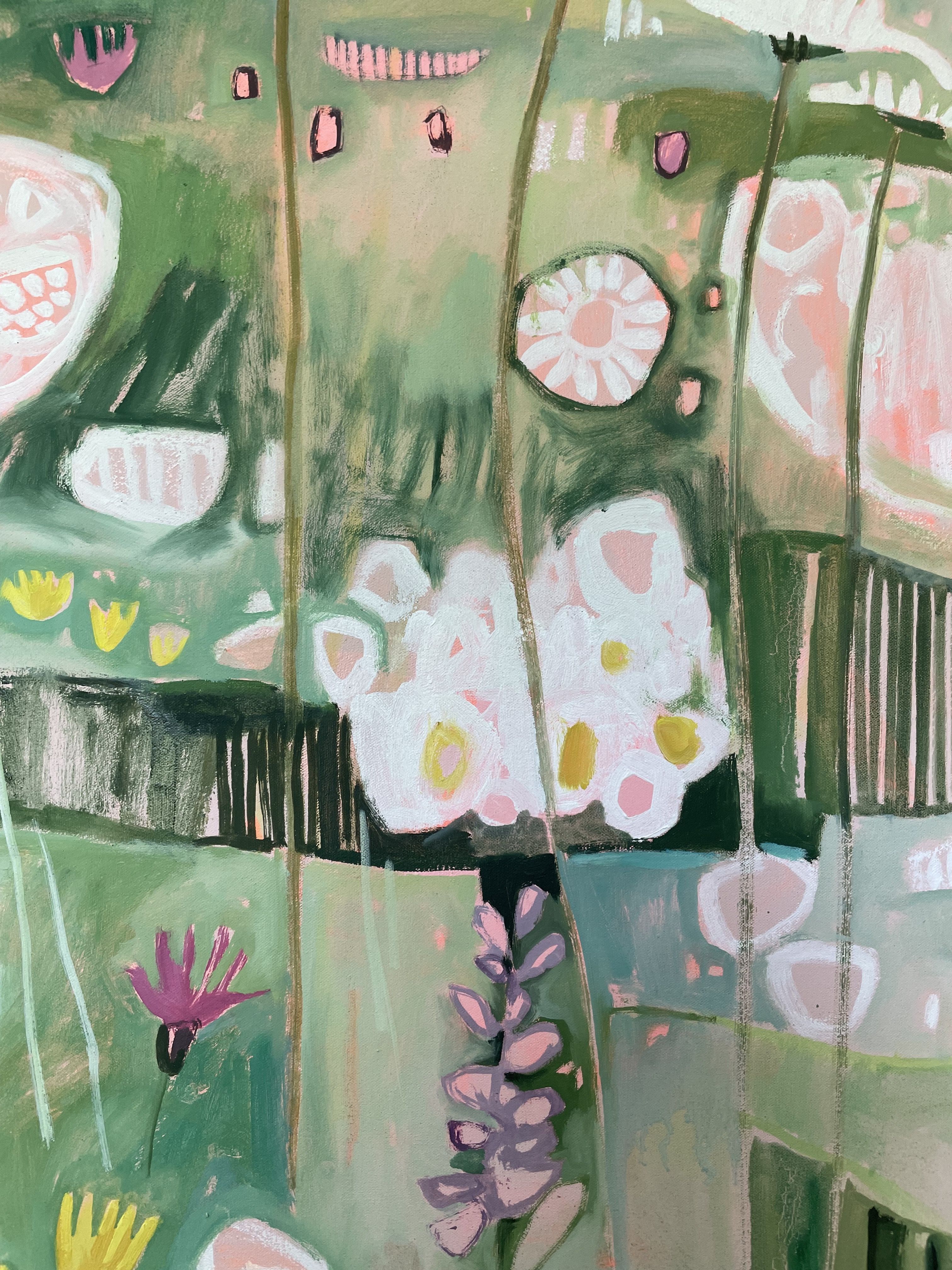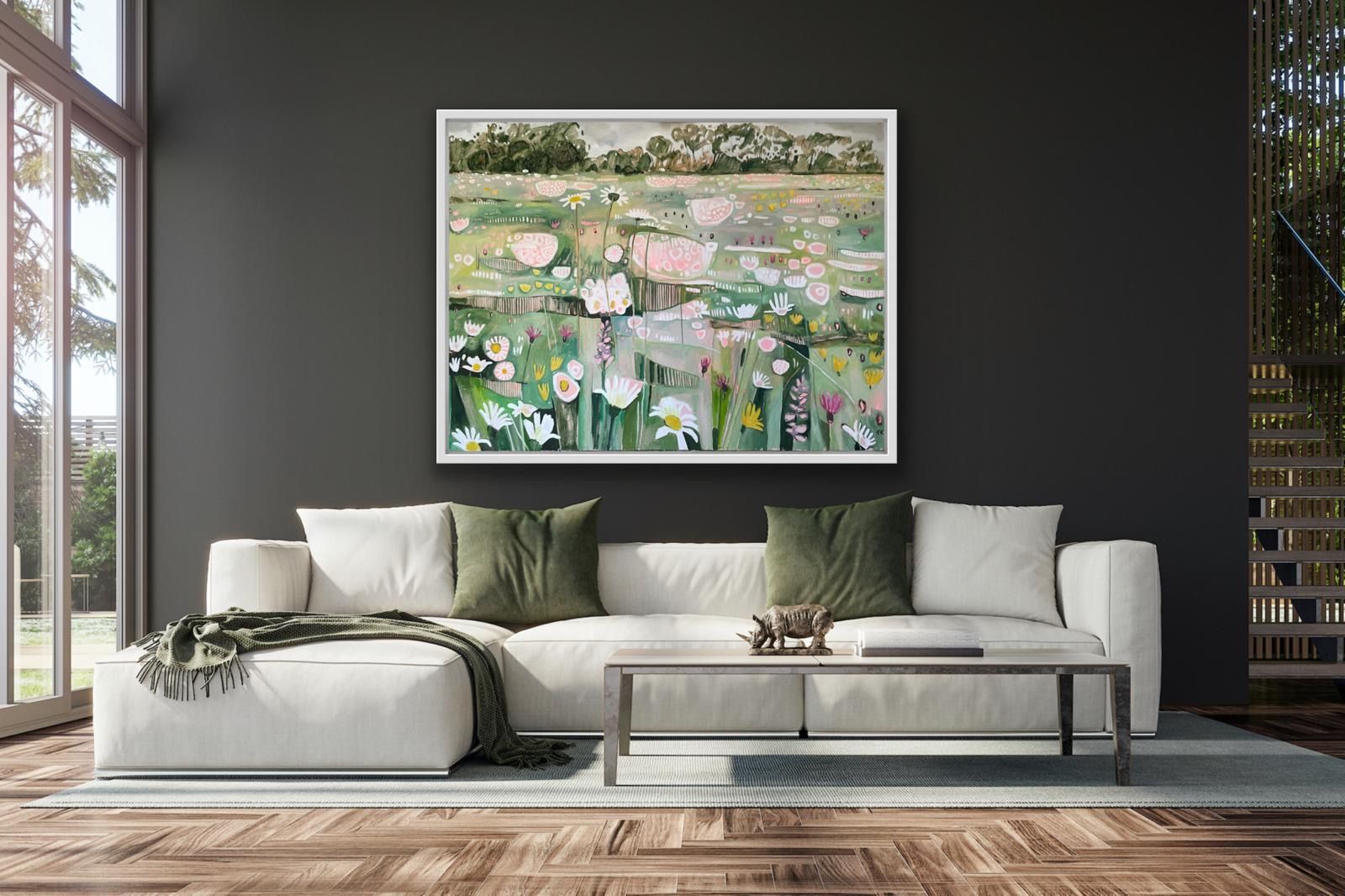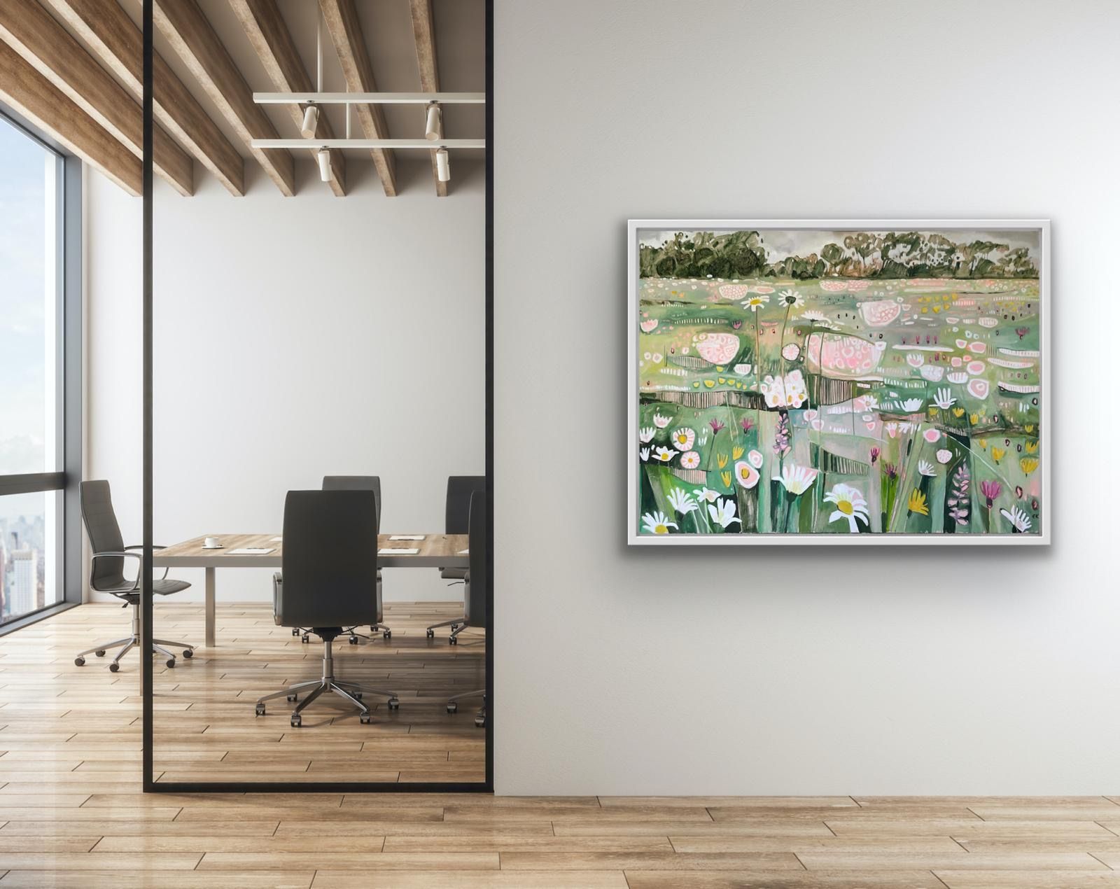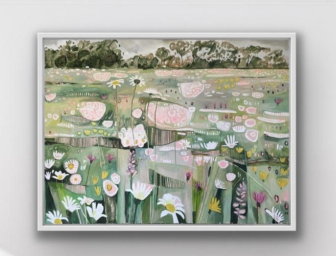 The delicate summery pastel shades of this work capture a traditional wildflower meadow in June. The colours are drawn from soft green grasses and the pretty pinks and yellows of the native wild flowers in this meadow. Ryewater Farm, Dorset, is part of a reserve managed by the charity Plantlife,