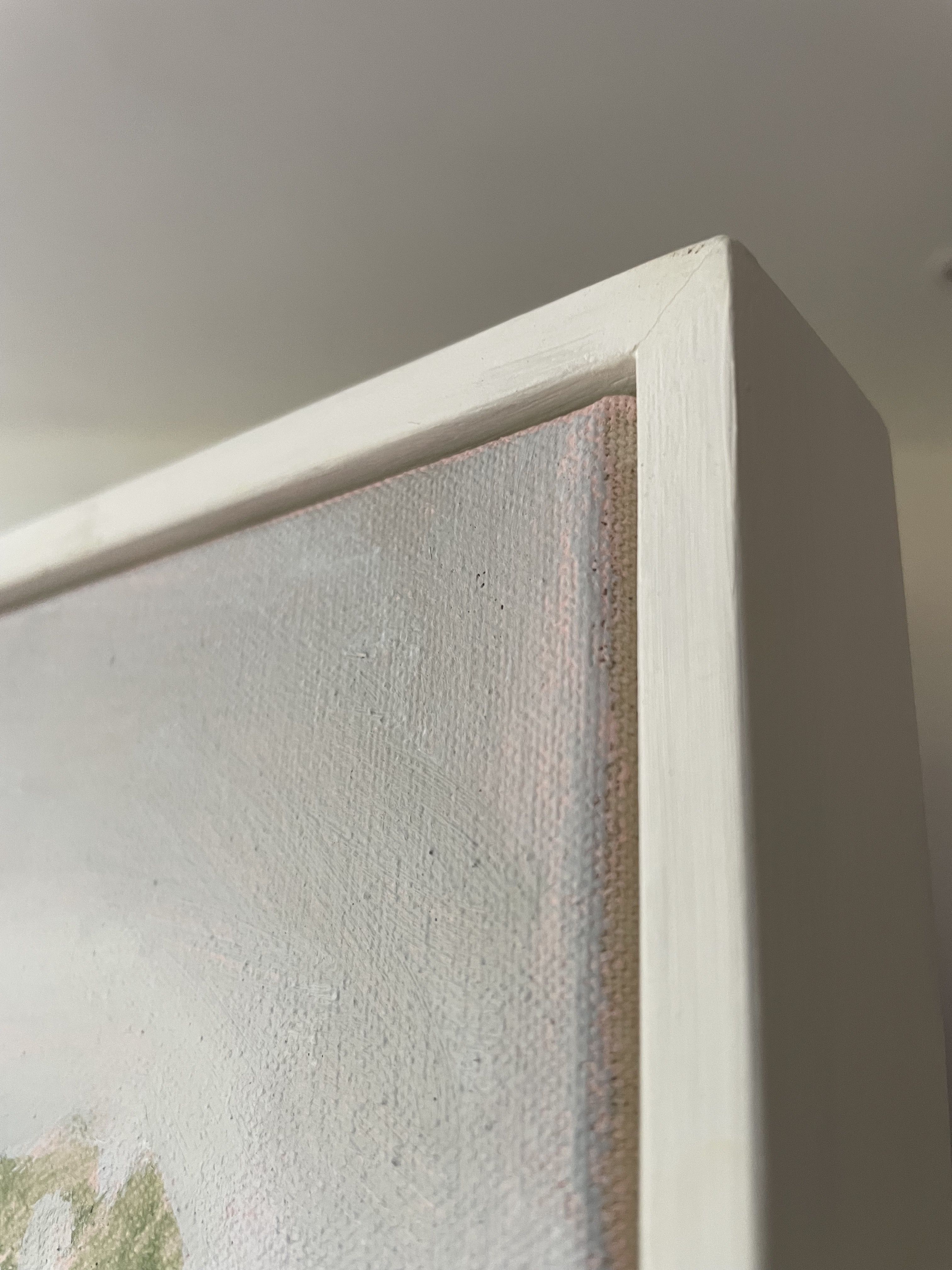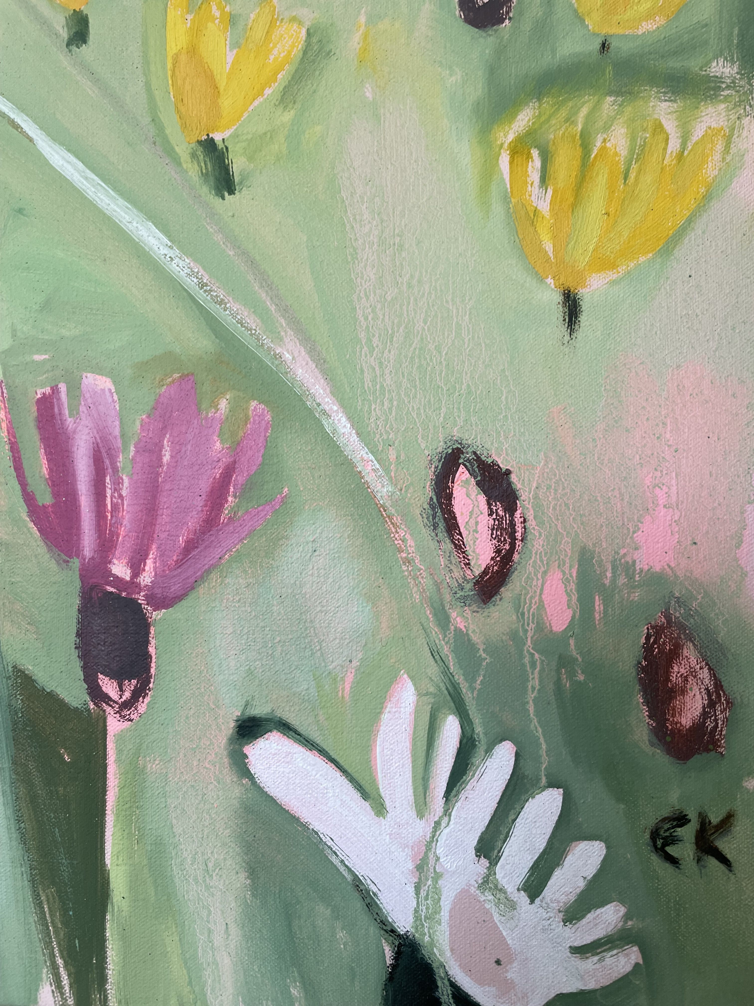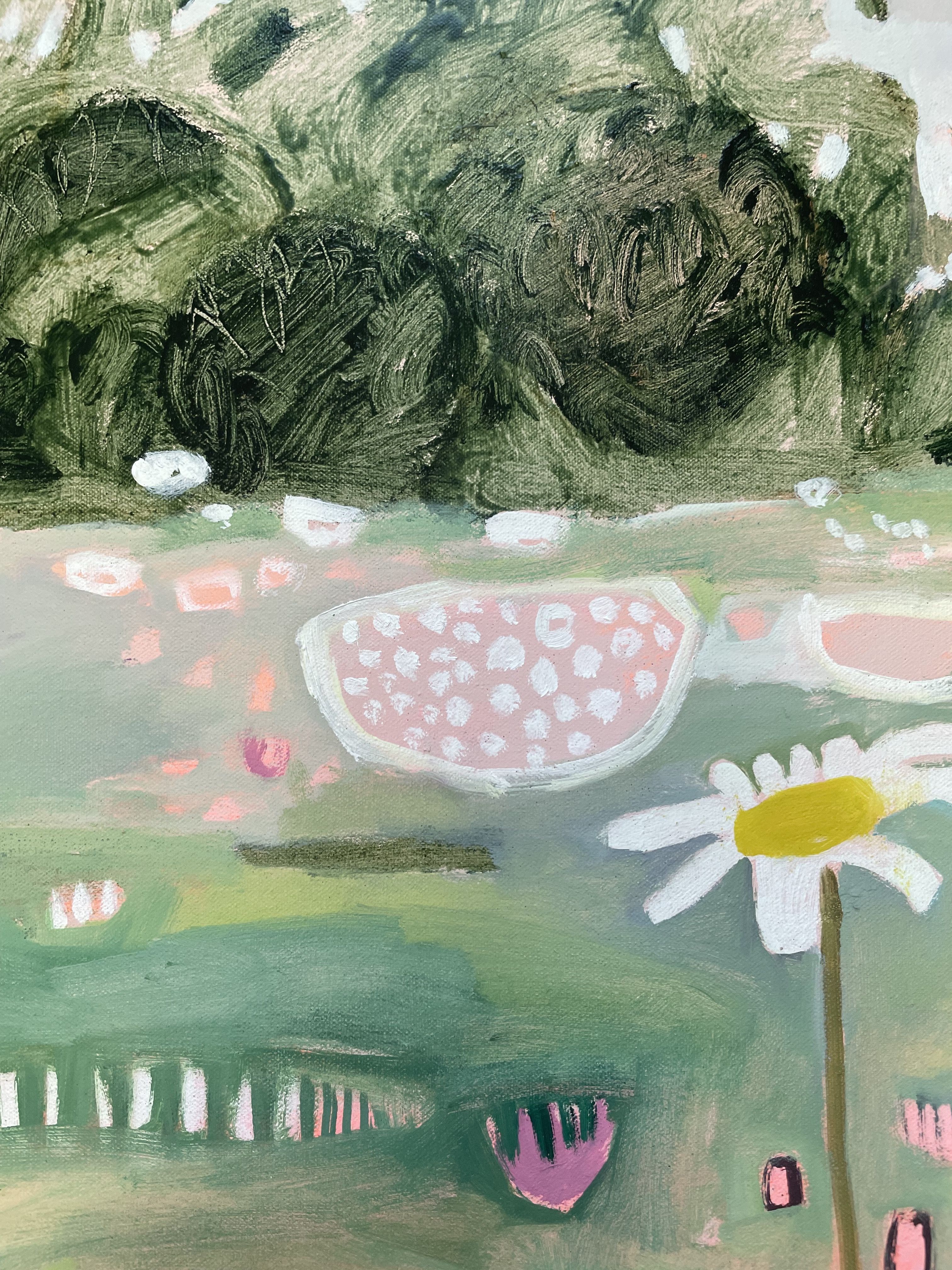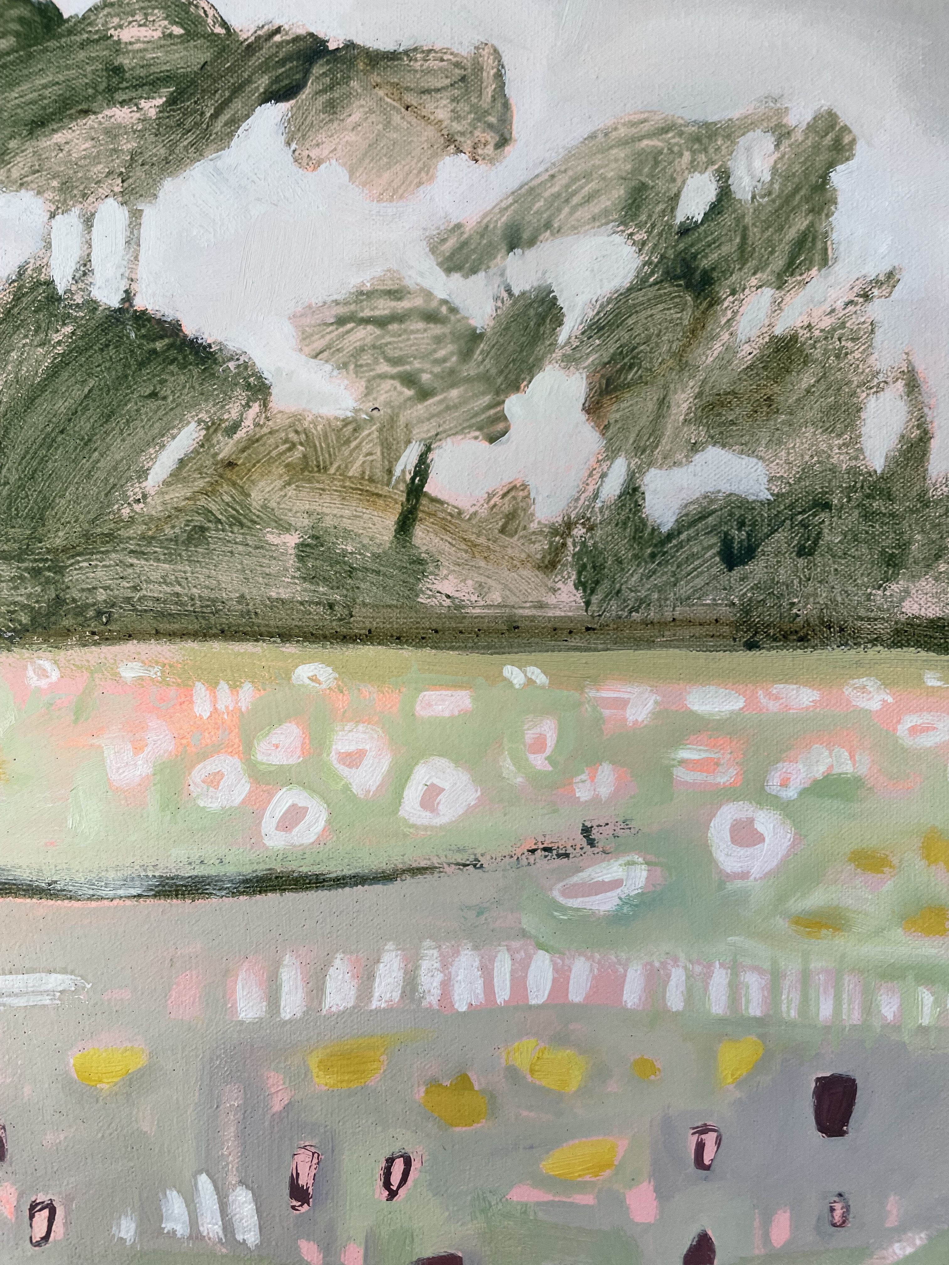 The delicate summery pastel shades of this work capture a traditional wildflower meadow in June. The colours are drawn from soft green grasses and the pretty pinks and yellows of the native wild flowers in this meadow. Ryewater Farm, Dorset, is part of a reserve managed by the charity Plantlife,