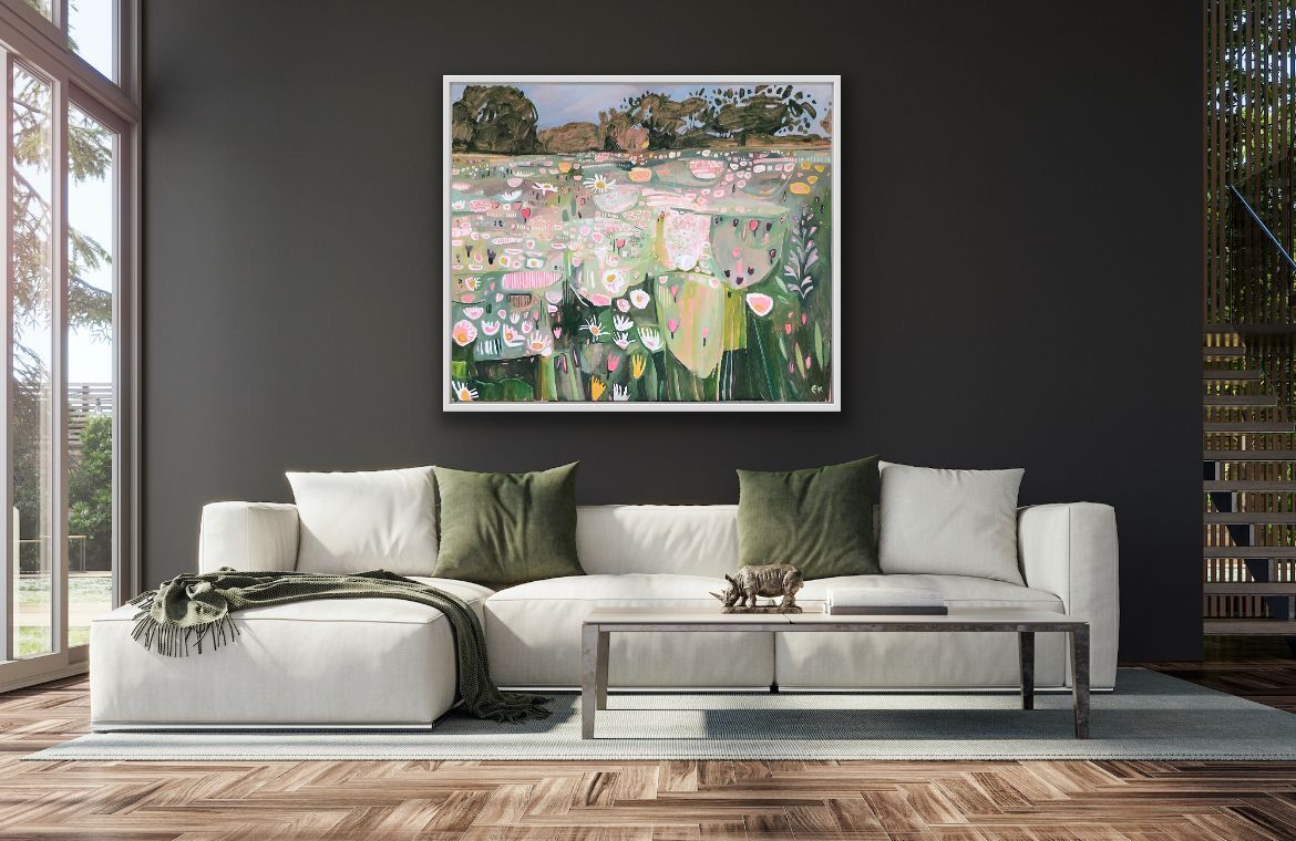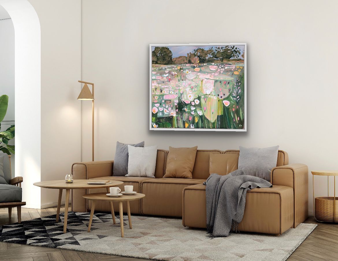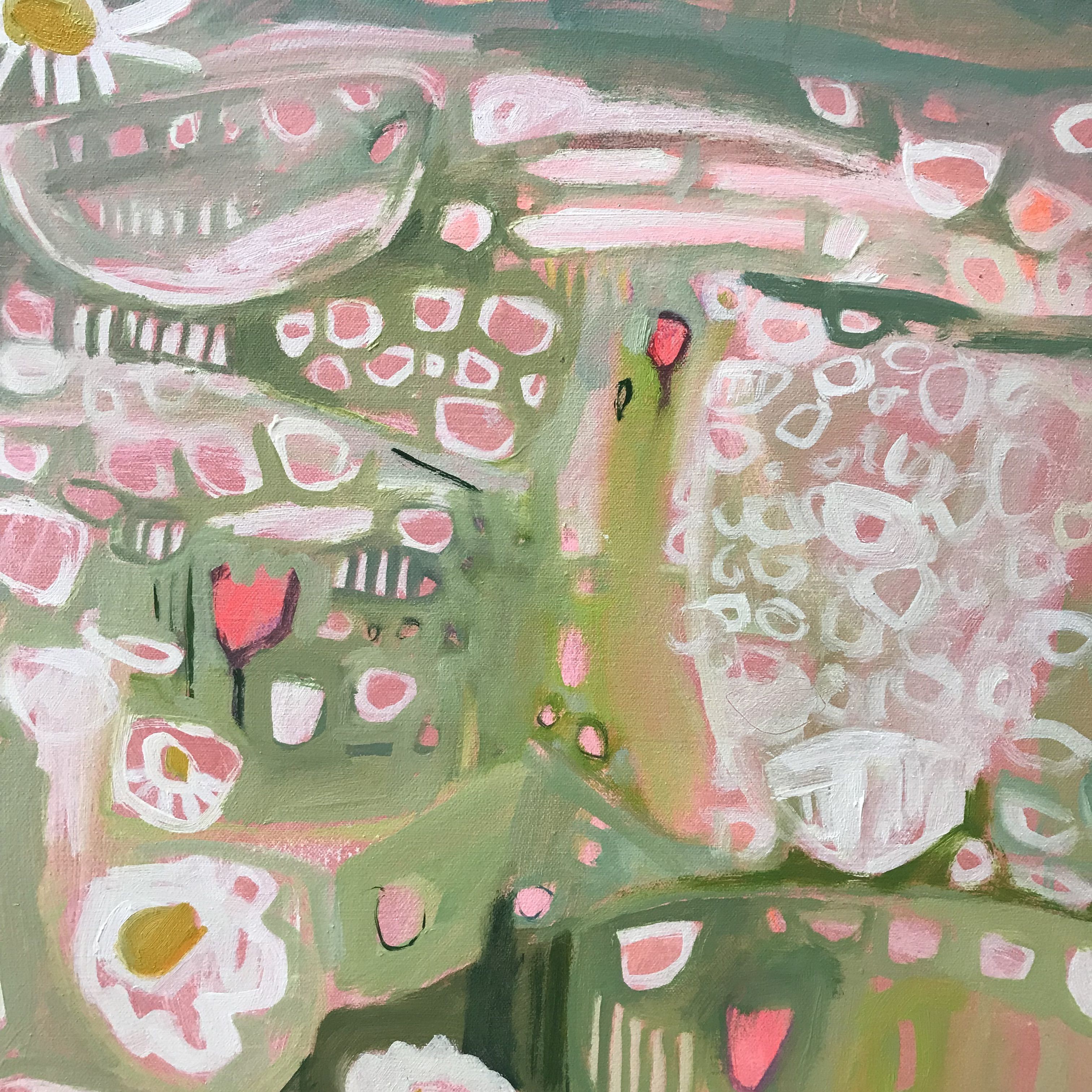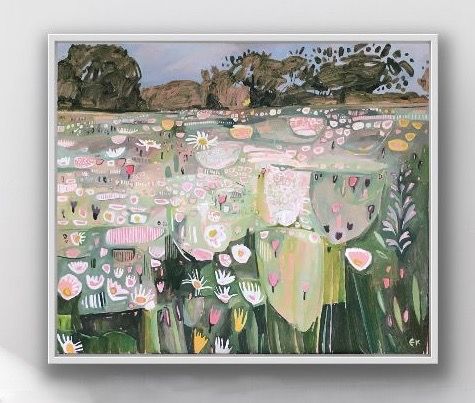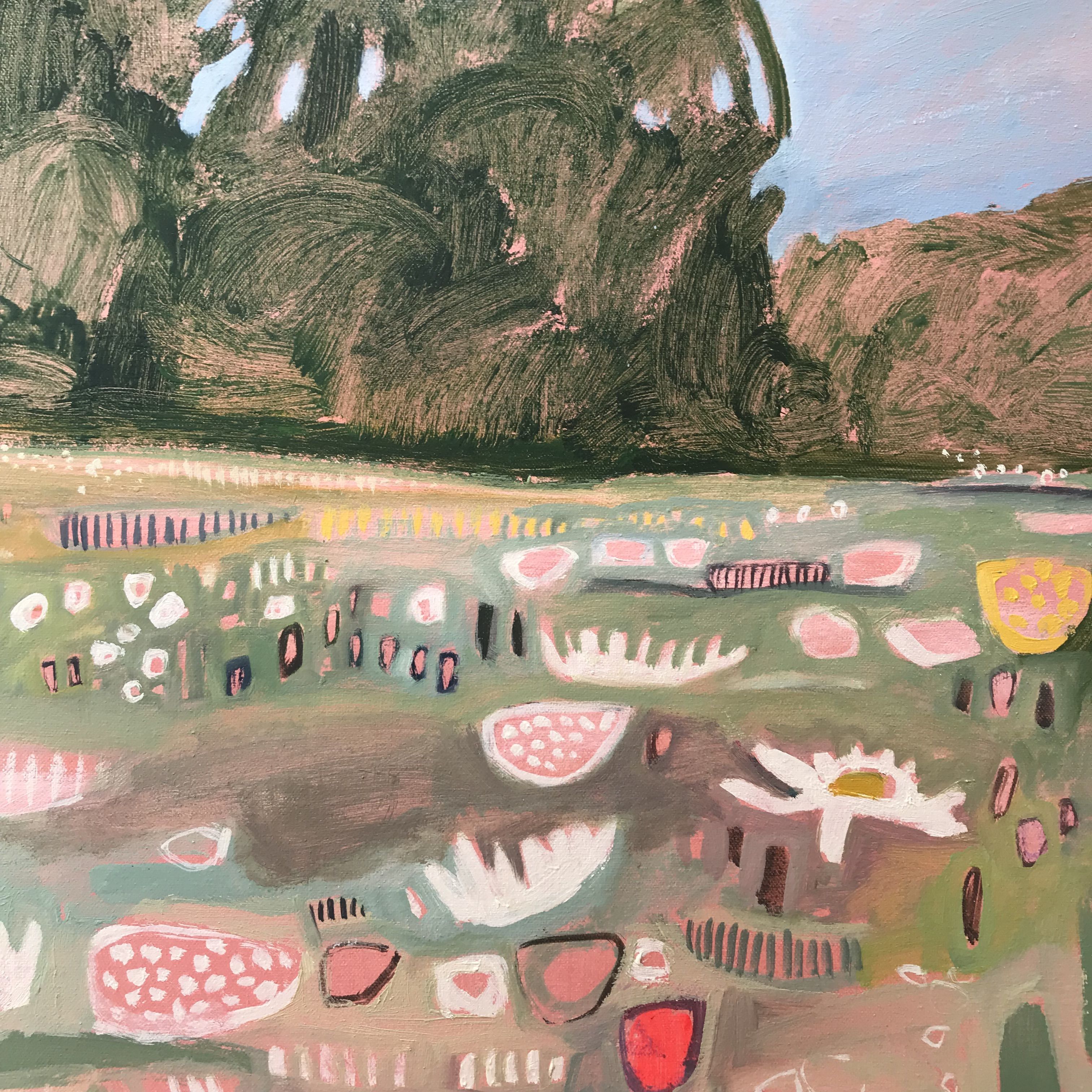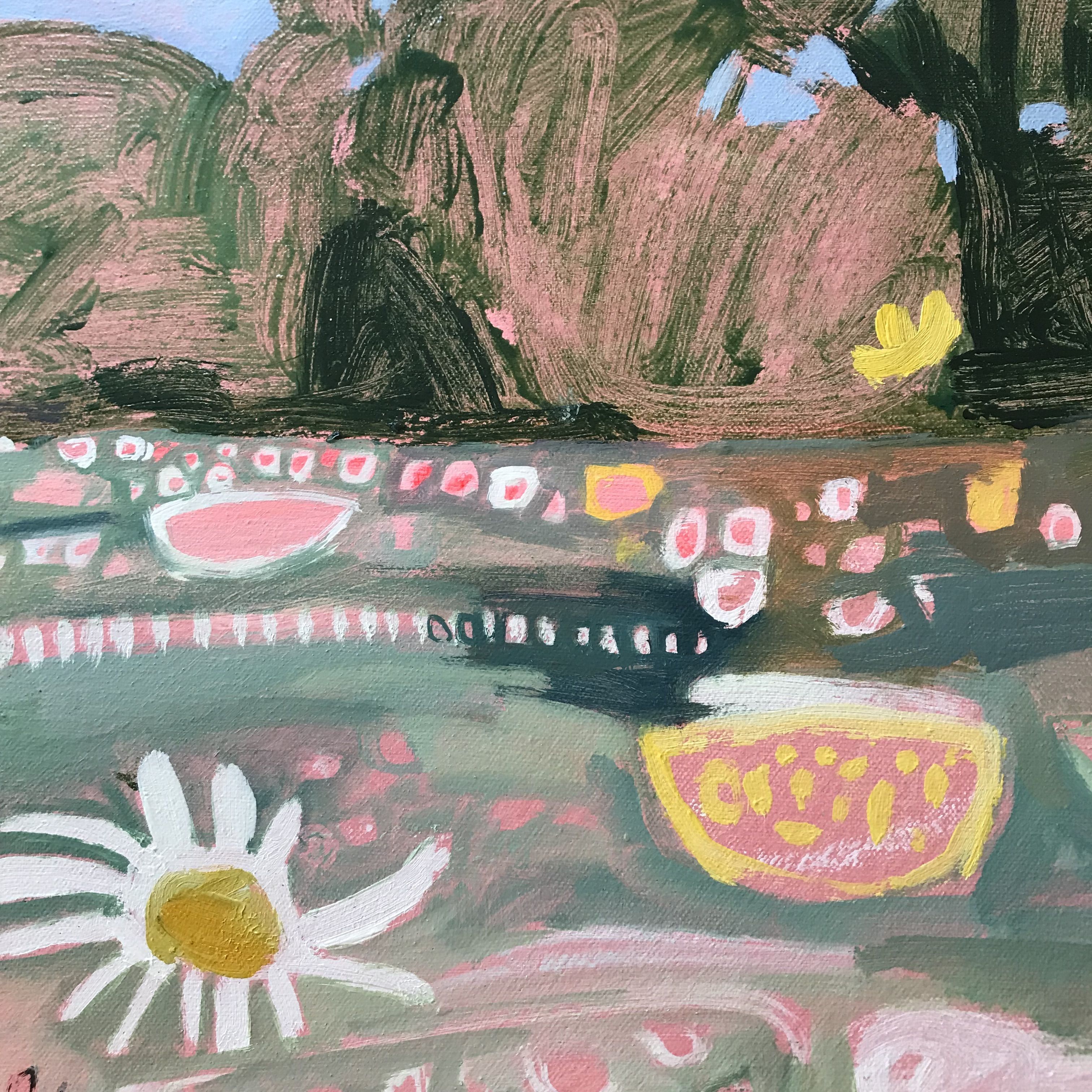 This work was created in late summer 2023 and is an interpretation of one of our most special wildflower meadow at Ryewater Farm, in Dorset, managed by the charity Plantlife. This glorious flower-rich hay meadow is a riot of colour throughout the summer - there's pink flowers - knapweed, red