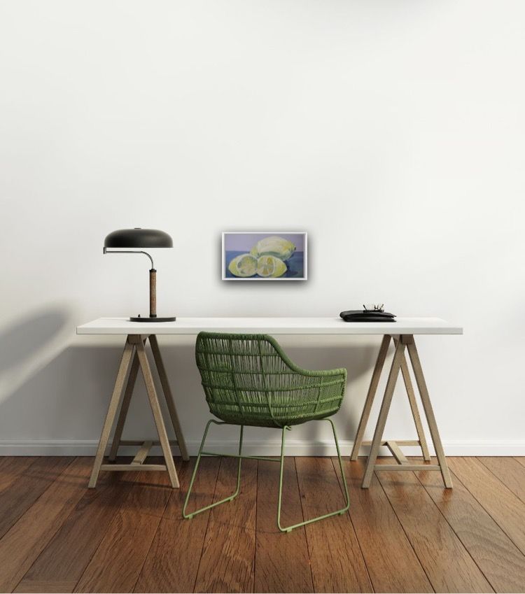 Sarah Adams One Lemon and a Cut Lemon Original Still Life Painting Acrylic Paint on paper Sheet Size: H 18cm x W 28cm x D 0.1cm Sold Unframed Please note that insitu images are purely an indication of how a piece may look One Lemon and a cut Lemon is a contemporary still life painting by Sarah