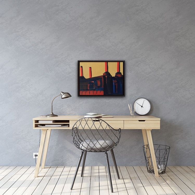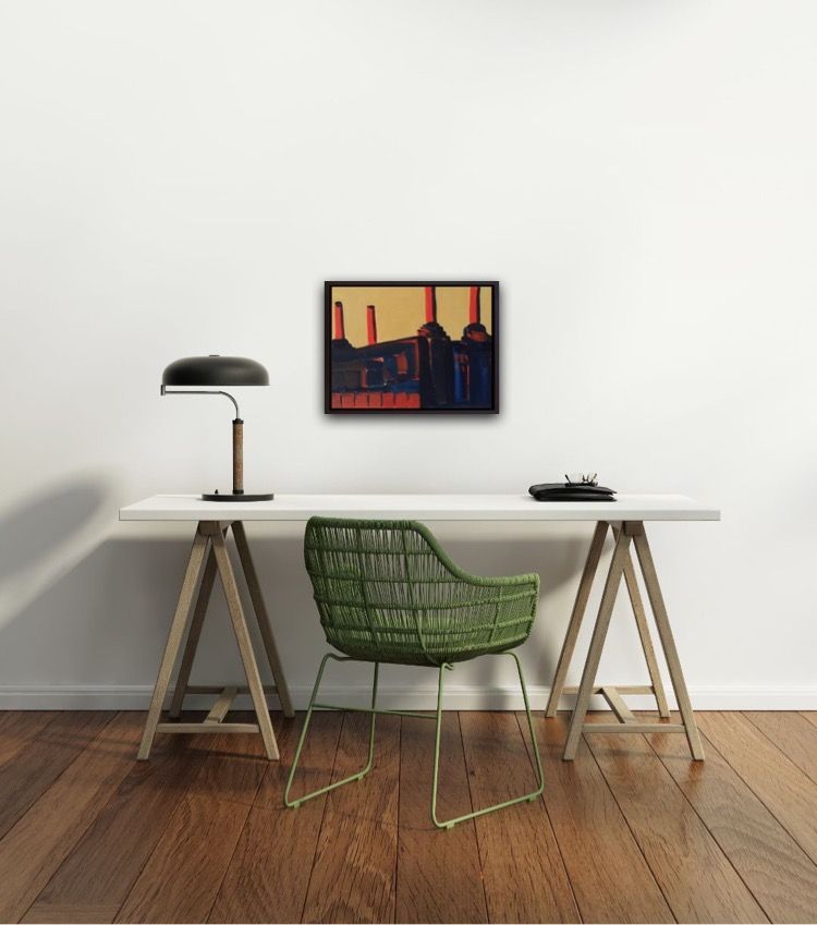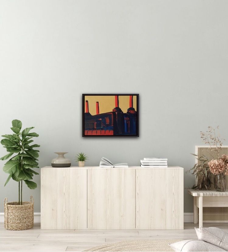 Sarah Adams Retro Battersea 1 Original London Cityscape Painting Acrylic Paint on Canvas Canvas Size: H 30cm x W 40cm Sold Unframed Retro Battersea 1 is a painting of Battersea Power Station made from studies taken before the redevelopment began. The colours of warm ochre background and the deep navy and flash of tomato red, conjures