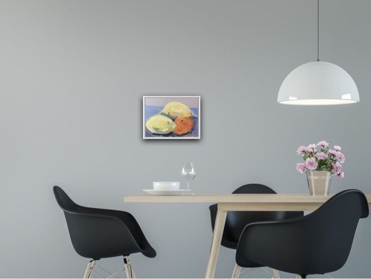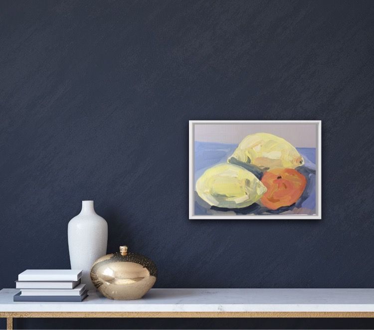 Sarah Adams Two Lemons and a Clementine Original Acrylic Painting Acrylic Paint on paper Sheet Size: H 18cm x W 28cm x D 0.1cm Sold Unframed Please note that insitu images are purely an indication of how a piece may look Two Lemons and a Clementine is an original painting by Sarah Adams. It is painted from