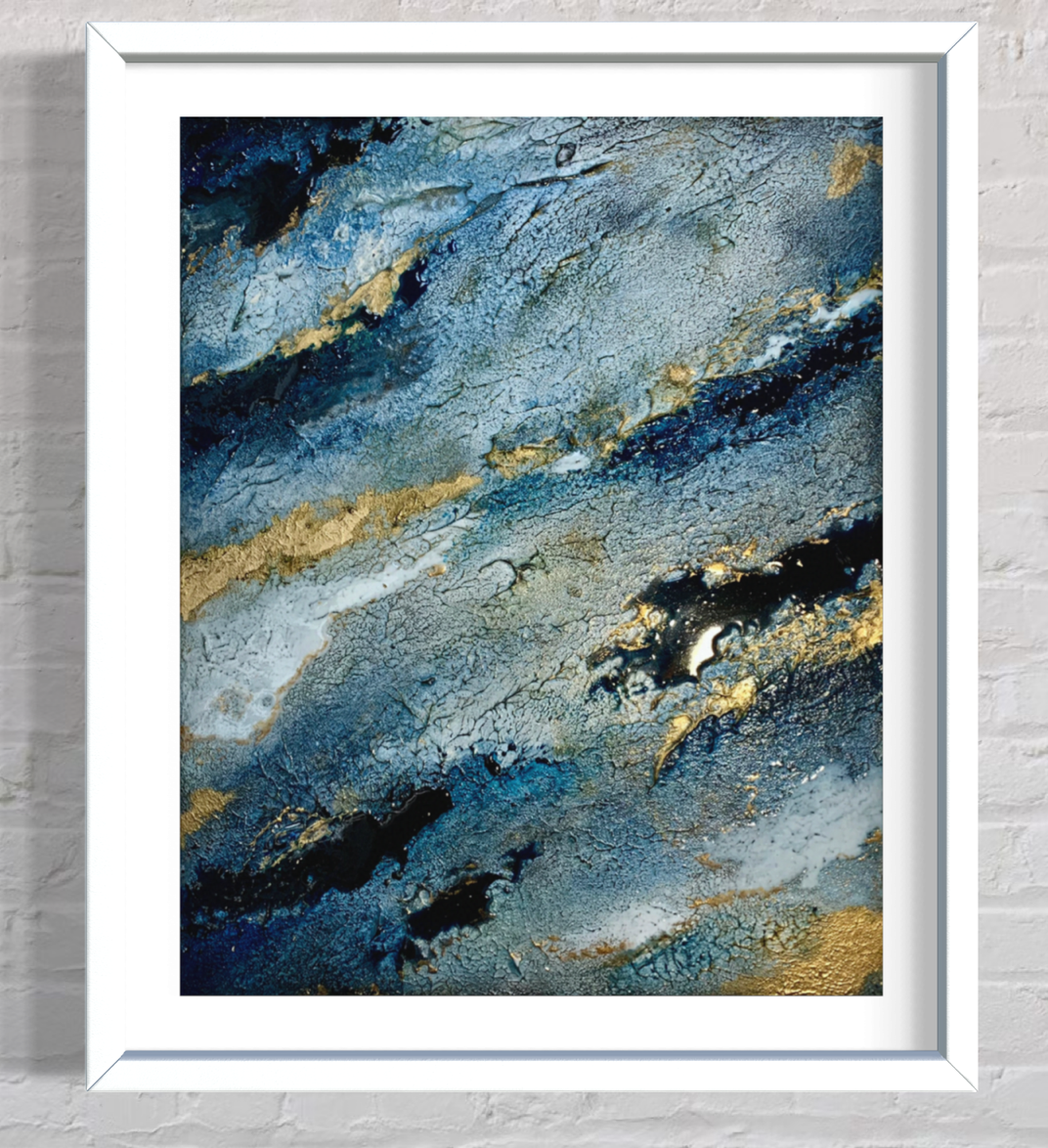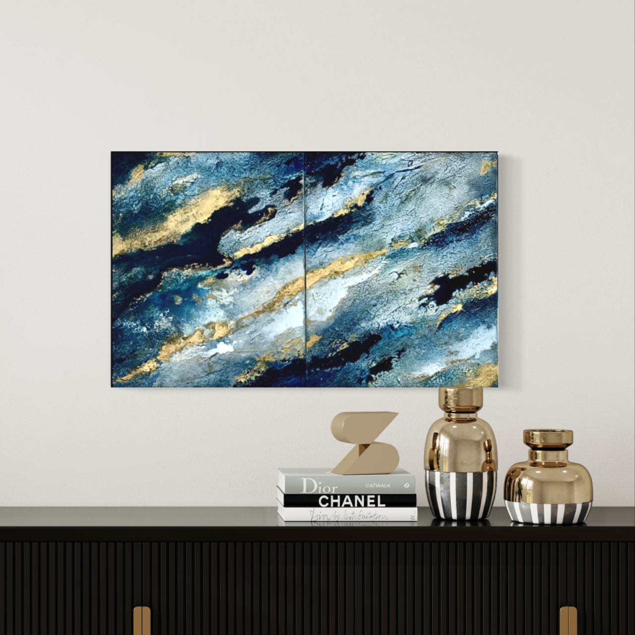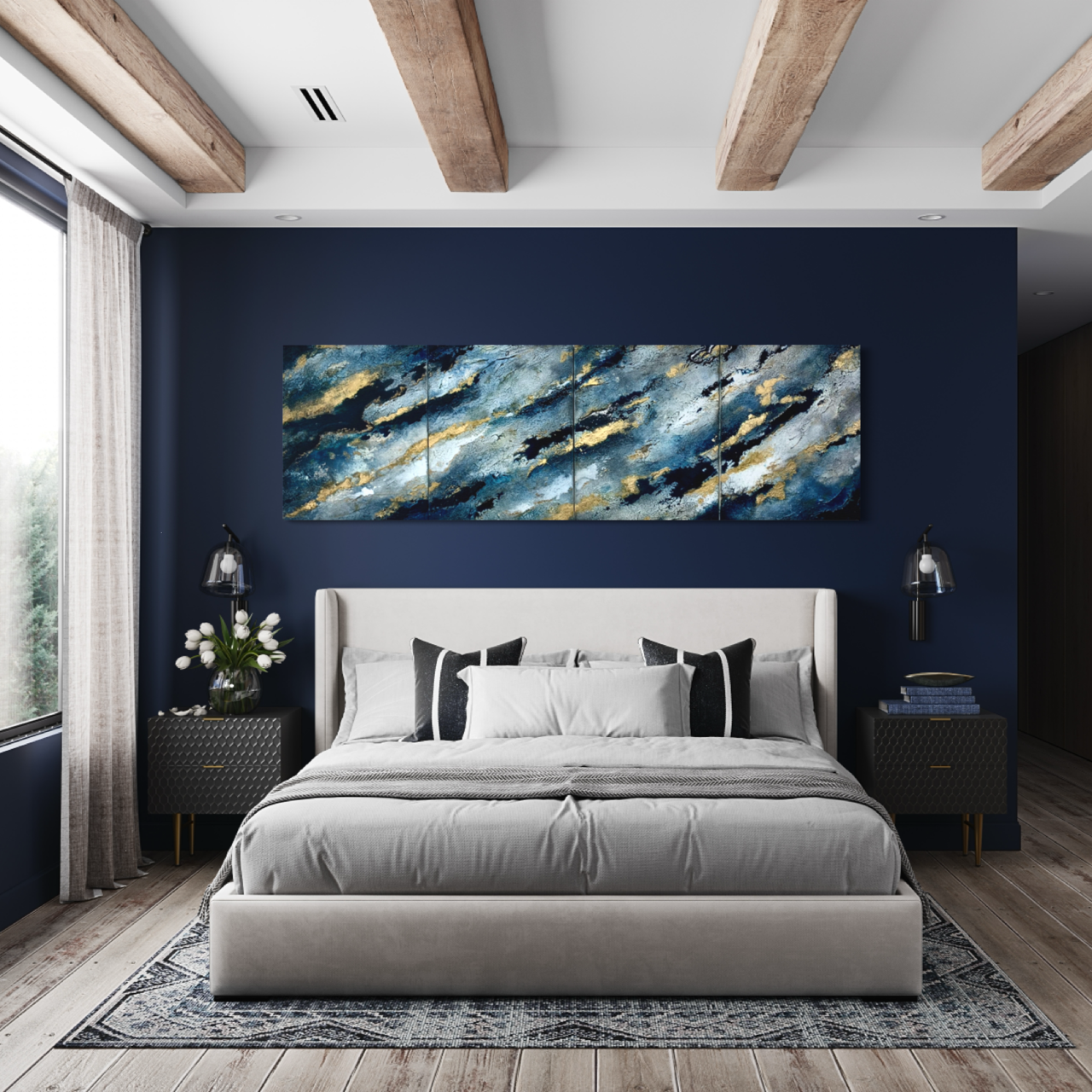 Part 2 of a TETRAPTYCH "Sapphire Midnight". Buy all 4 for impact, or 2 or 3 depending on your space. Or just grab your favourite!!! Inspired by the beautiful moonlight reflecting off the midnight blue sea off the coast of Menorca on holiday this summer. Gorgeous midnight blues mixed with
