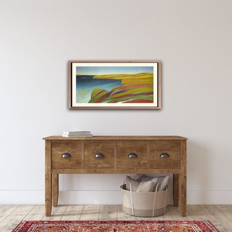 Sarah du Feu From Harlyn 3 Original Monoprint Image size 30 x 64 cm Framed size 48 x 80 cm Framed in a solid oak wood frame Printed on acid free Somerset Velvet 280gsm paper Please note that insitu images are purely an indication of how a piece may look. This monoprint was inspired by a small strip