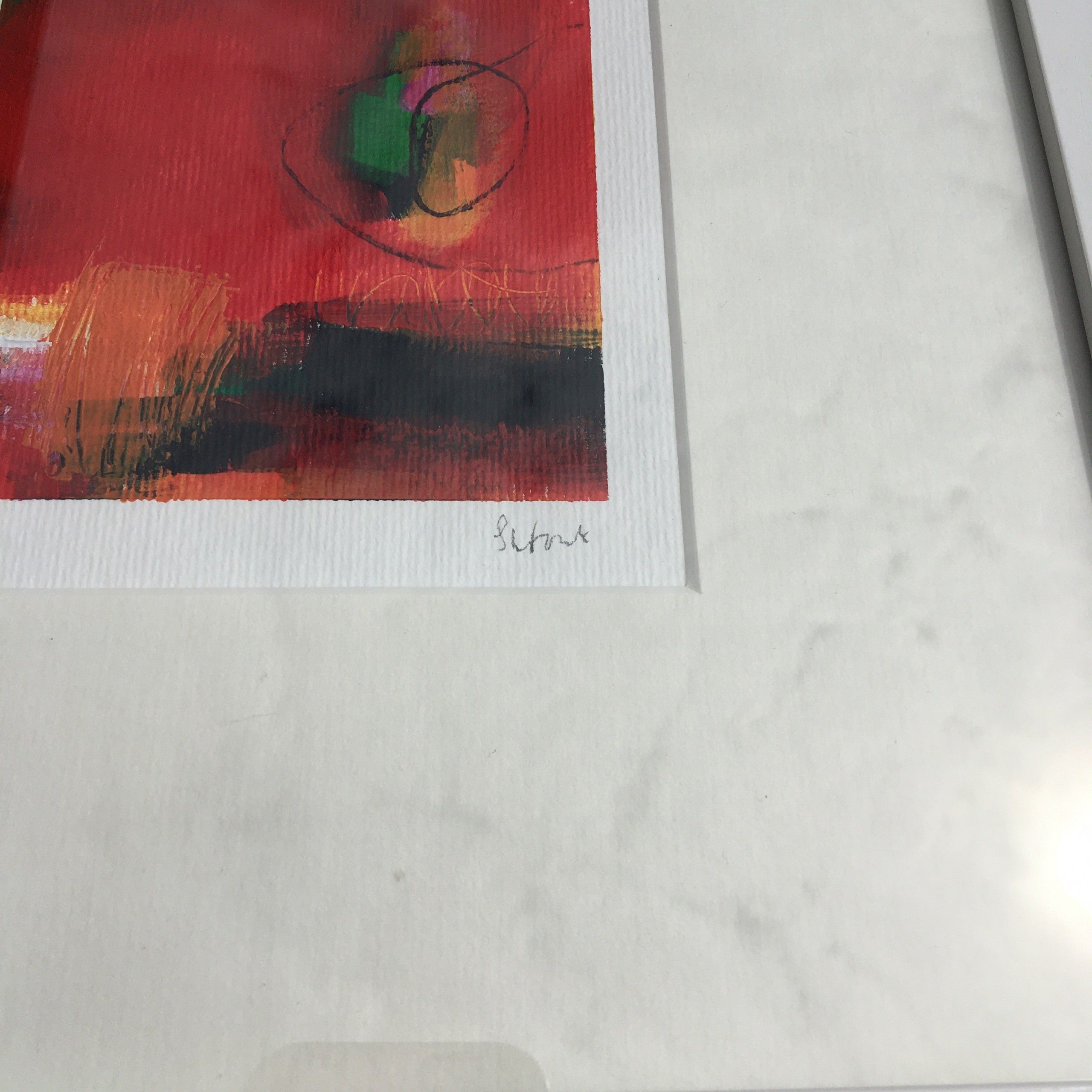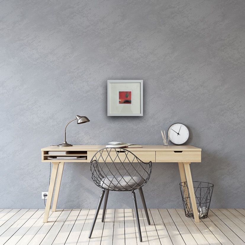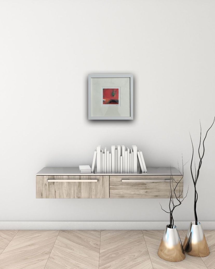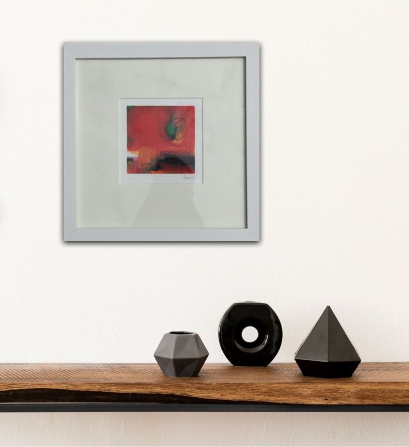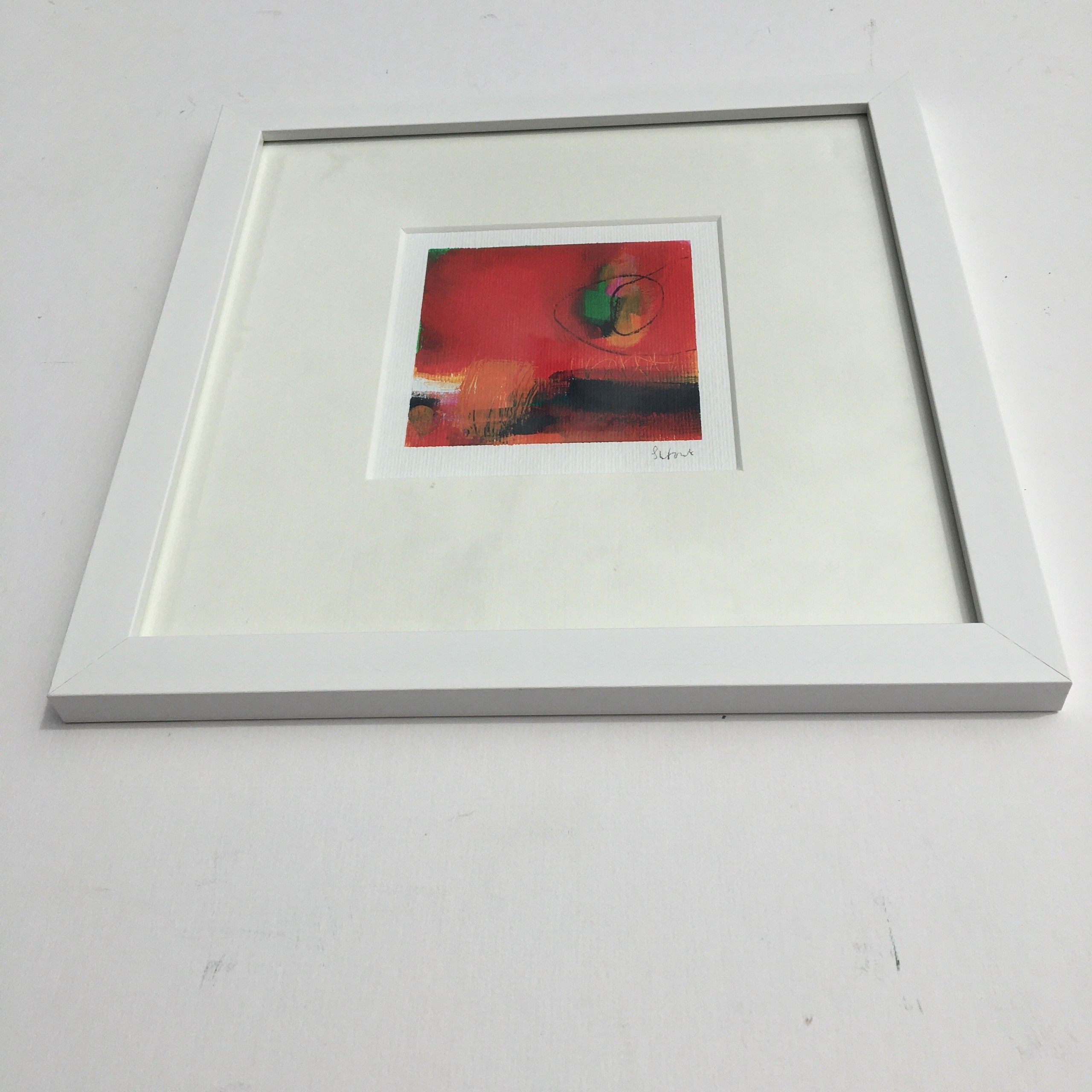 Sarah Foat Graffiti IV Contemporary Abstract Landscape Painting Acrylic Paint on Paper Image Size: H 10cm x W 10cm Framed Size: H 30cm x W 30cm x D 1cm Sold Framed in a White Frame Please note that insitu images are purely an indication of how a piece may look Graffiti IV is an original abstract painting by Sarah Foat. The bright