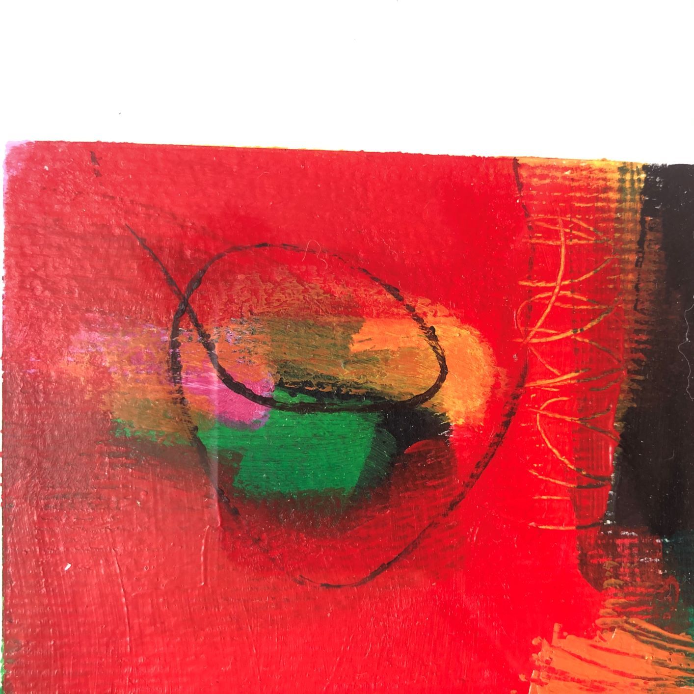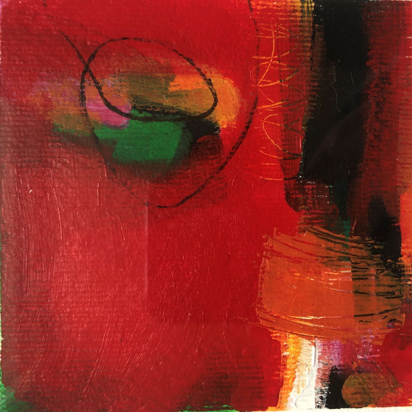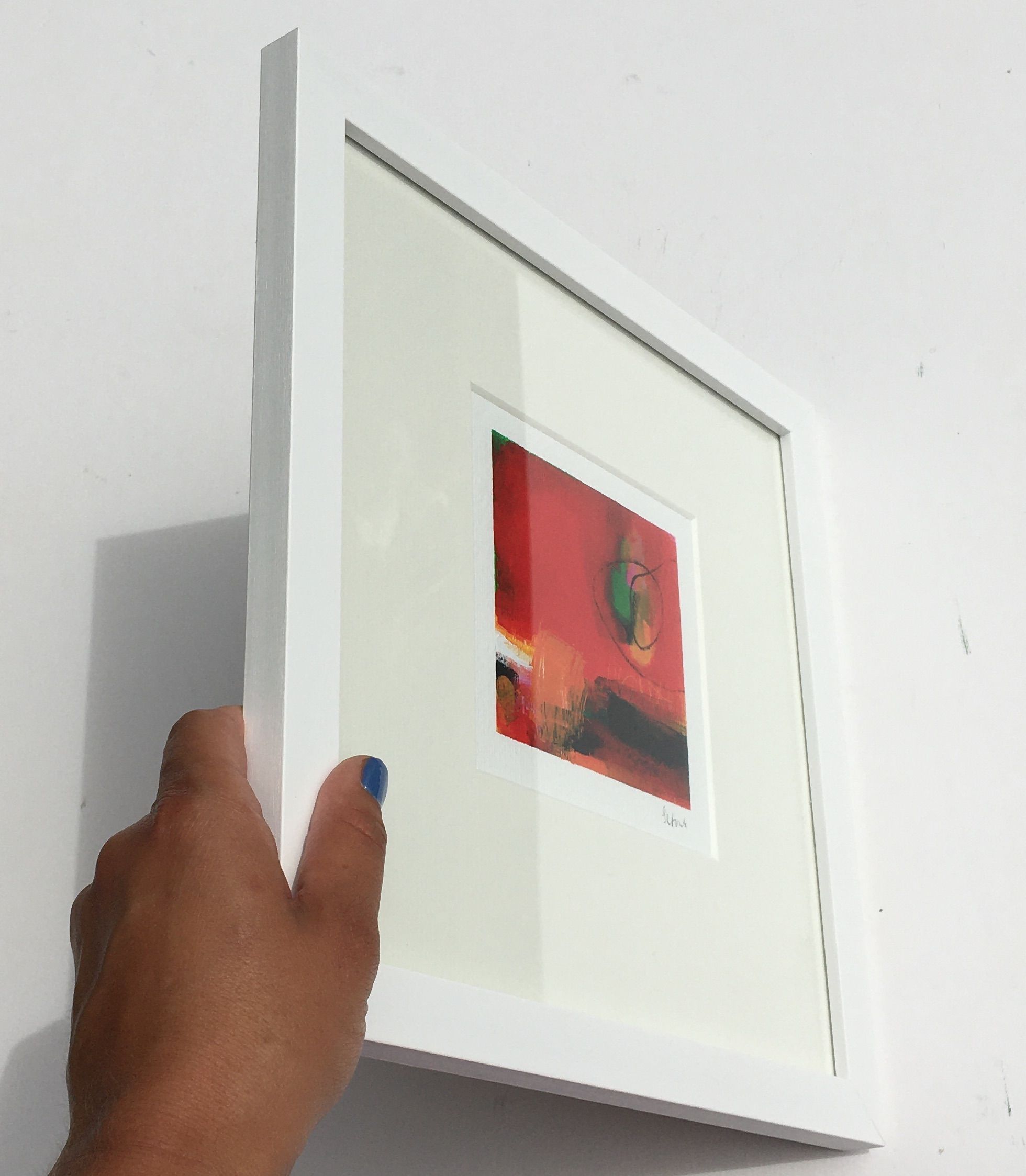 Sarah Foat Graffiti IV Contemporary Abstract Landscape Painting Acrylic Paint on Paper Image Size: H 10cm x W 10cm Framed Size: H 30cm x W 30cm x D 1cm Sold Framed in a White Frame Please note that insitu images are purely an indication of how a piece may look Graffiti IV is an original abstract painting by Sarah Foat. The bright