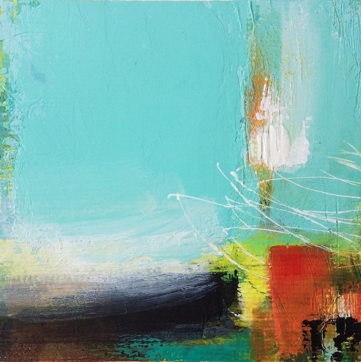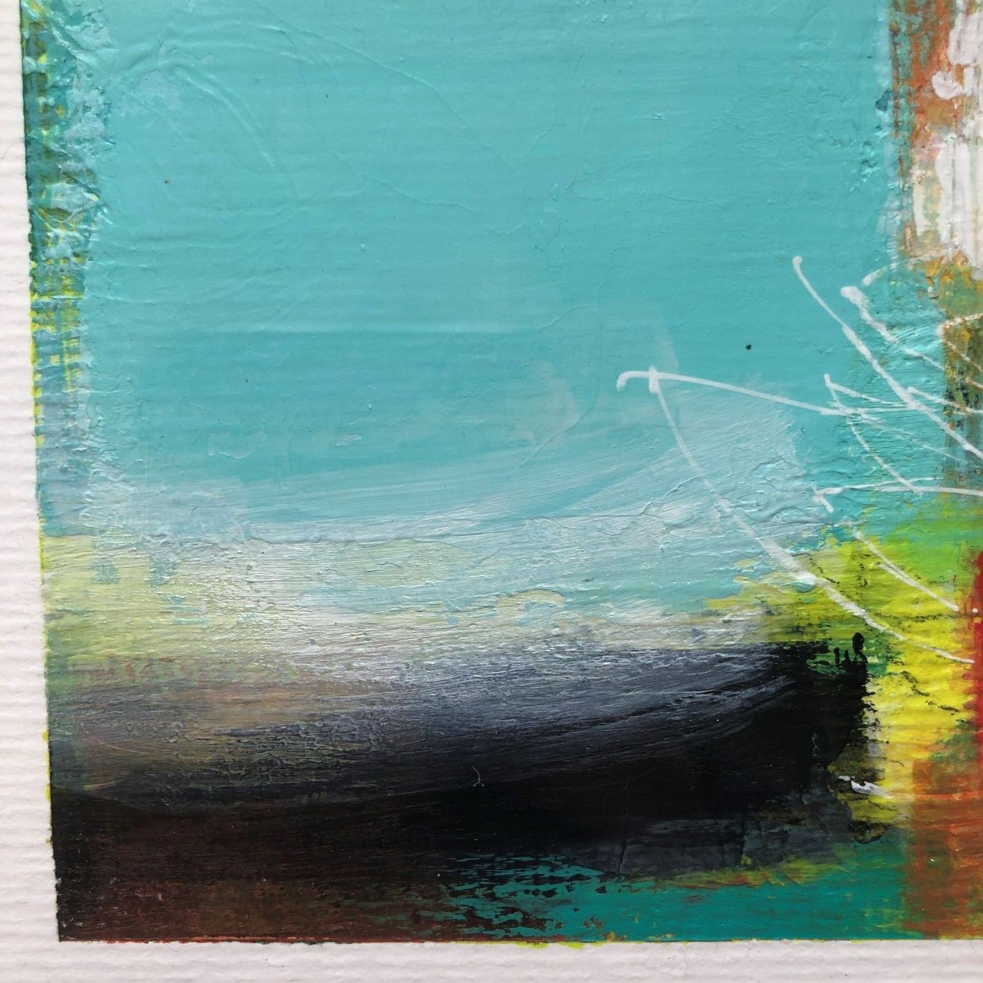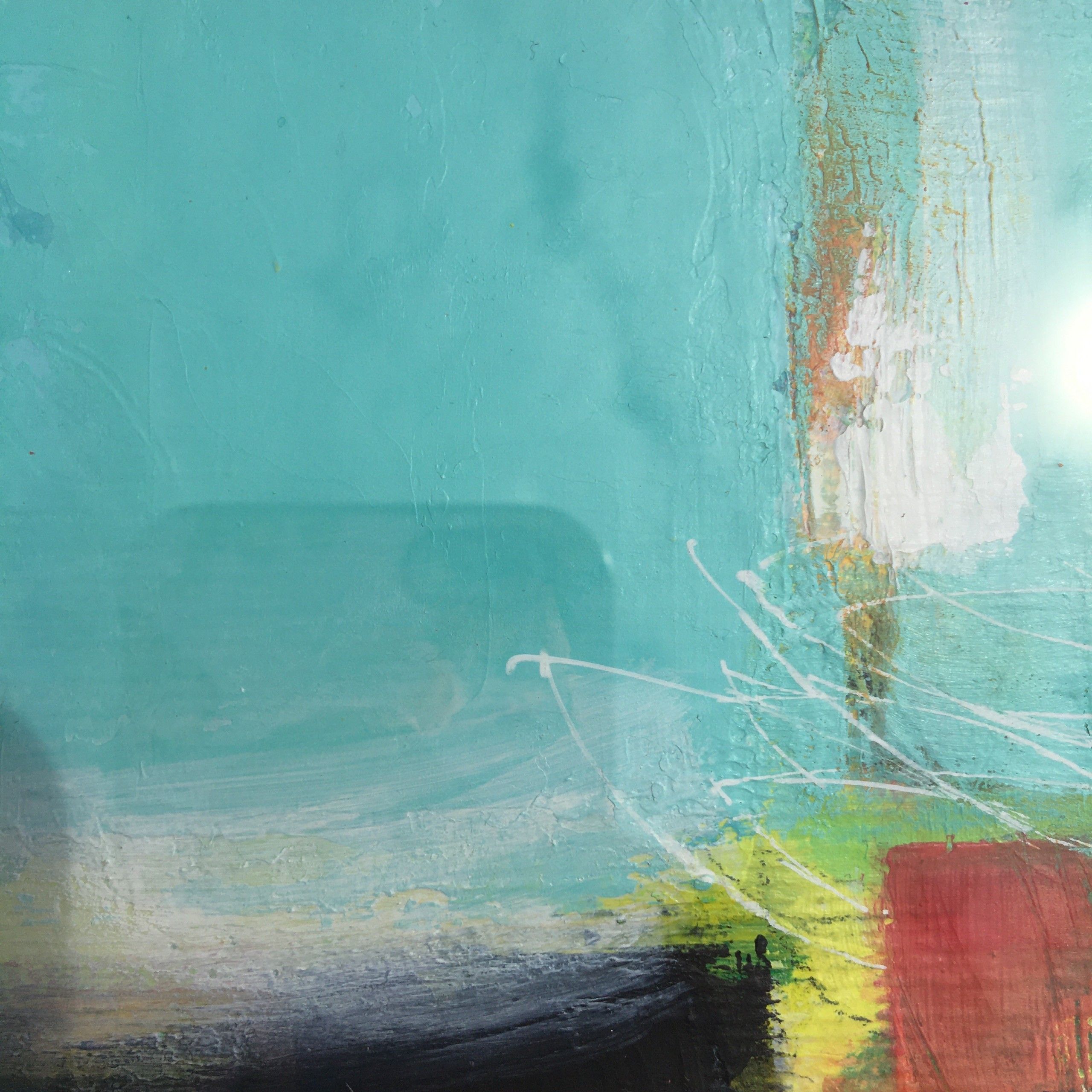 Sarah Foat Graffiti V Contemporary Abstract Landscape Painting Acrylic Paint on Paper Image Size: H 10cm x W 10cm Framed Size: H 30cm x W 30cm x D 1cm Sold Framed in a White Frame Please note that insitu images are purely an indication of how a piece may look Graffiti V is an original abstract painting by Sarah Foat. The vibrant