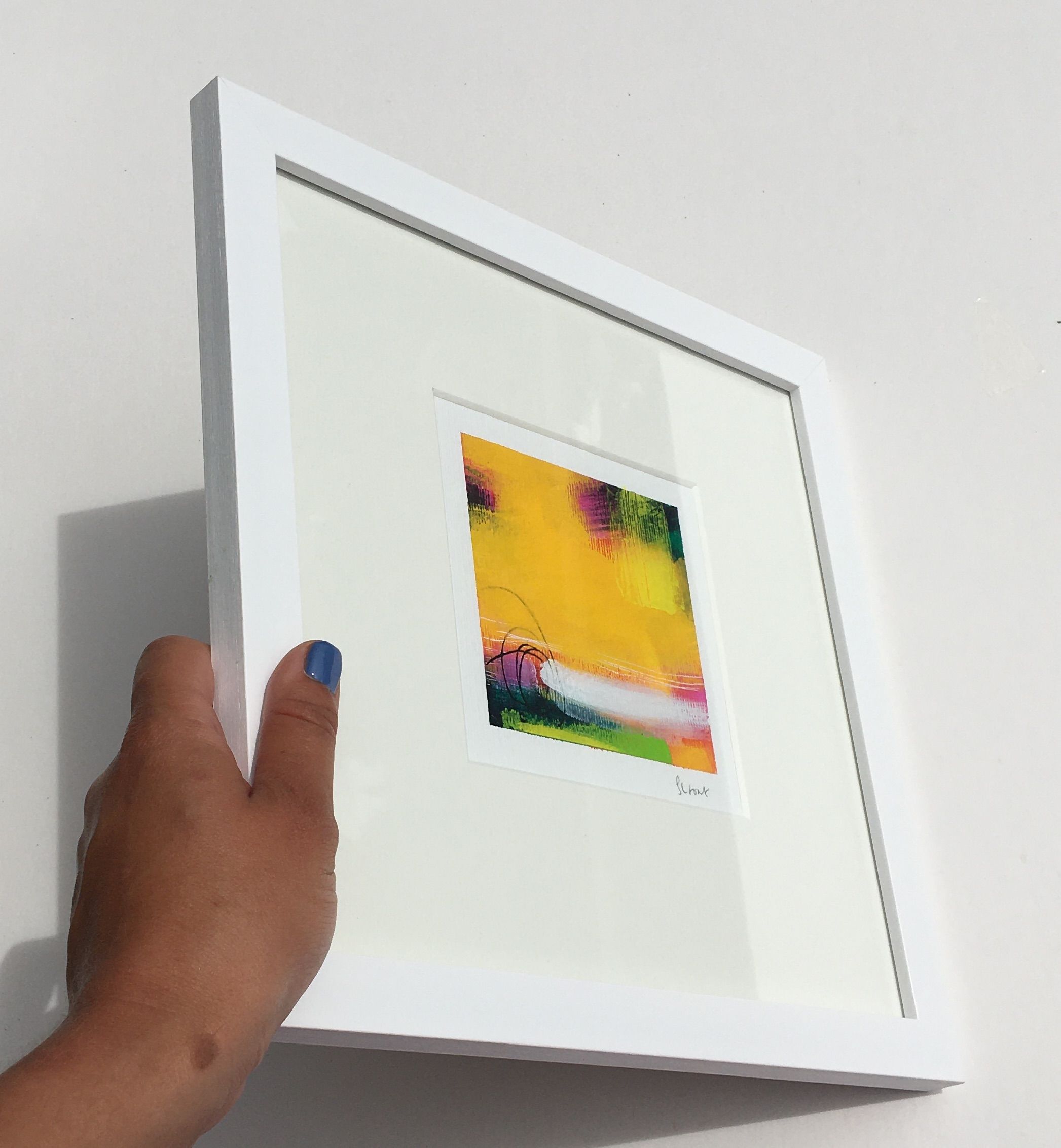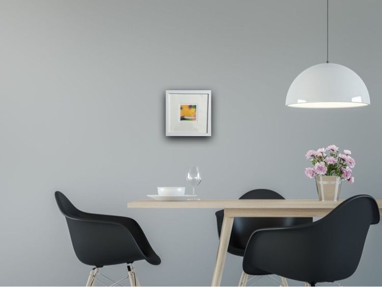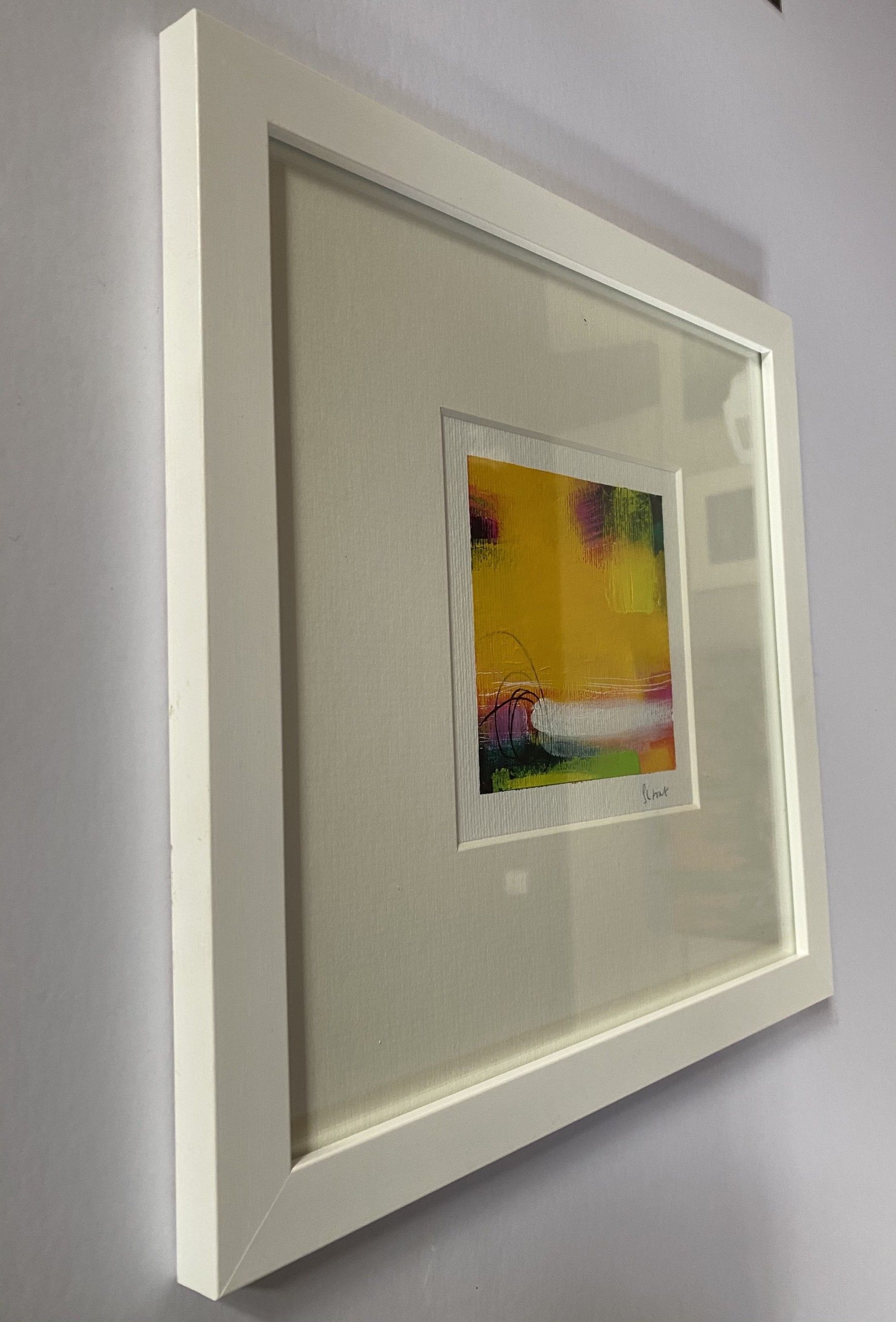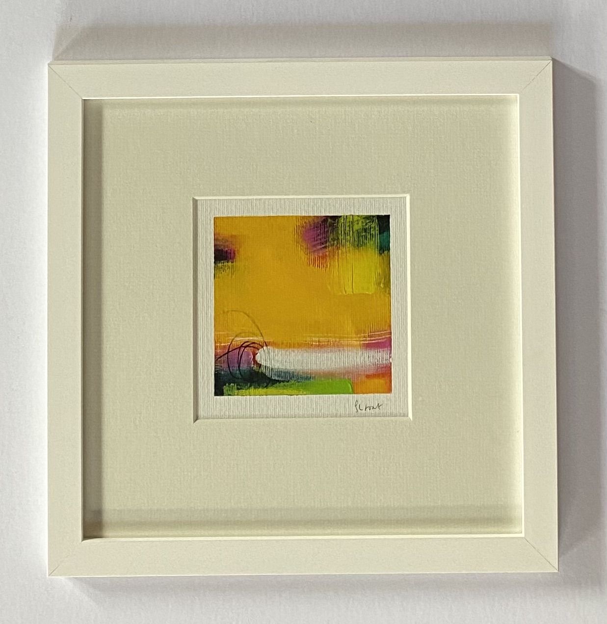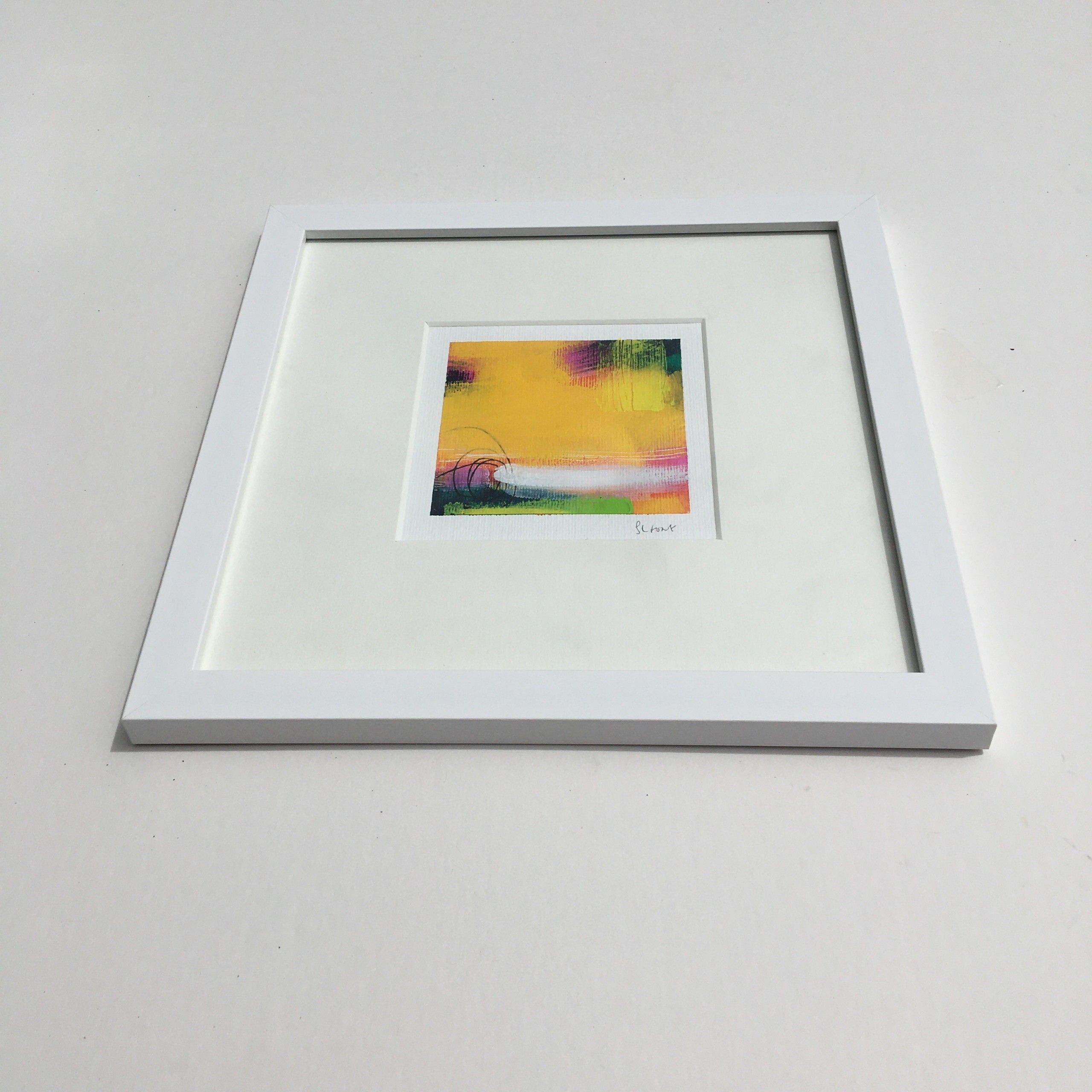 Sarah Foat Graffiti VII Contemporary Abstract Landscape Painting Acrylic Paint on Paper Image Size: H 10cm x W 10cm Framed Size: H 30cm x W 30cm x D 1cm Sold Framed in a White Frame Please note that insitu images are purely an indication of how a piece may look Graffiti VII is an original abstract painting by Sarah Foat. This bright