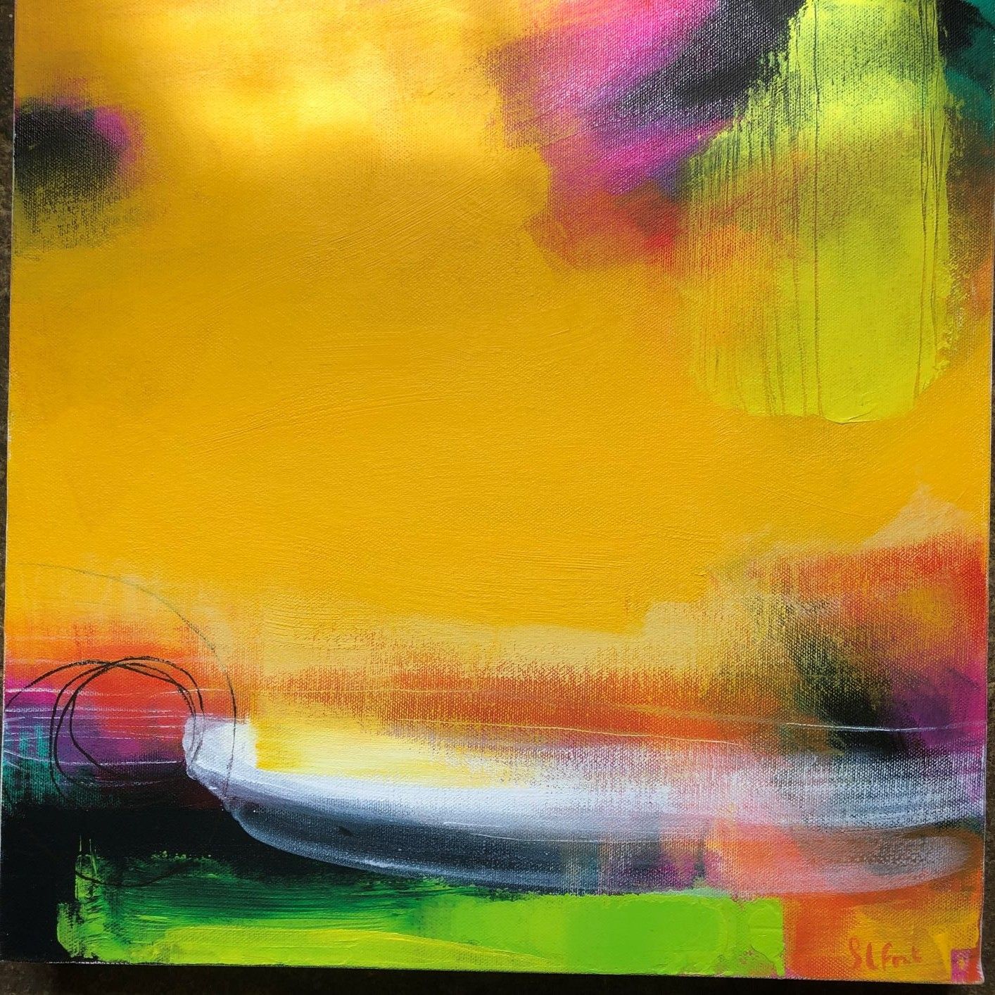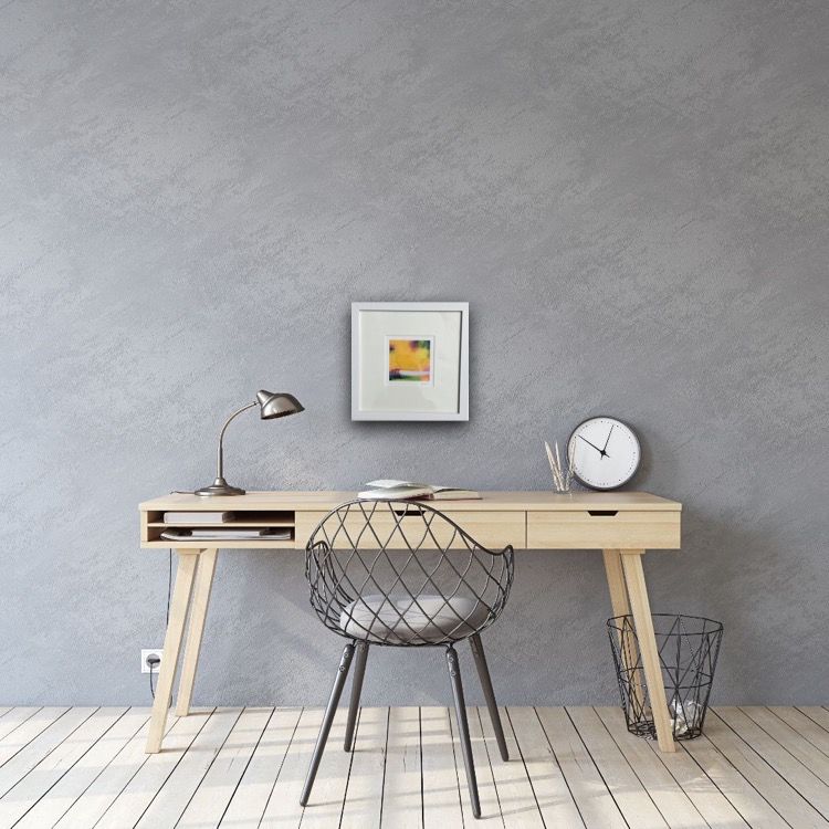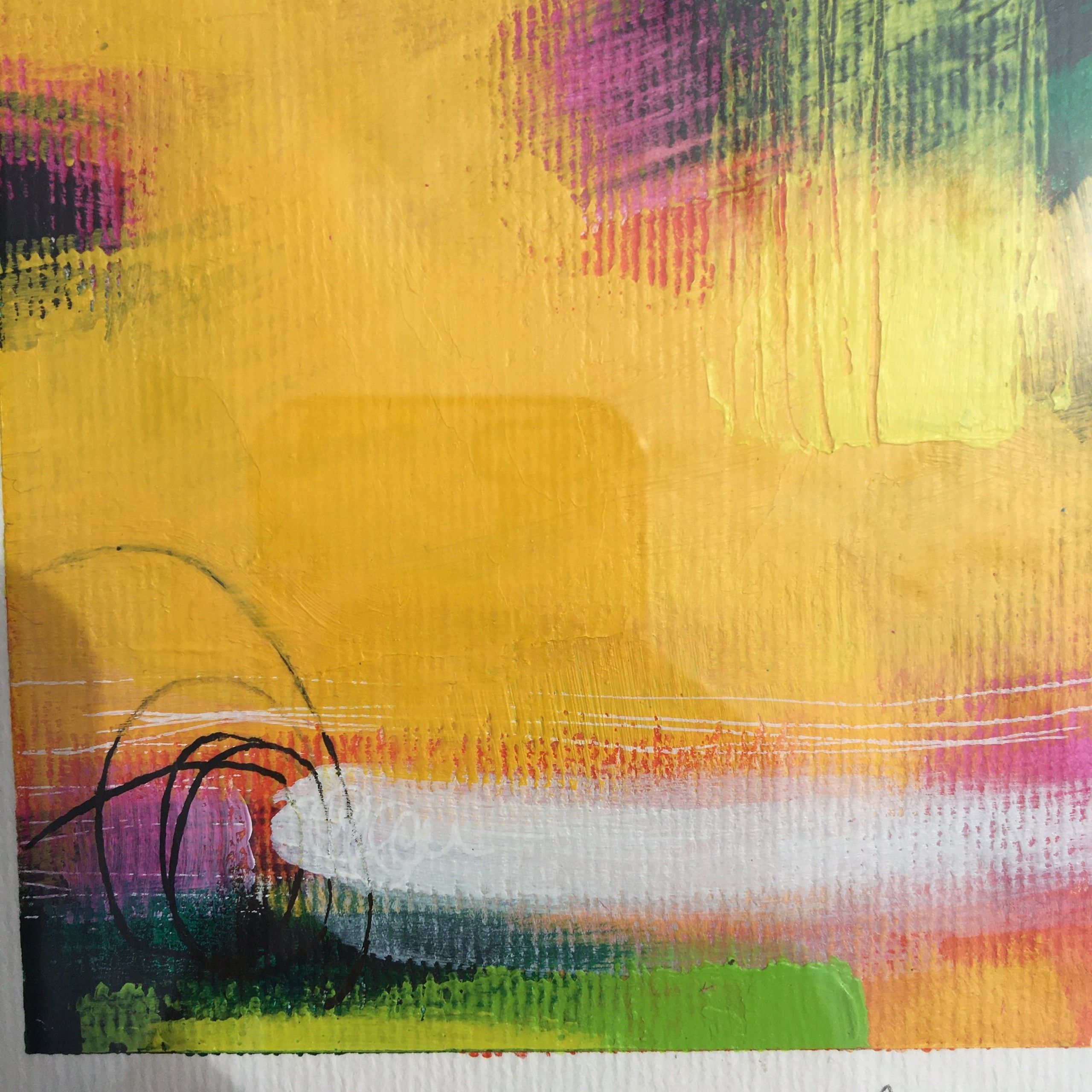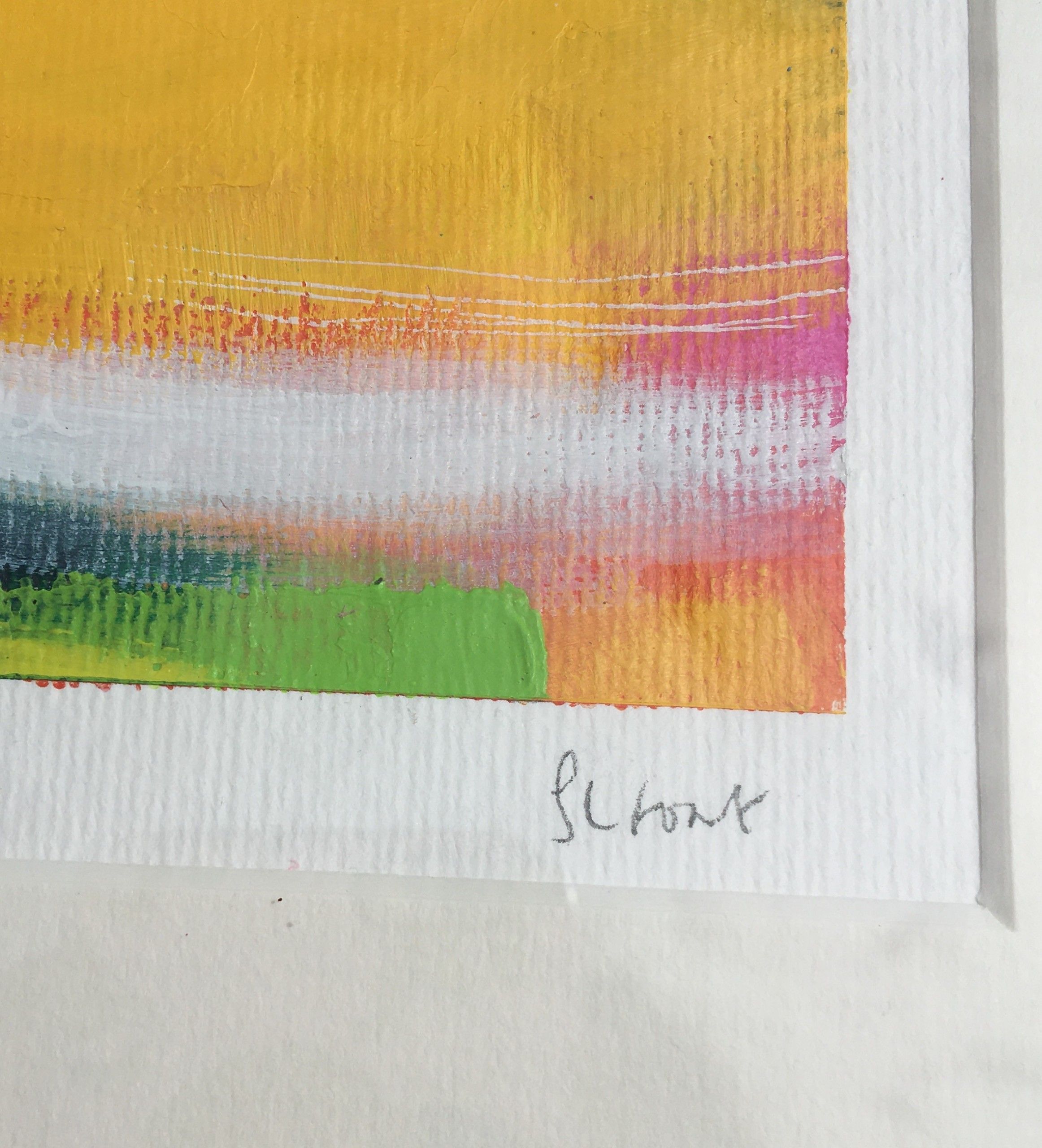 Sarah Foat Graffiti VII Contemporary Abstract Landscape Painting Acrylic Paint on Paper Image Size: H 10cm x W 10cm Framed Size: H 30cm x W 30cm x D 1cm Sold Framed in a White Frame Please note that insitu images are purely an indication of how a piece may look Graffiti VII is an original abstract painting by Sarah Foat. This bright