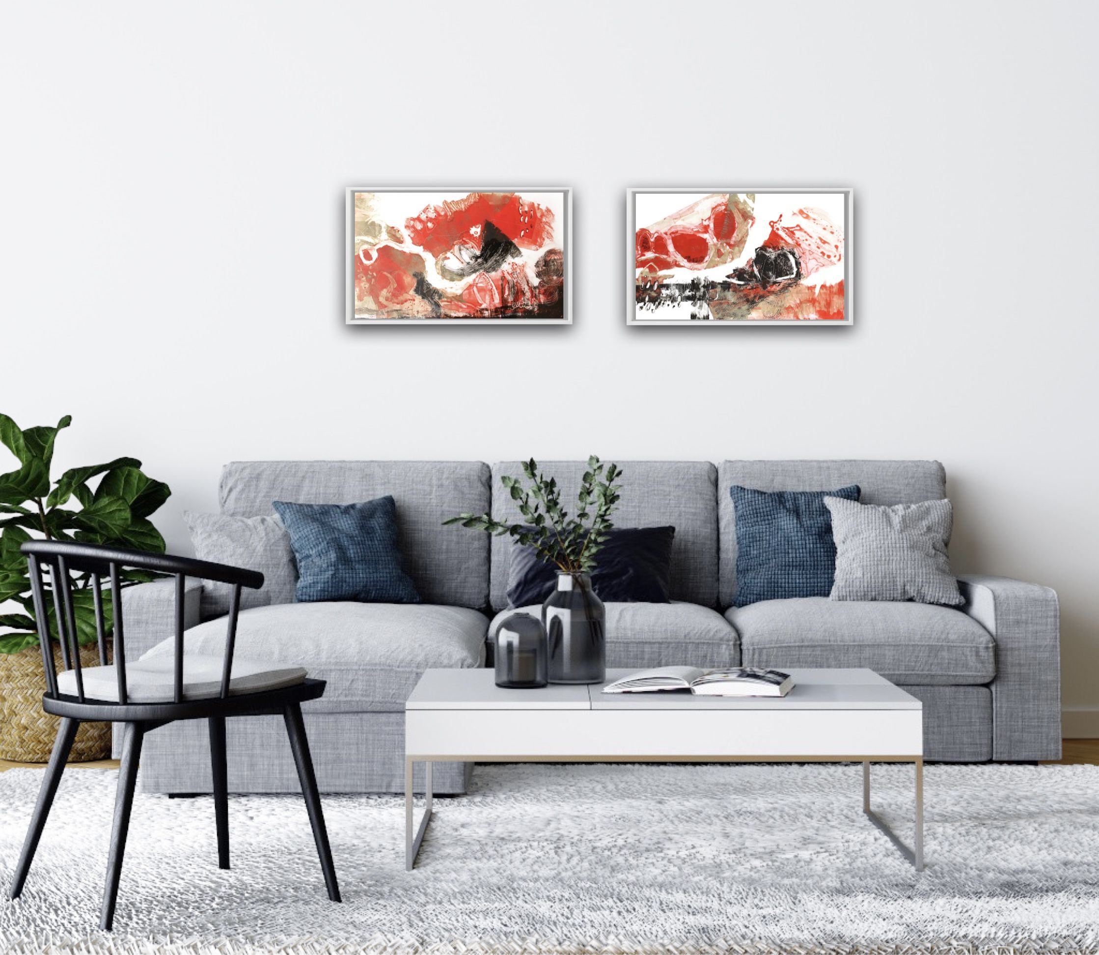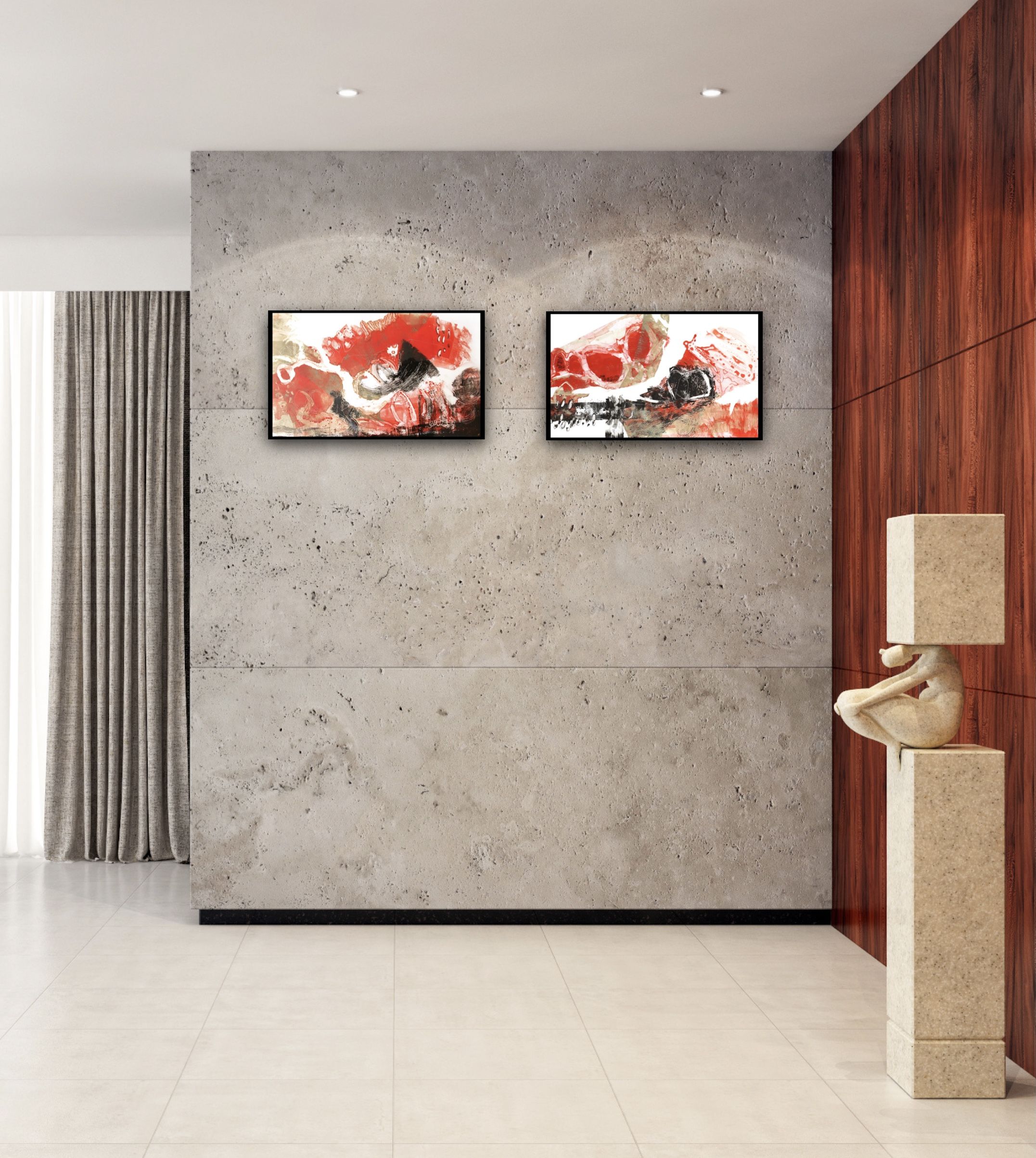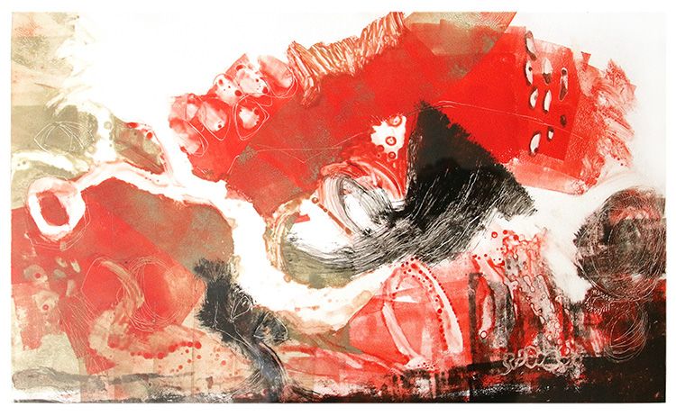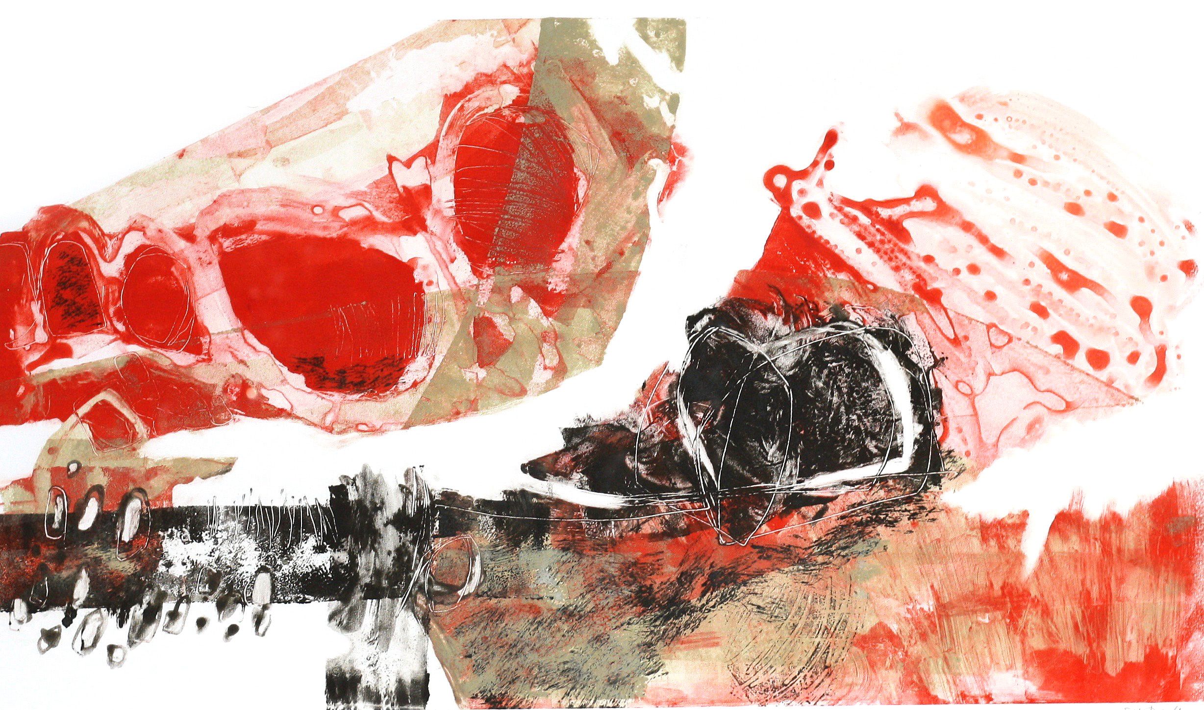 Leave No Trace and Crazy days, City Lights diptych By Sarah Russell. Overall size cm : H74 x W120. Leave No Trace, Monotype (one-off). Monoprint on Paper. Size: H 37cm x W 60cm. Part of a series ‘Ancient Paths’ investigating the bare bones of the landscape. In this case looking at our