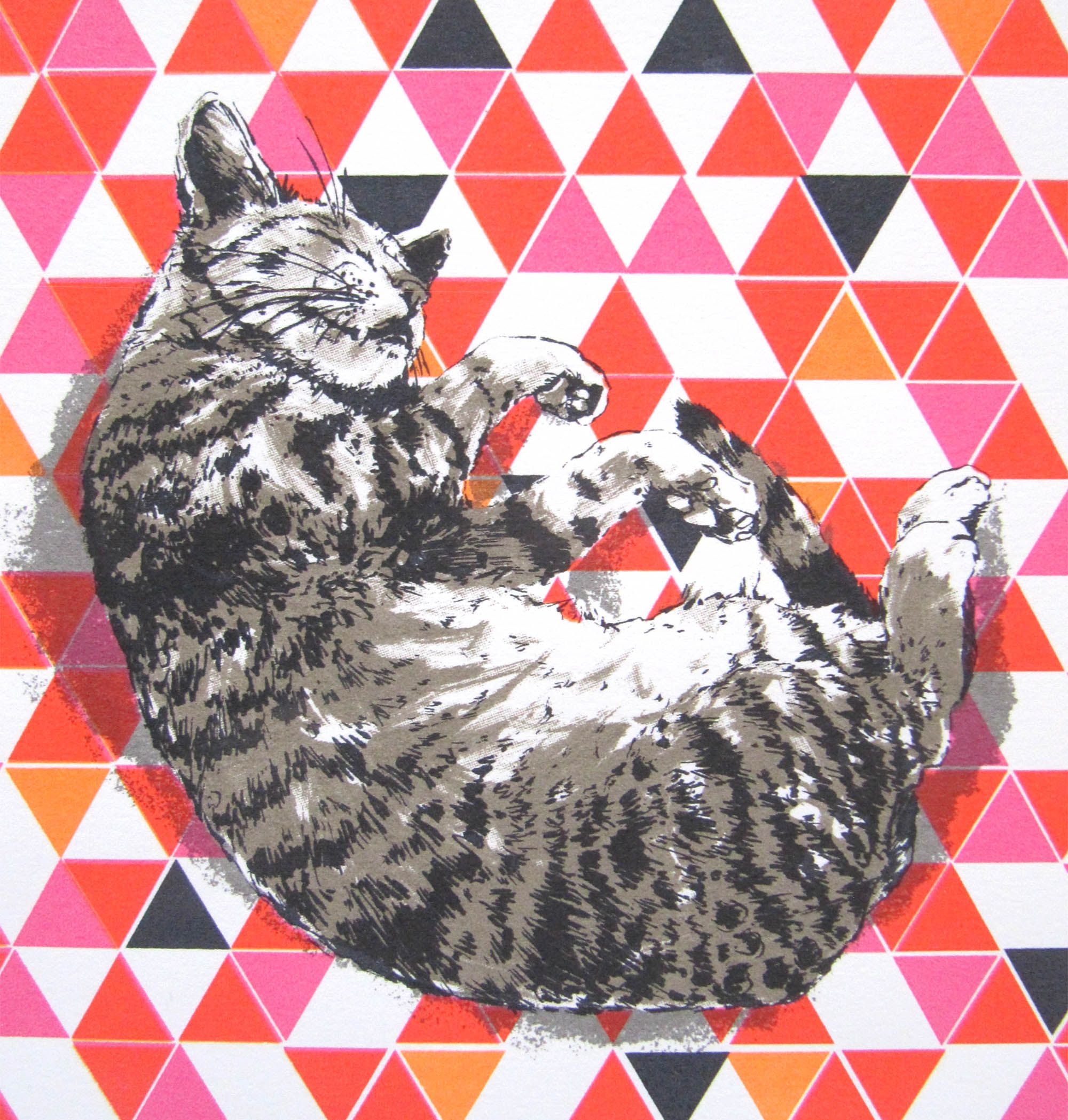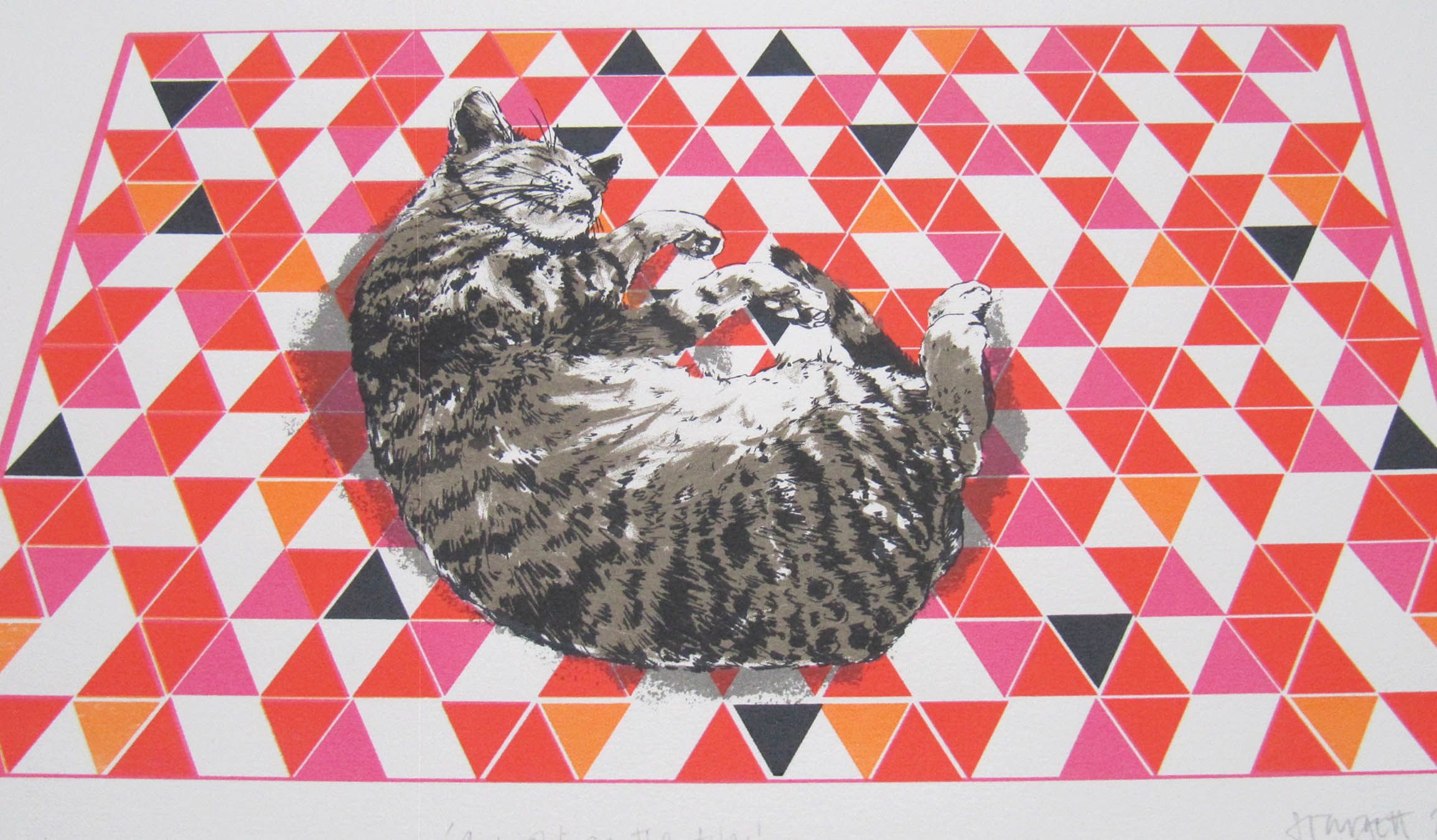 Limited edition 4 colour Screenprint. Handprinted on Fabriano paper it depicts a happily sleeping cat on a colourful geometric rug. Signed and numbered by the artist. Due to the hand printed nature of these prints there may be a slight variation between each piece. The colours in the prints have been represented as