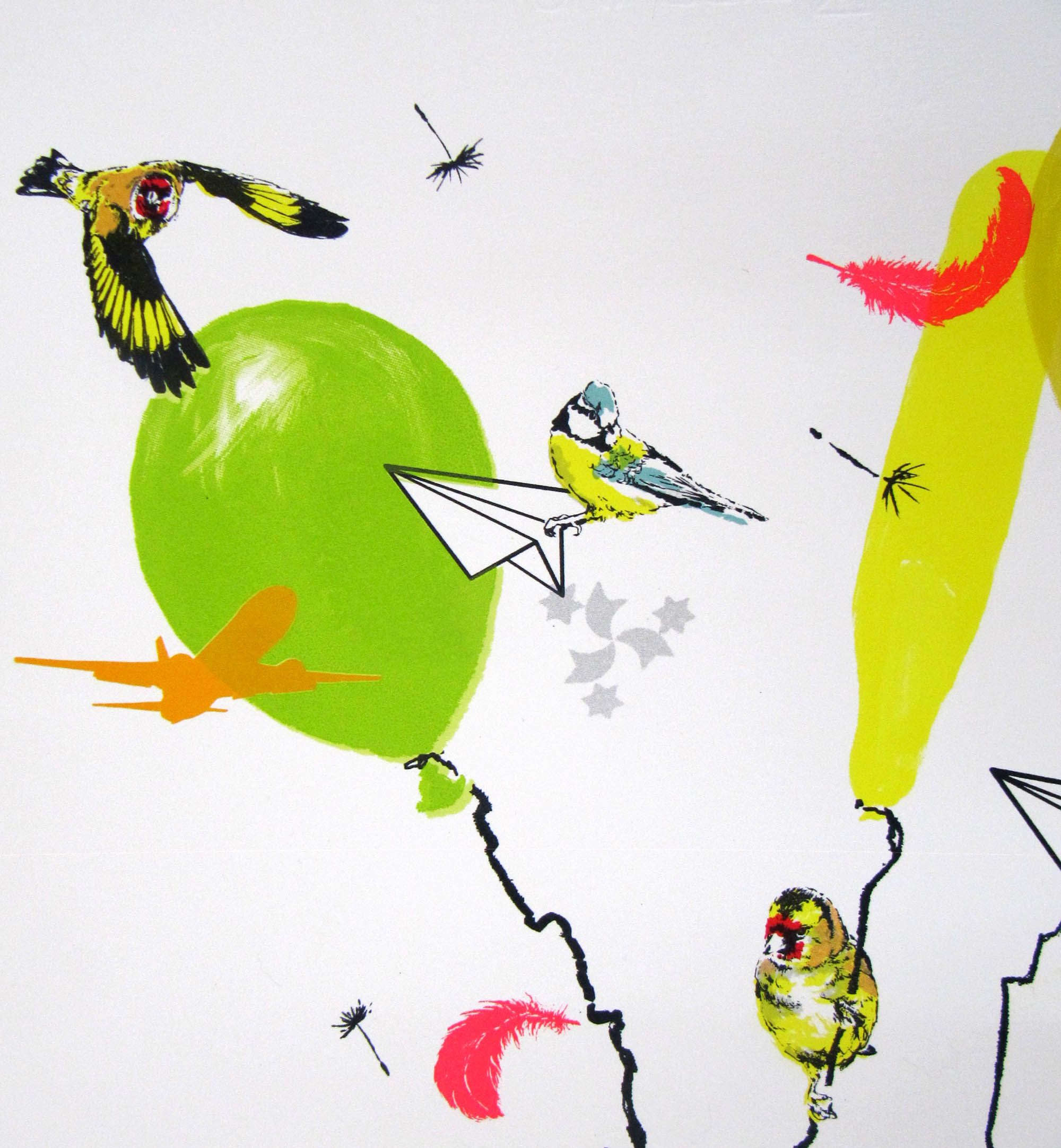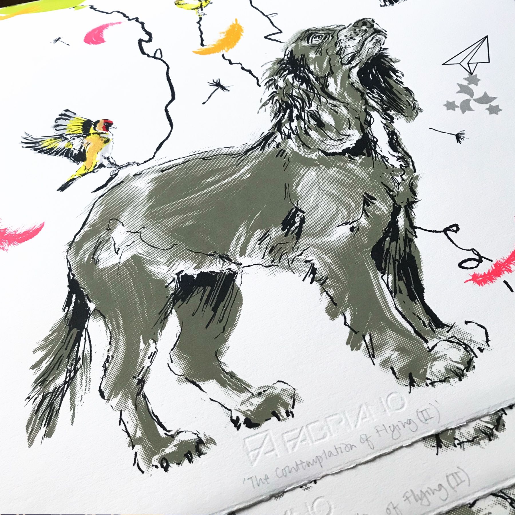Limited edition 11 colour Screenprint. Handprinted on Fabriano paper it is inspired by the dream of flying. A wistful spaniel is watches the unobtainable flying objects and birds around him. The print has a flash gold ink on the finches and printed silver stars. Signed and numbered by the artist. Due to