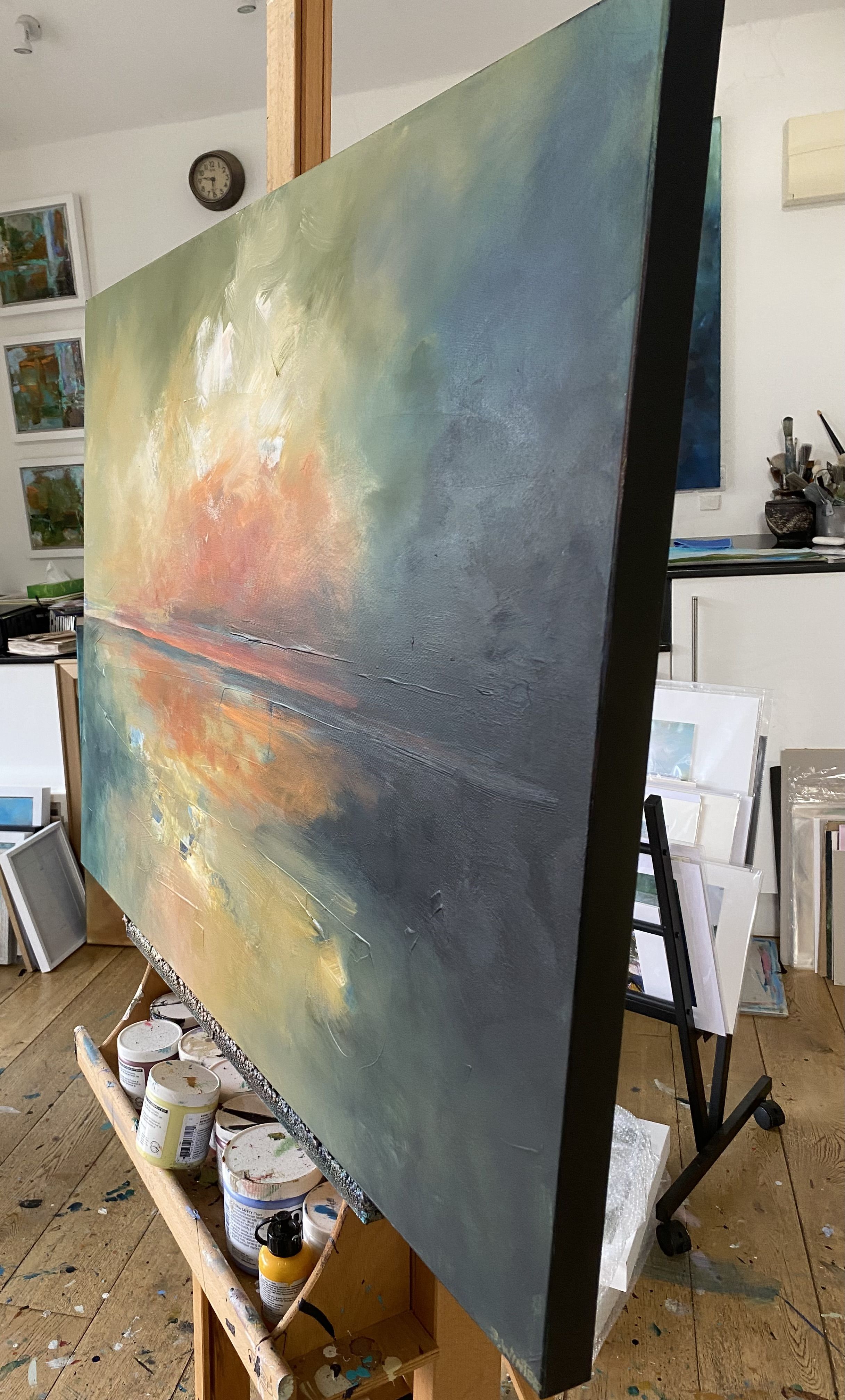 When I painted 'Sea Of Elusion' the contrast of colours were mesmerising, a moment in nature, full of atmosphere. The deep blues of the sea and the horizon create a sense of vastness and tranquility. The orange washes over the horizon giving light with its golden hues.