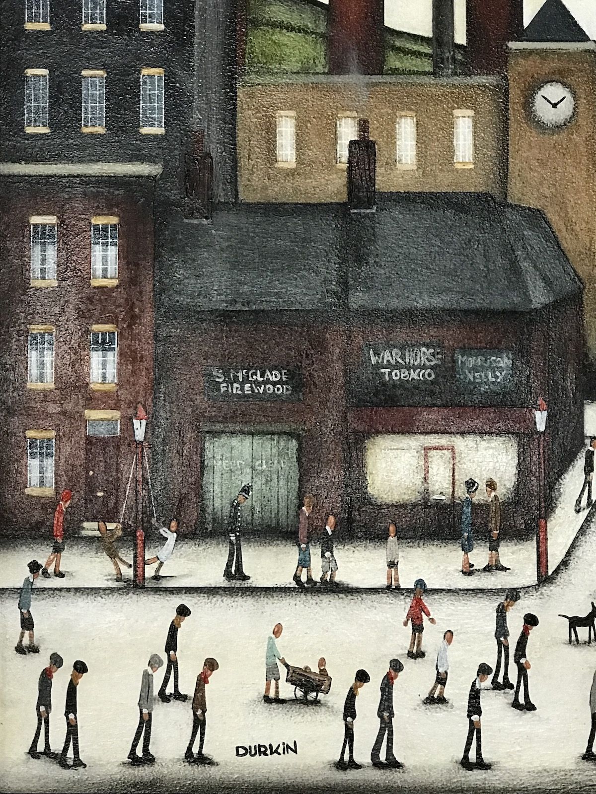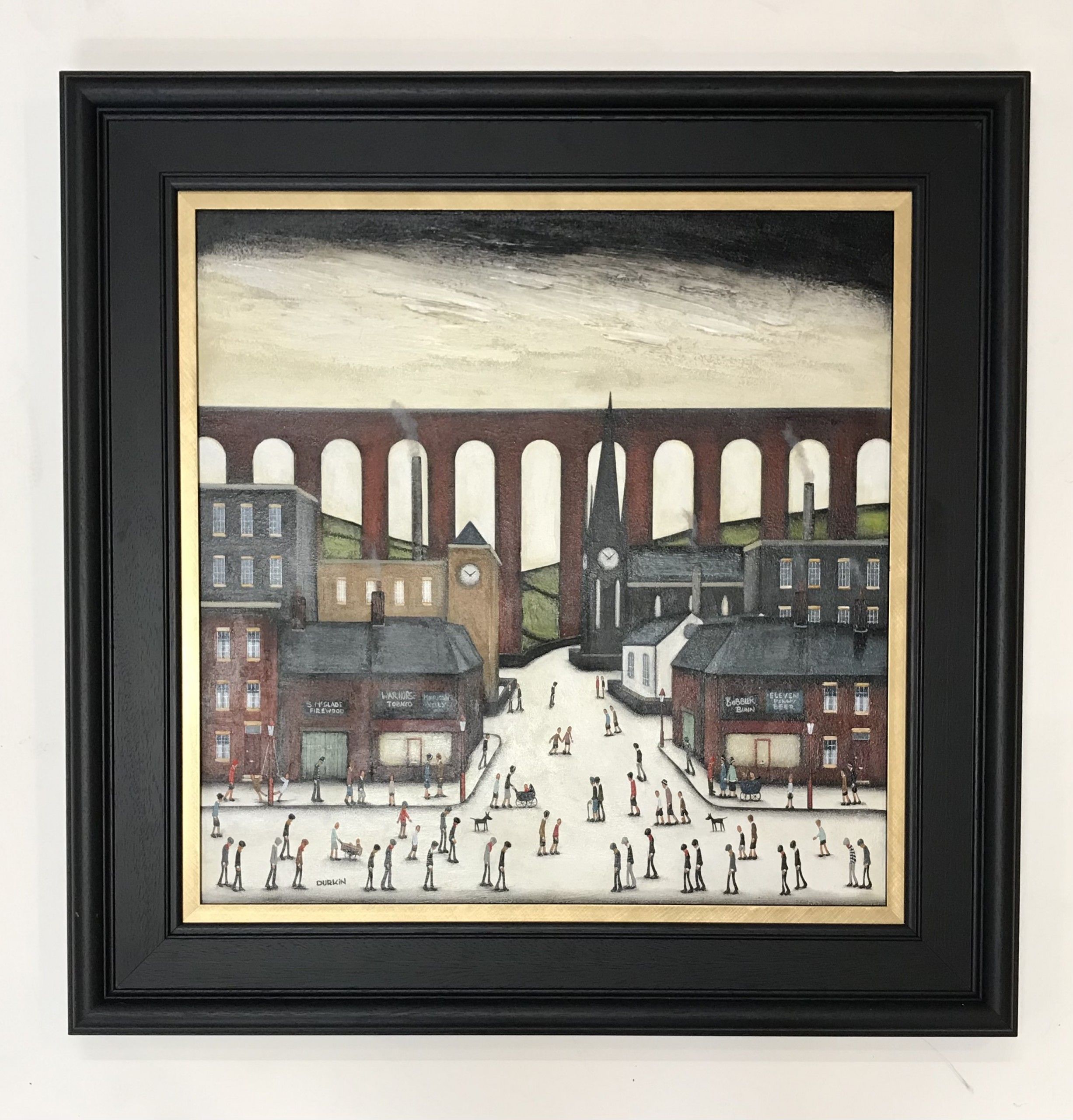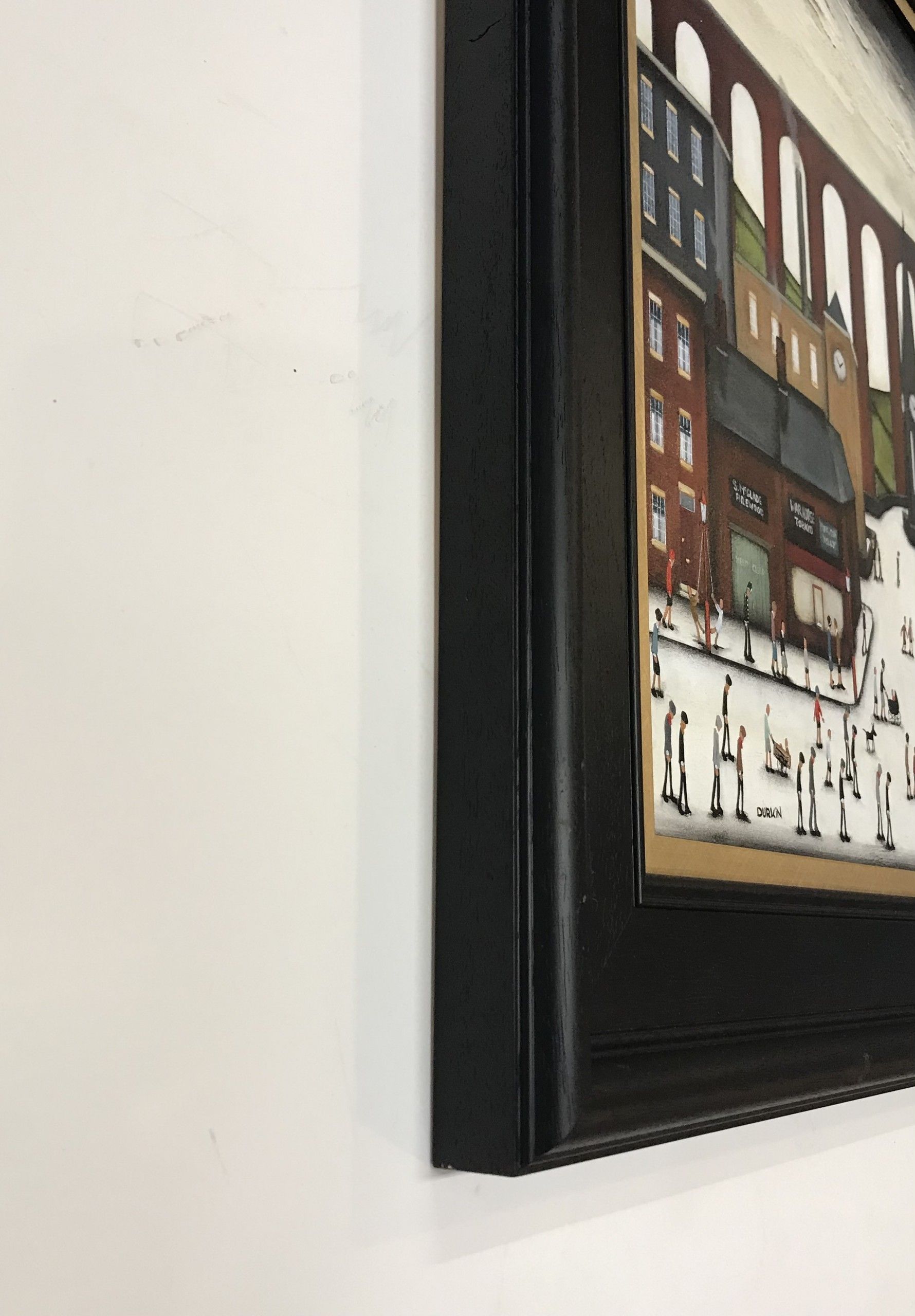 Bustle Under the Viaduct is an original acrylic painting by Sean Durkin. It depicts a busy town centre with Sean's classic figures going about their daily lives. As with all of Sean's works this painting includes his trade mark characters of the robber and policeman.