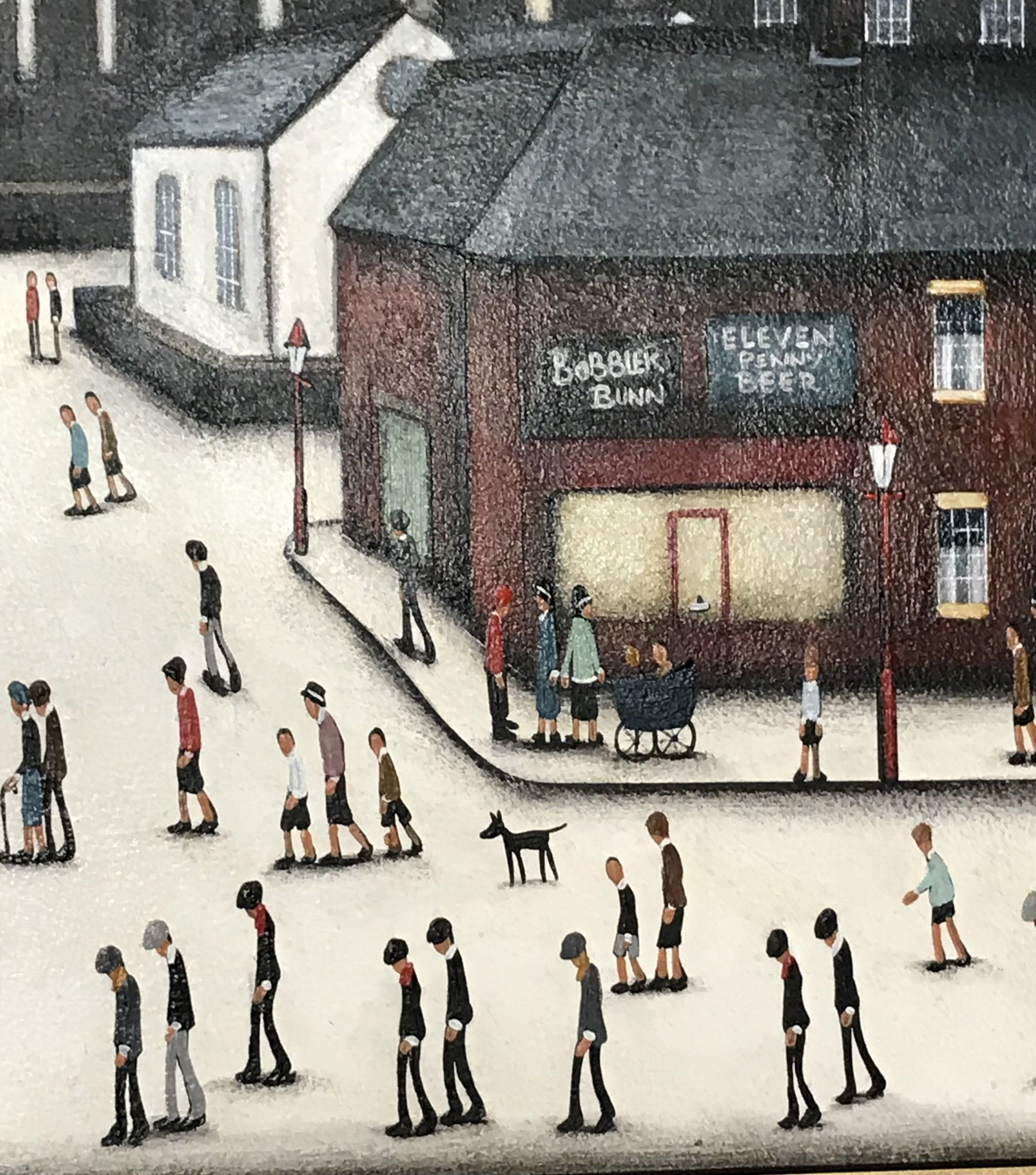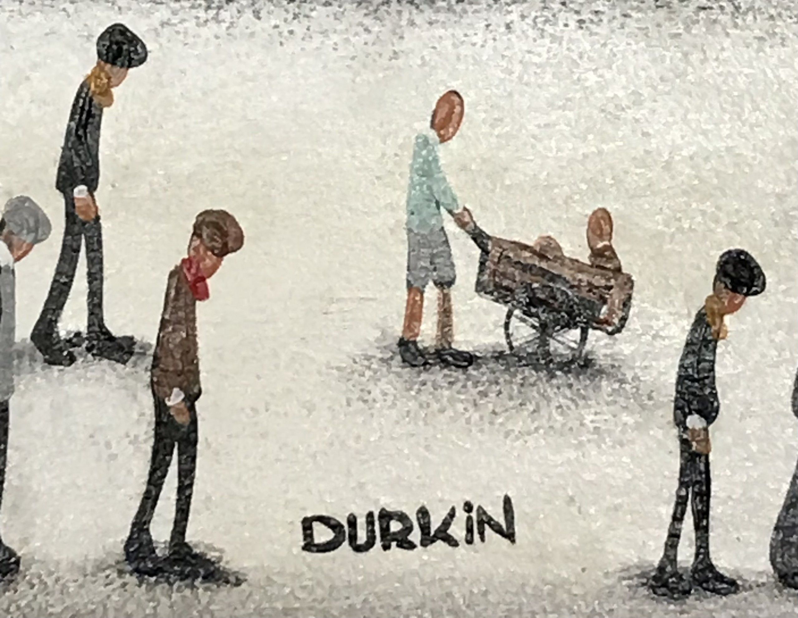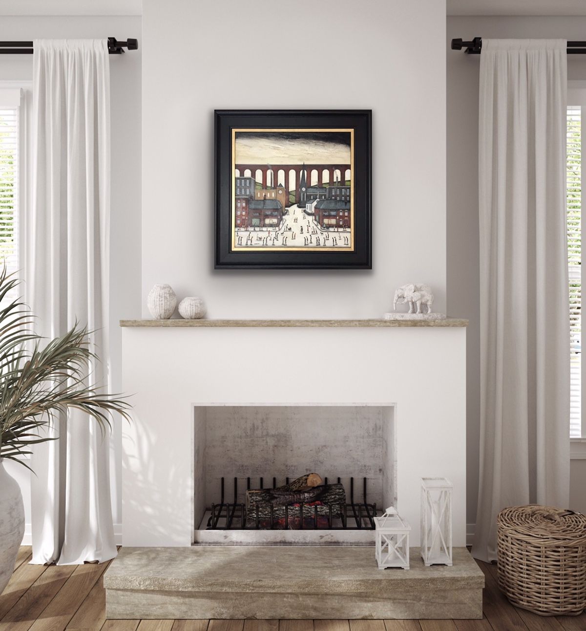 Bustle Under the Viaduct is an original acrylic painting by Sean Durkin. It depicts a busy town centre with Sean's classic figures going about their daily lives. As with all of Sean's works this painting includes his trade mark characters of the robber and policeman.