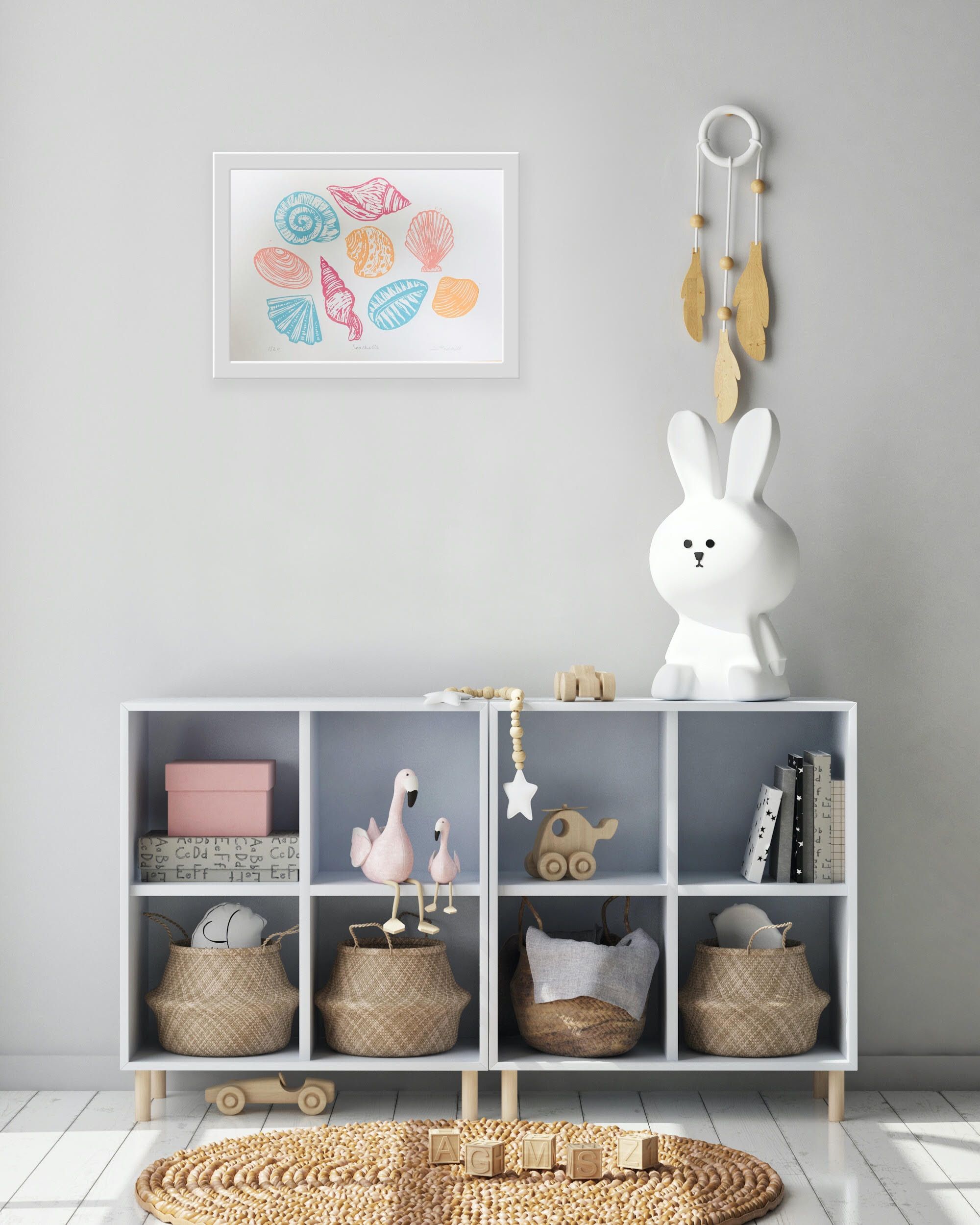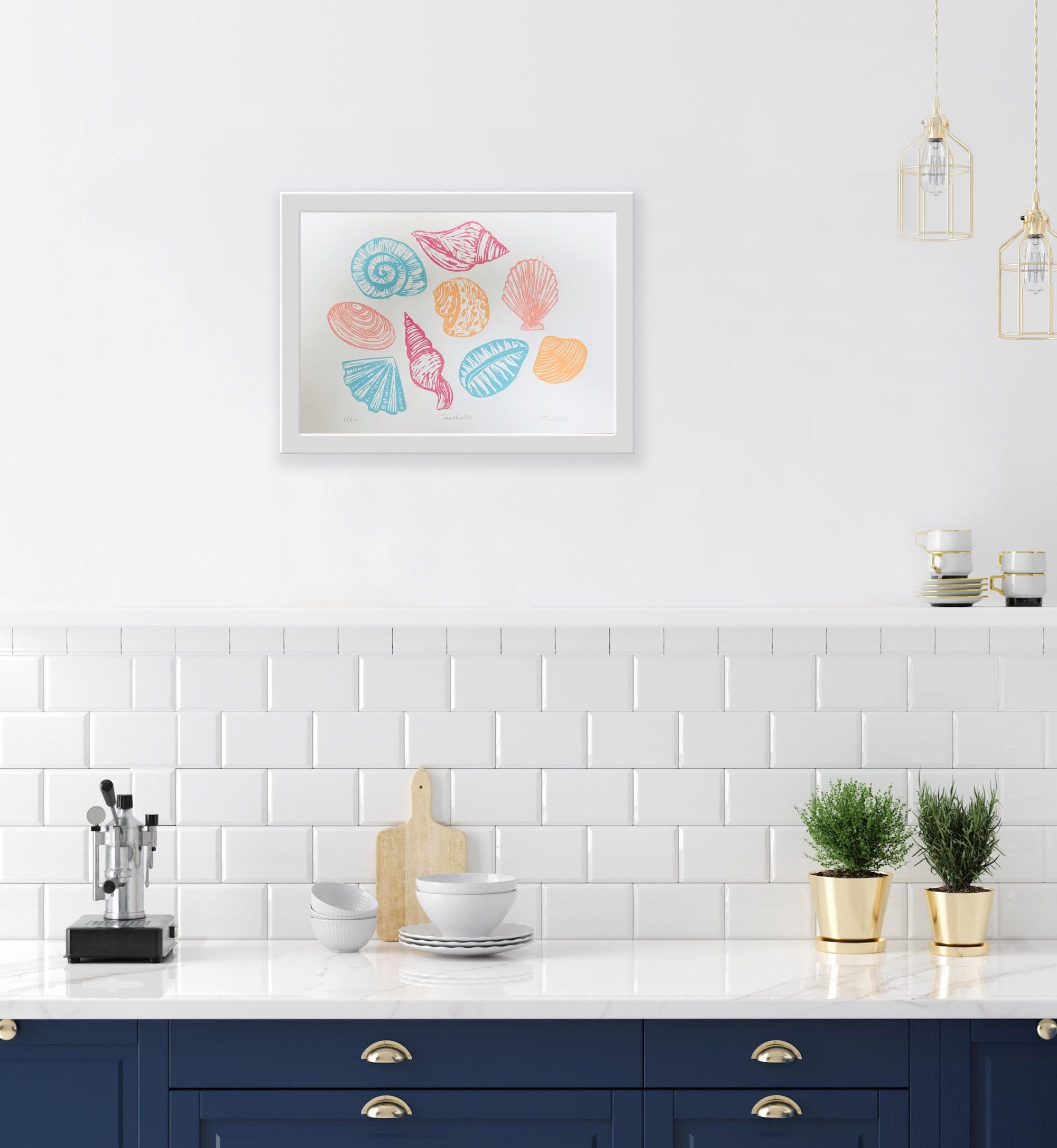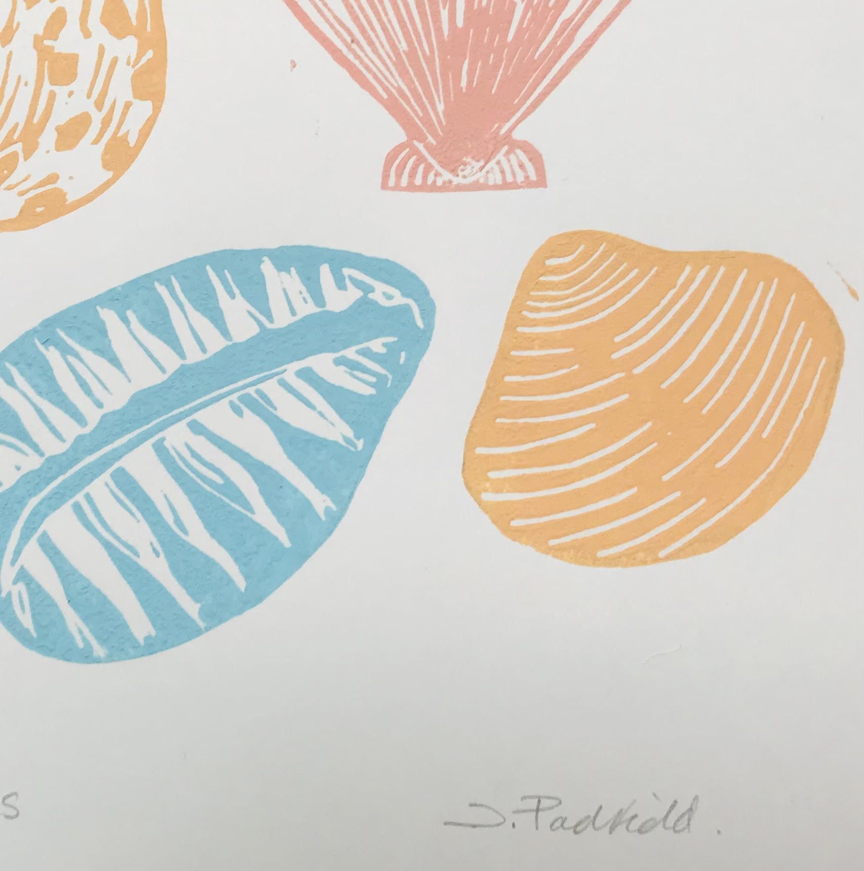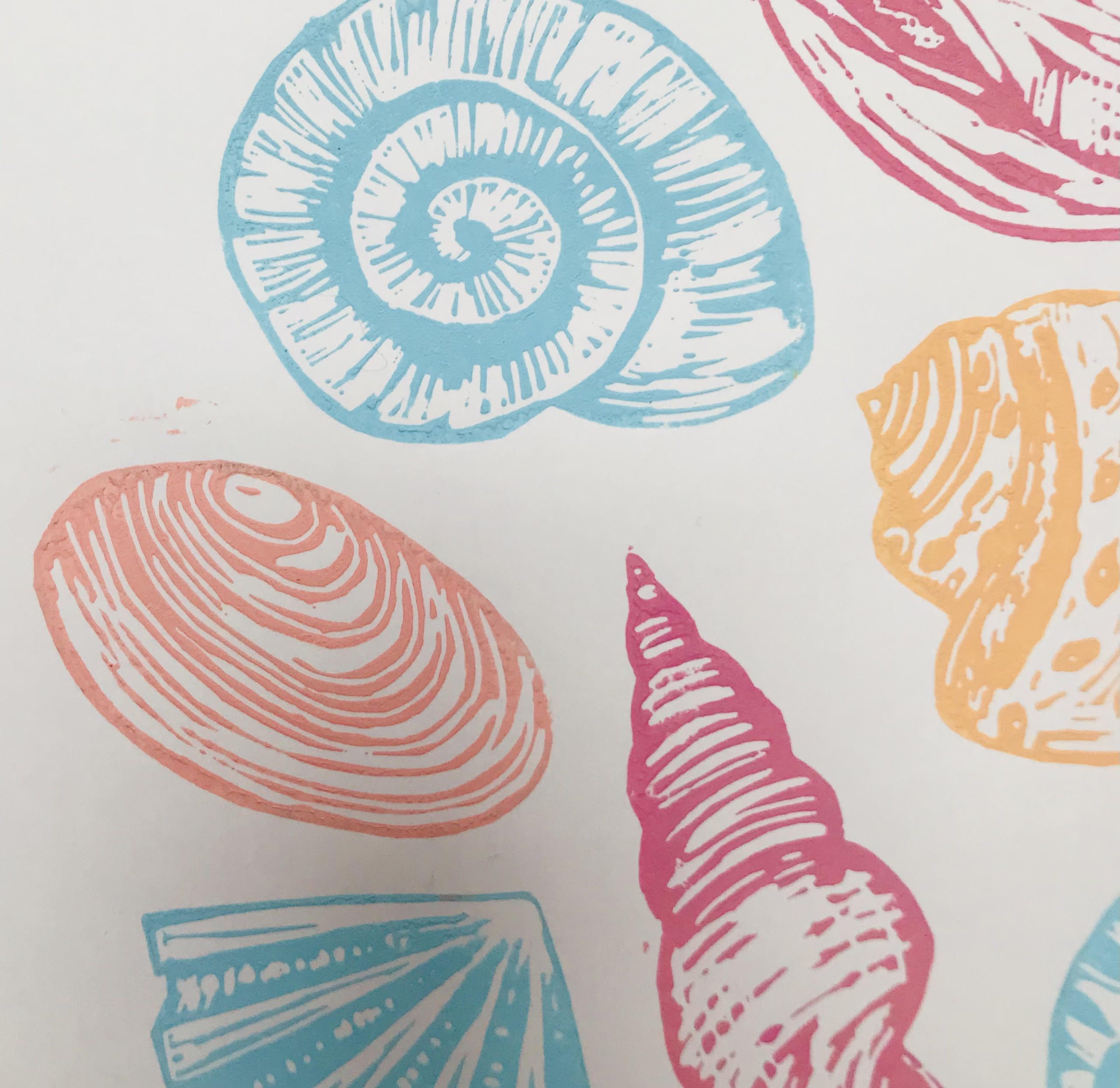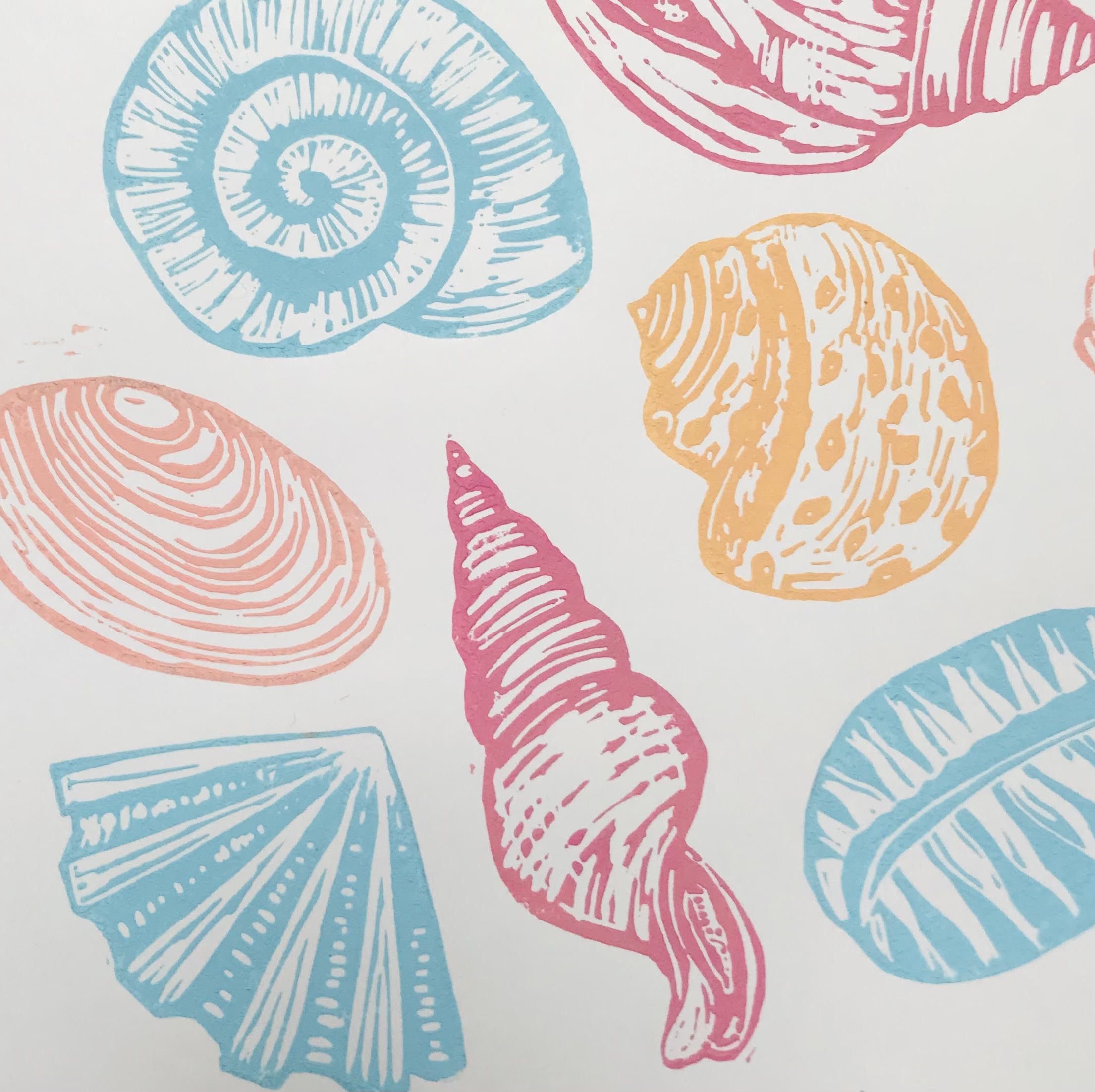 Seashells is part of a collection of linocut prints that are inspired by sea shells , small sea creatures and things found on the beach. This original linocut print is of a selection of different shells, in colourful pink, coral, orange and blue. Each print is hand printed and unique.