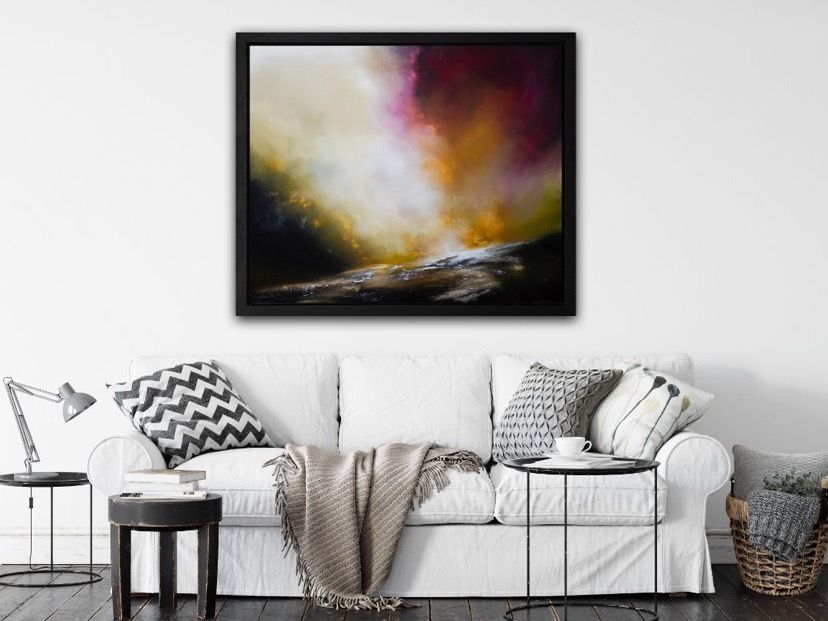 Sheryl Roberts The Edge of Lightness Original Abstract Painting Oil and Acrylic Paint on Canvas Framed Size: H 113 x W 133cm (Please note that in situ images are purely an indication of how a piece may look). A large dramatic piece capturing the power of the light penetrating the vast skies. Painted in oils and
