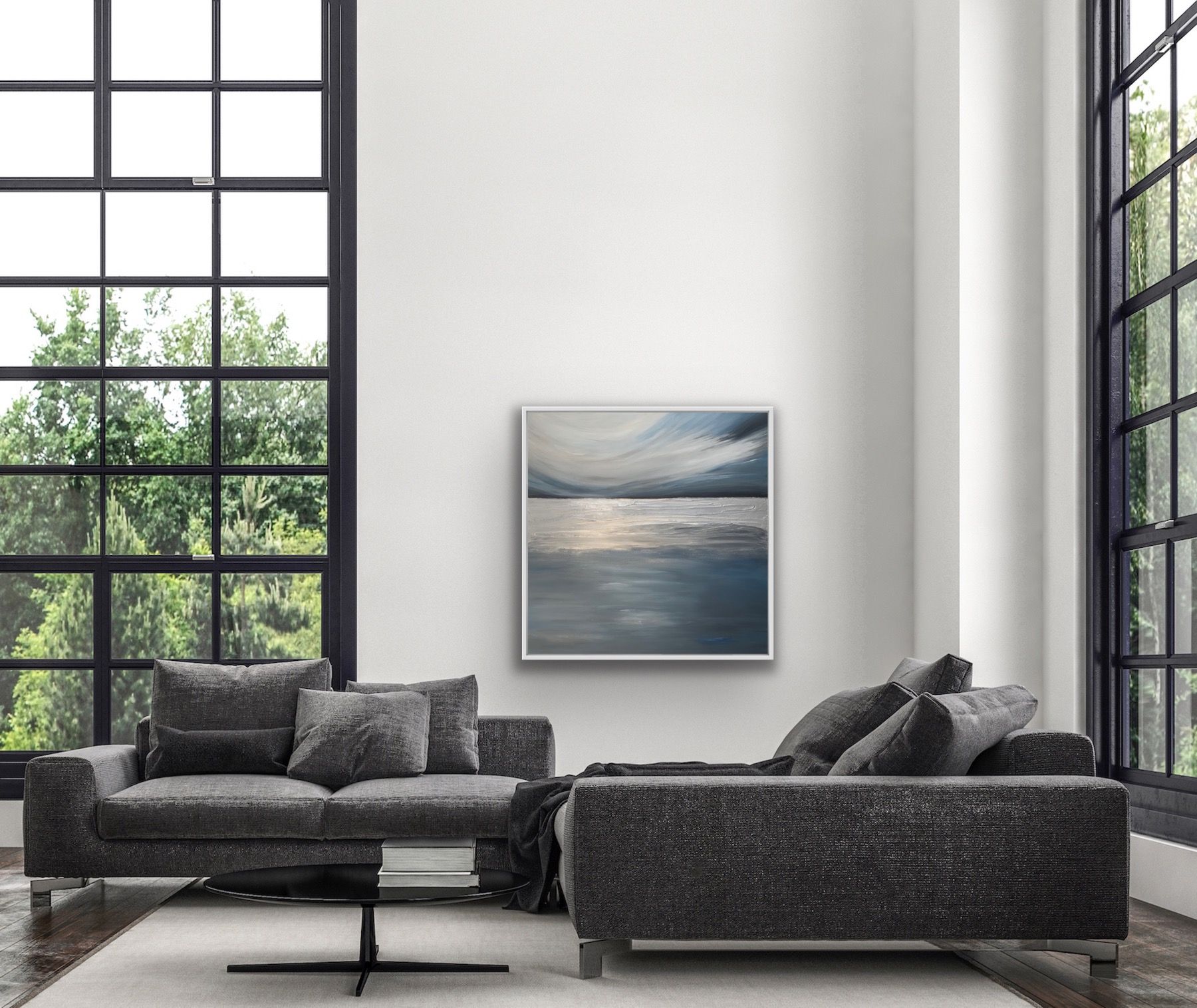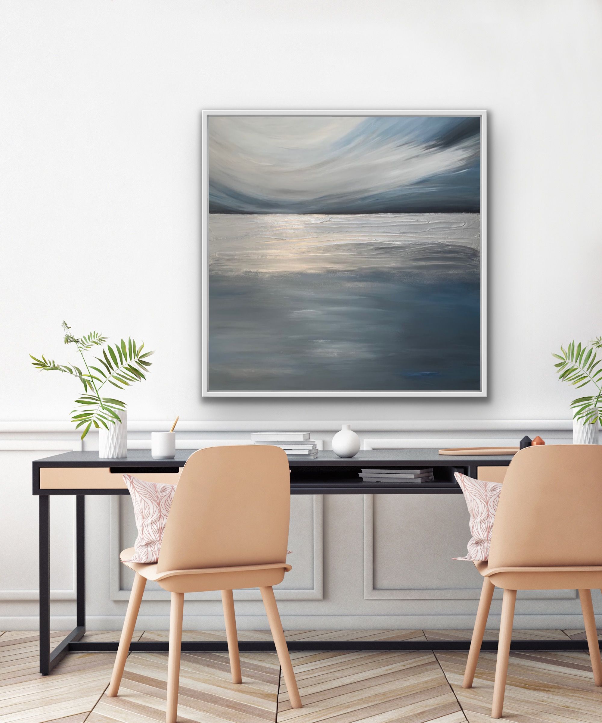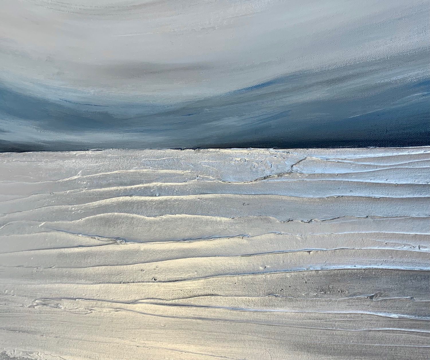“Over glassy silver seas, today we venture into the unknown”. Original canvas painted in mixed media using artist modelling clay and vibrant metallic silver and blue acrylics, this piece really does glimmer in any light, revealing a beautiful highly textured canvas. Staple free edges, ready to hang. Signed and comes