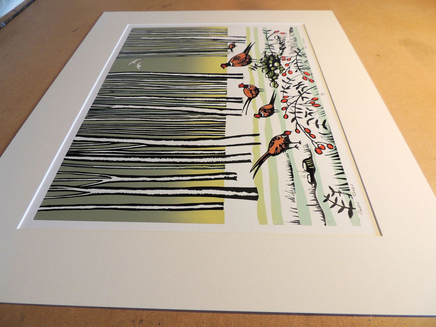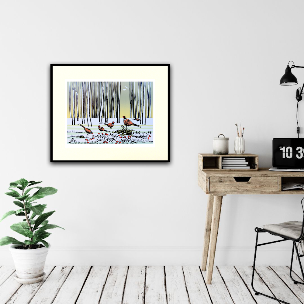 It takes quite a snow storm to decorate trees so evenly. I was inspired by a winter walk where our local road was blocked with snow. Winter is one of those seasons where bright red rose hips still survive and add a spark to the absence of colour elsewhere. Pheasants