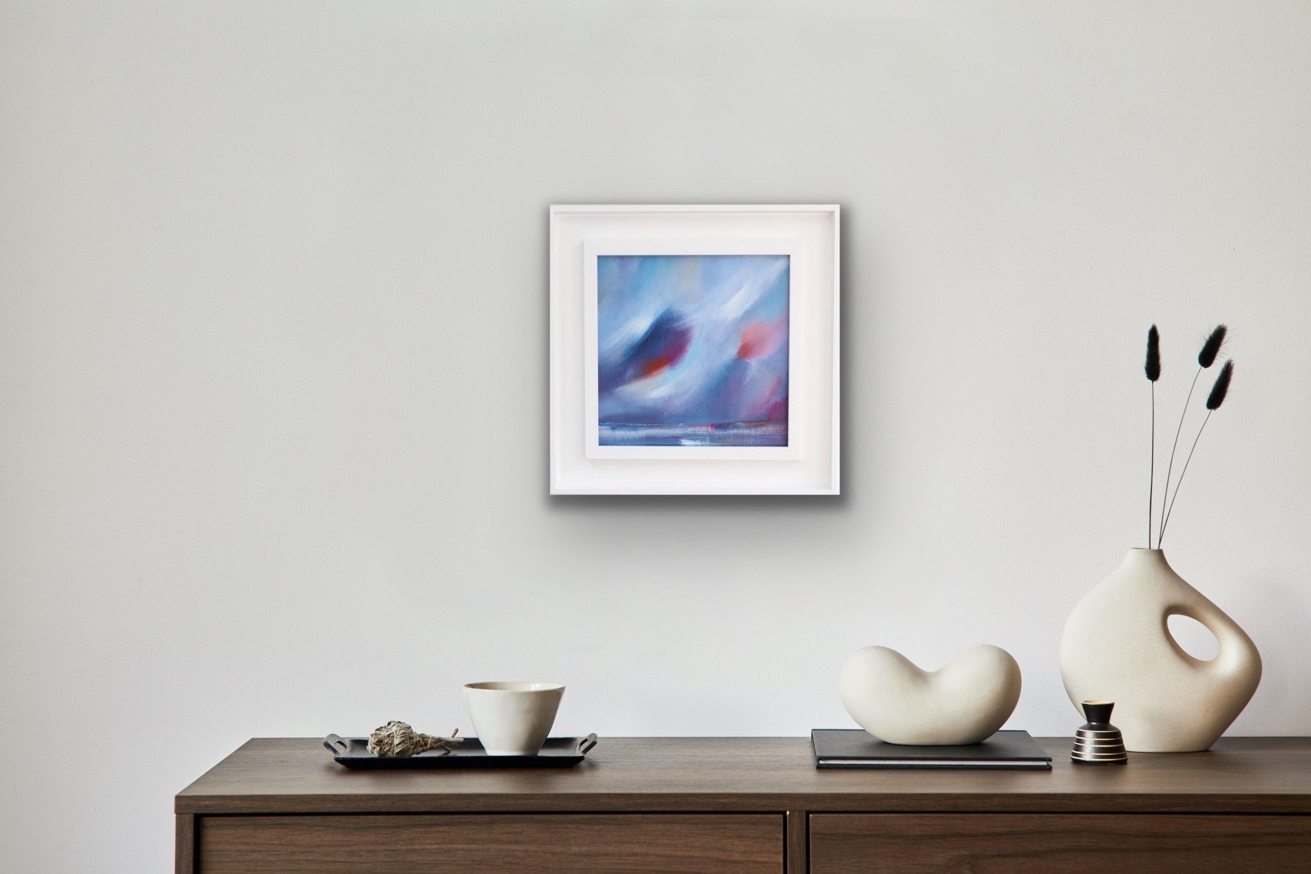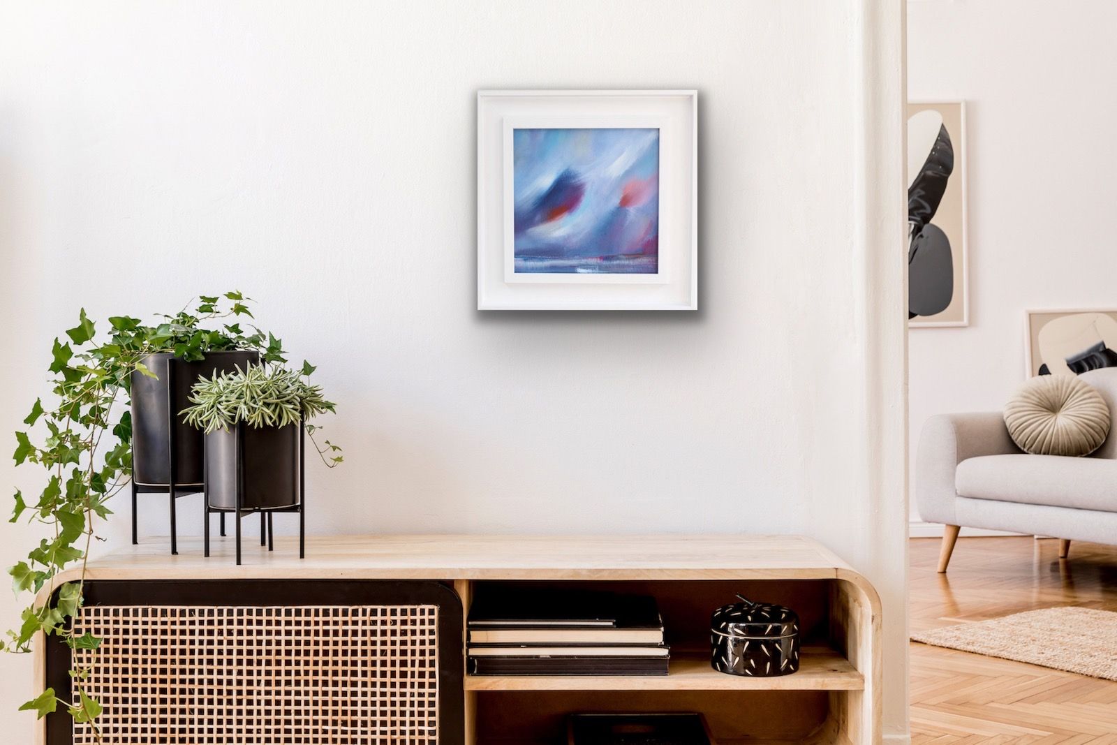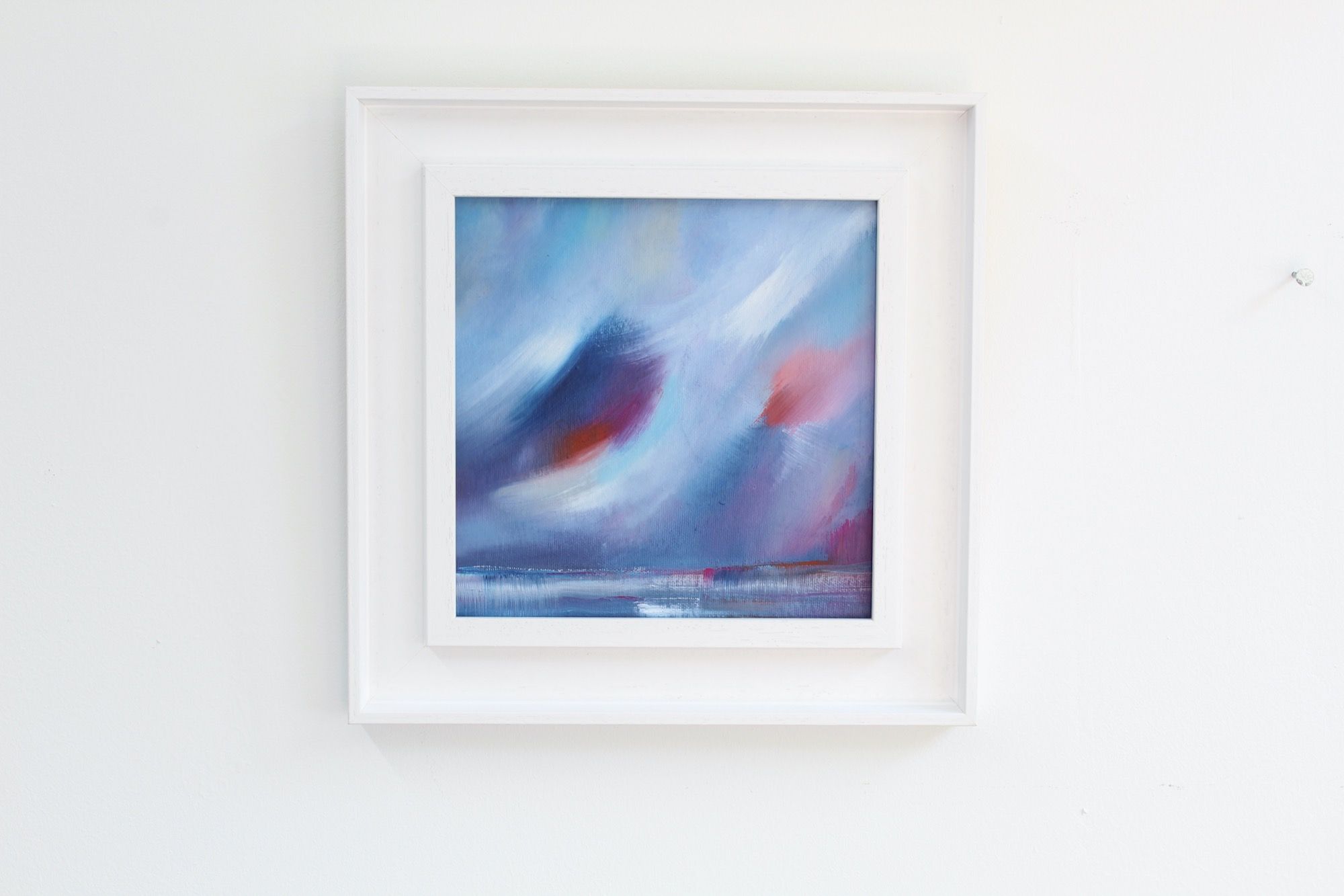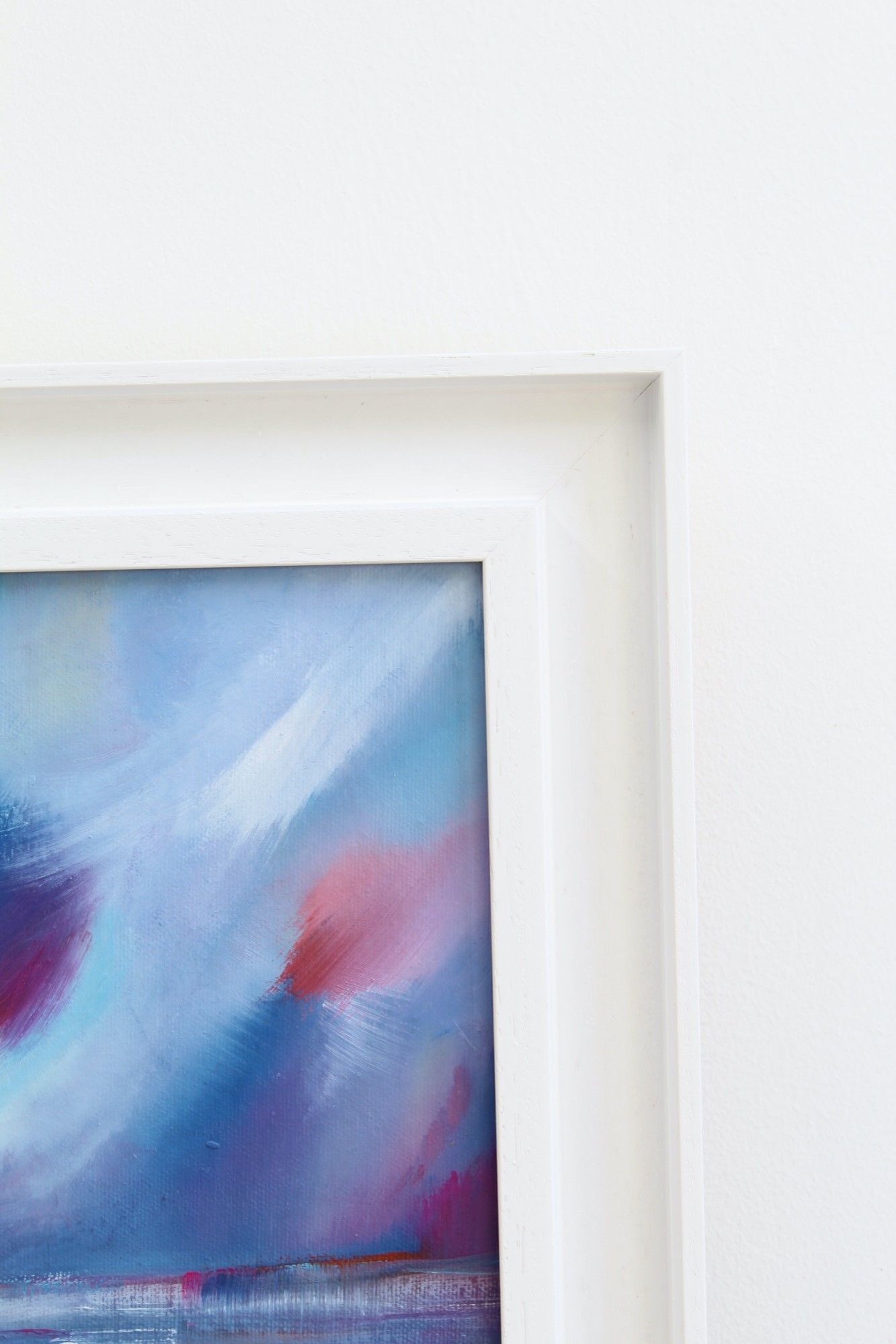 A framed original oil painting on board by Christina Sadler, also known as Maker Who Doesn't Make. Playful hints of aqua blue subtly grace the canvas. A deep inviting area of indigo is embraced with blends of saturated colour. A powerful brush of sweeping white bursts through the space and
