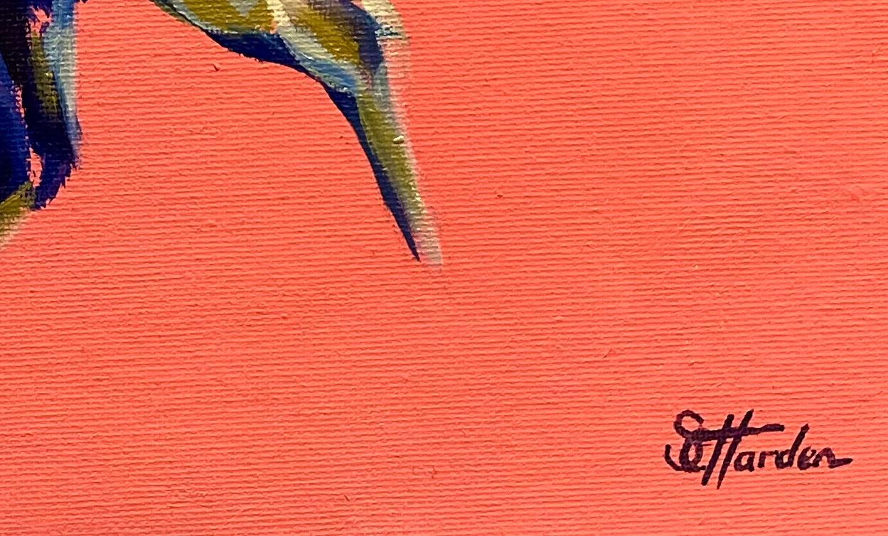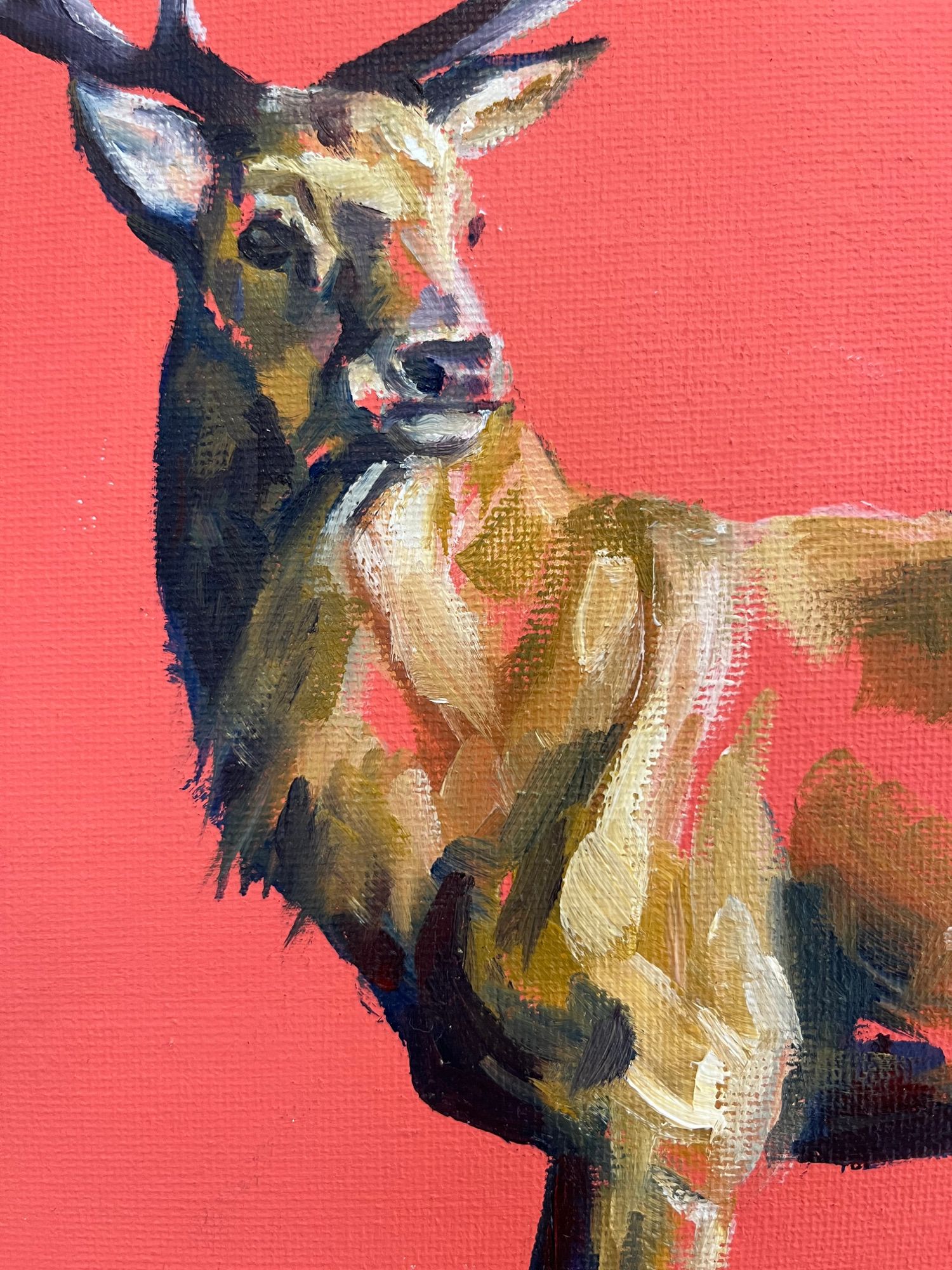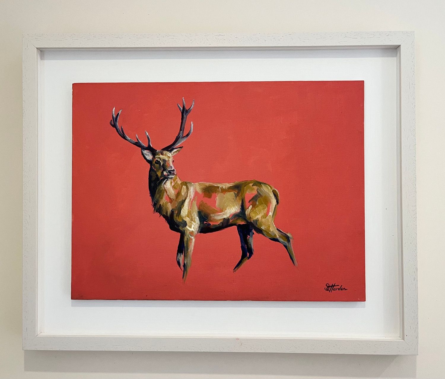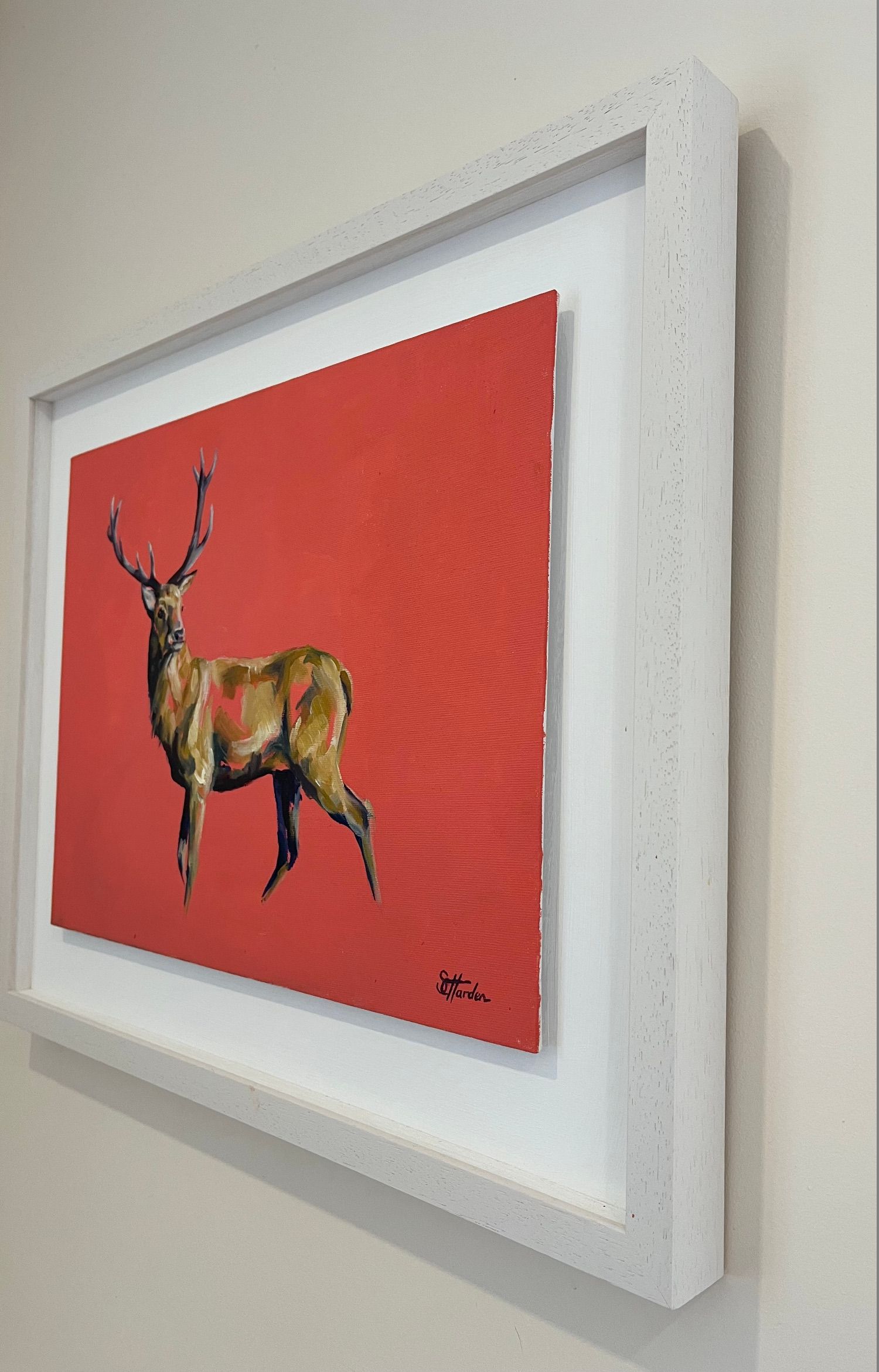 Hart of mine is an original oil painting by Sophie Harden. Contrasted blues and fawns on a coral background gives this piece a huge pop of colour and sense of movement the stag stands proud looking out to the room. Framed on a floating mount within a white textured wooden