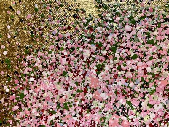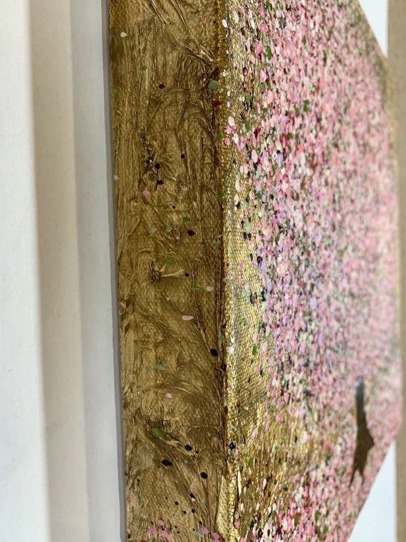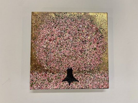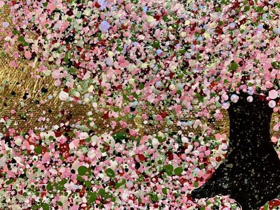 Sparkling Spring is a signed original acrylic painting on canvas of a blossoming tree with pink in a flowery field of the same colour against a gold sky.