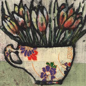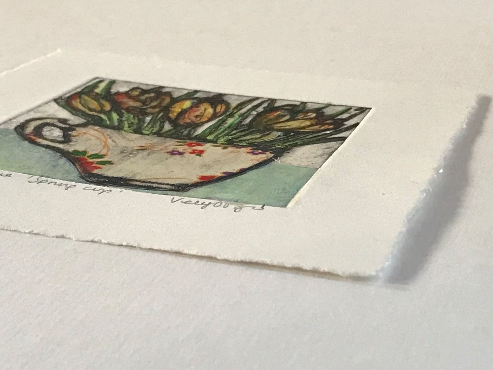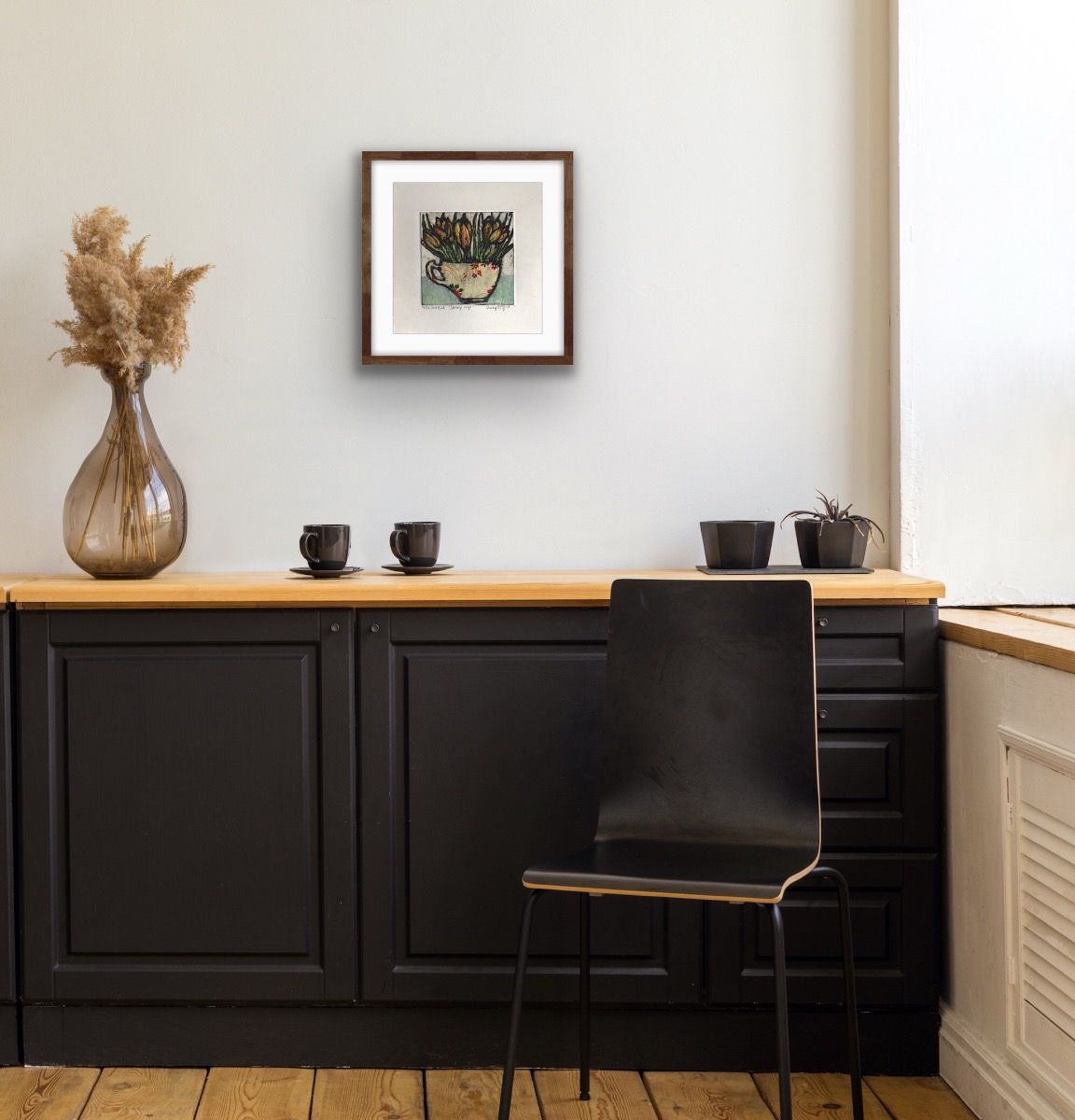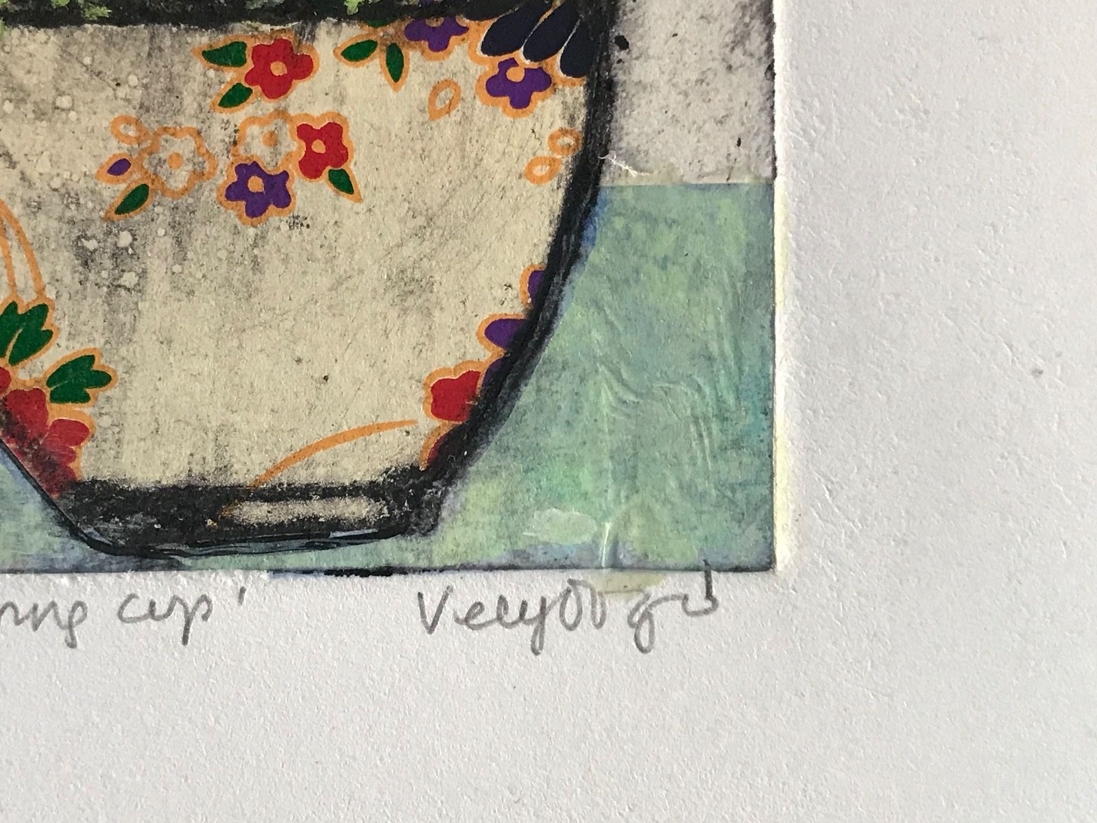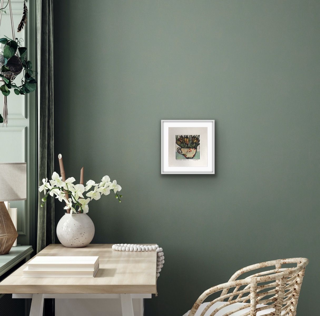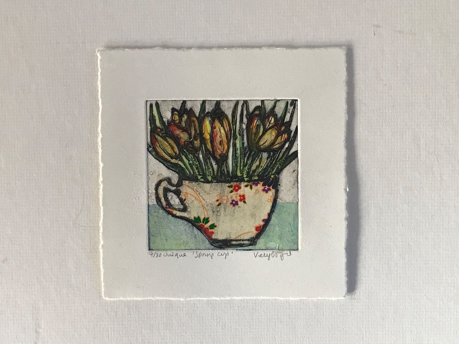 Vicky Oldfield Spring Cup Limited Edition Collagraph Print Edition of 30 Image size: H 10cm x W 10cm Paper size: H 18cm x W 18cm x D 0.1cm Sold Unframed Please note that insitu images are purely an indication of how a piece may look. Spring Cup is a limited edition collagraph print, hand coloured