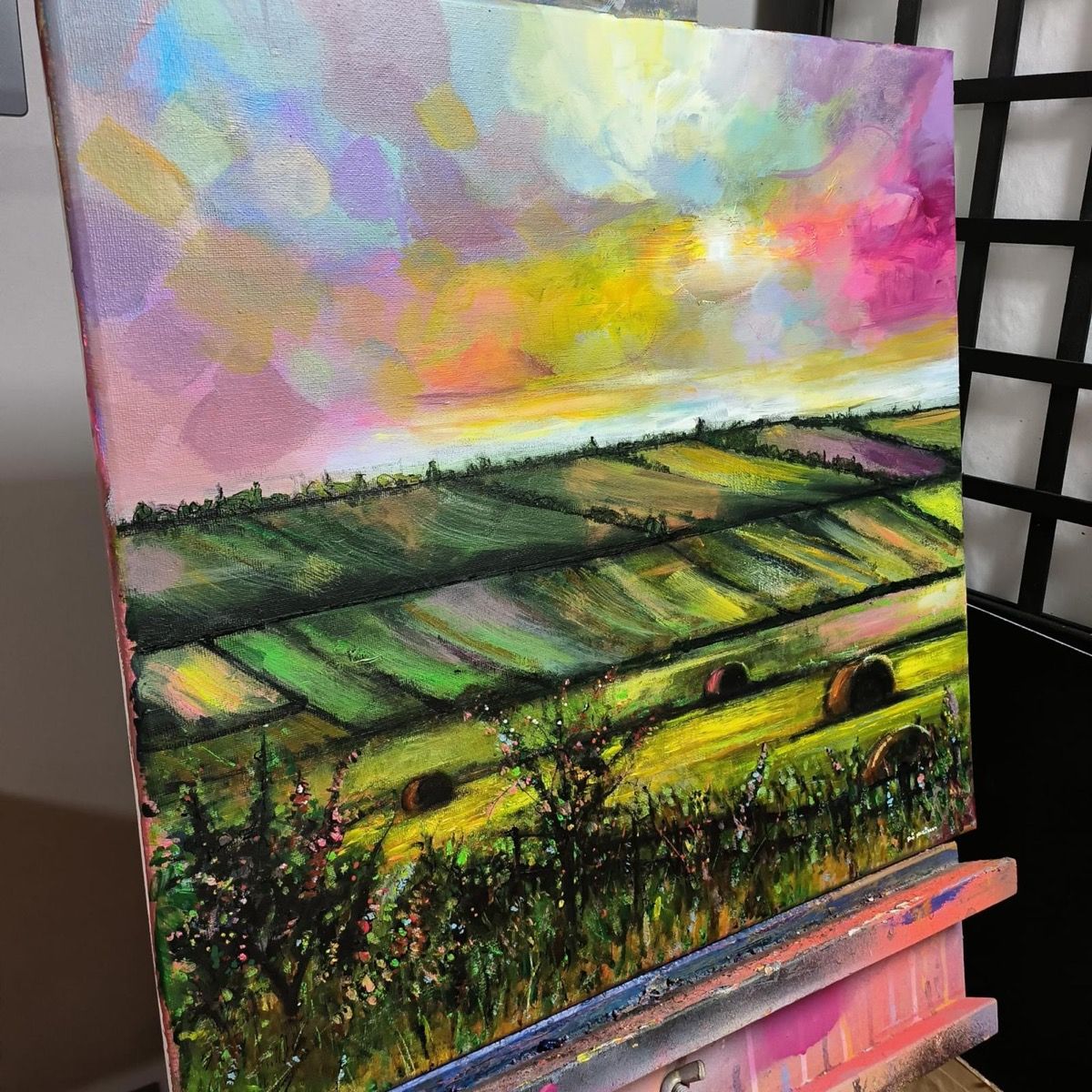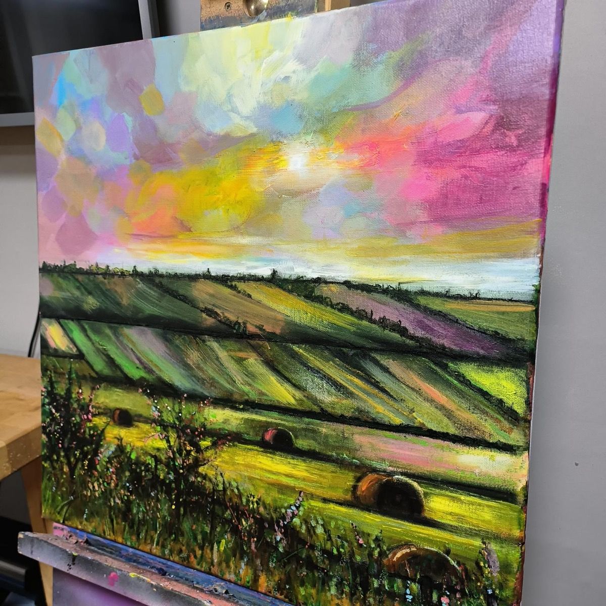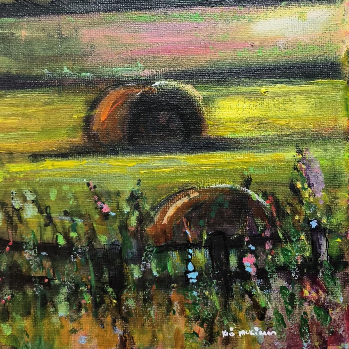 Original painting by Kris McKinnon. A view of hay bales on green hills under a colourful sky showing various pastel tones.