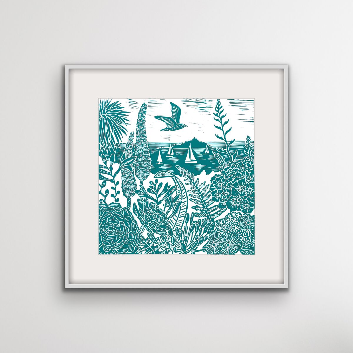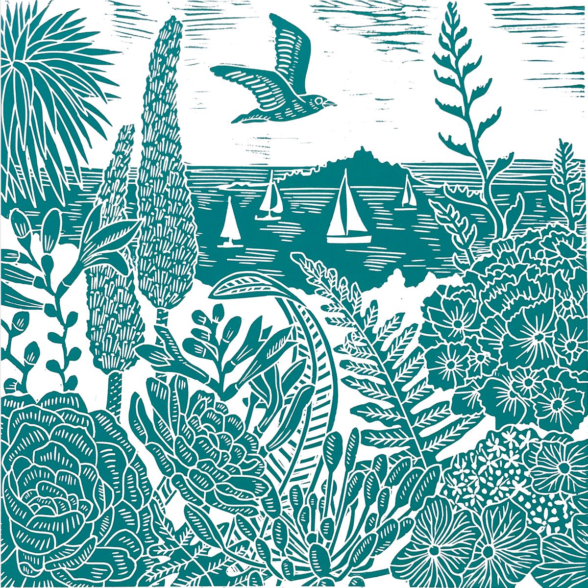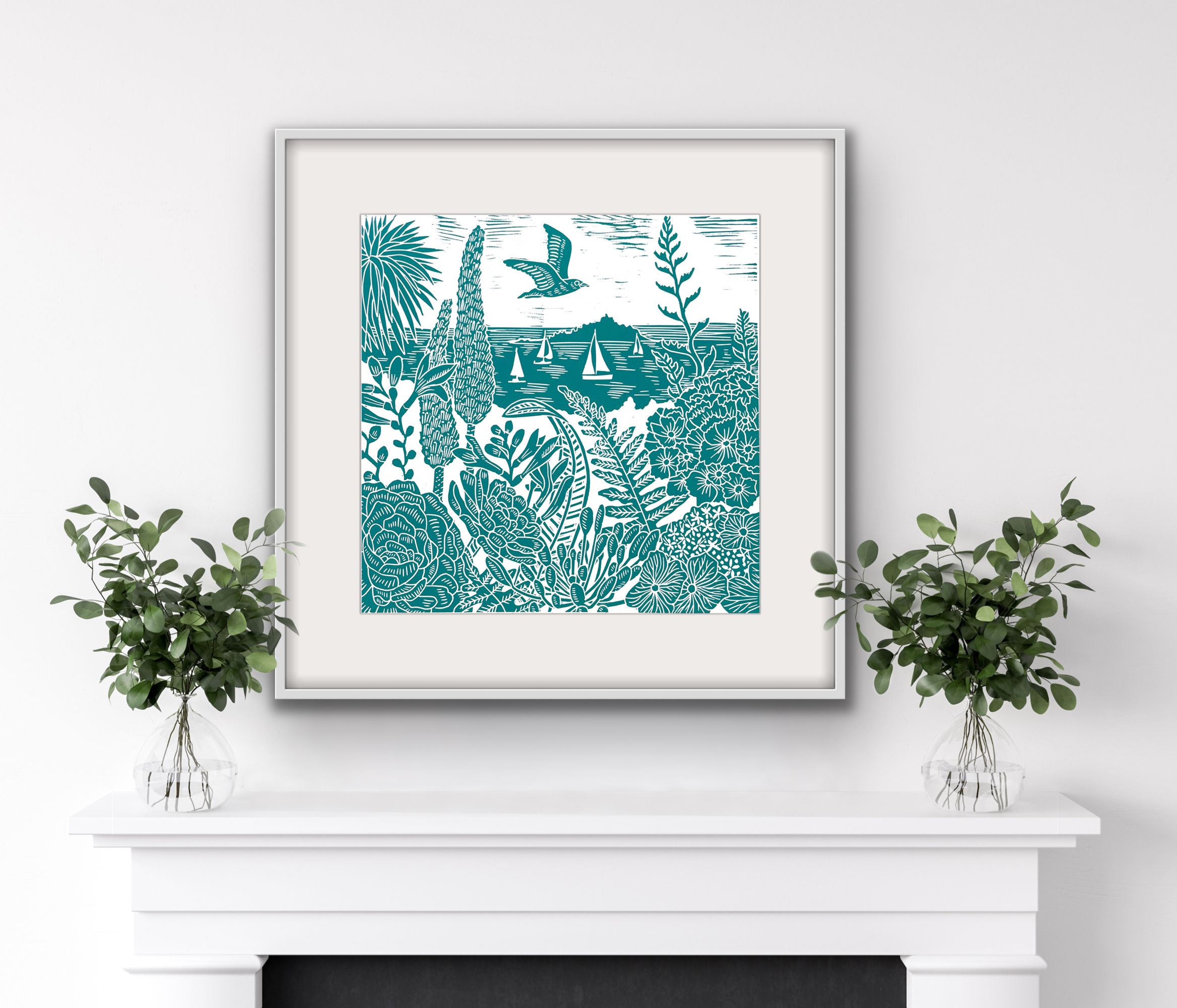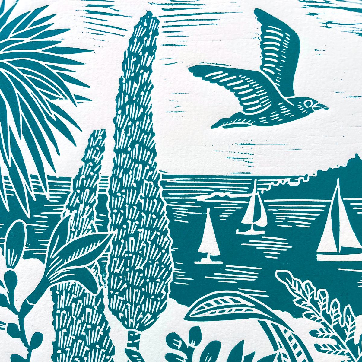 This hand made linocut print depicts the view of St Michael’s Mount in Cornwall from The Tremenheere Sculpture Gardens. It features a variety of tropical plants such as crocosmia, echium pininanas, aeoniums, palms, agapanthus, ferns and hydrangeas which all can be found growing in the sub tropical climate of Cornwall.