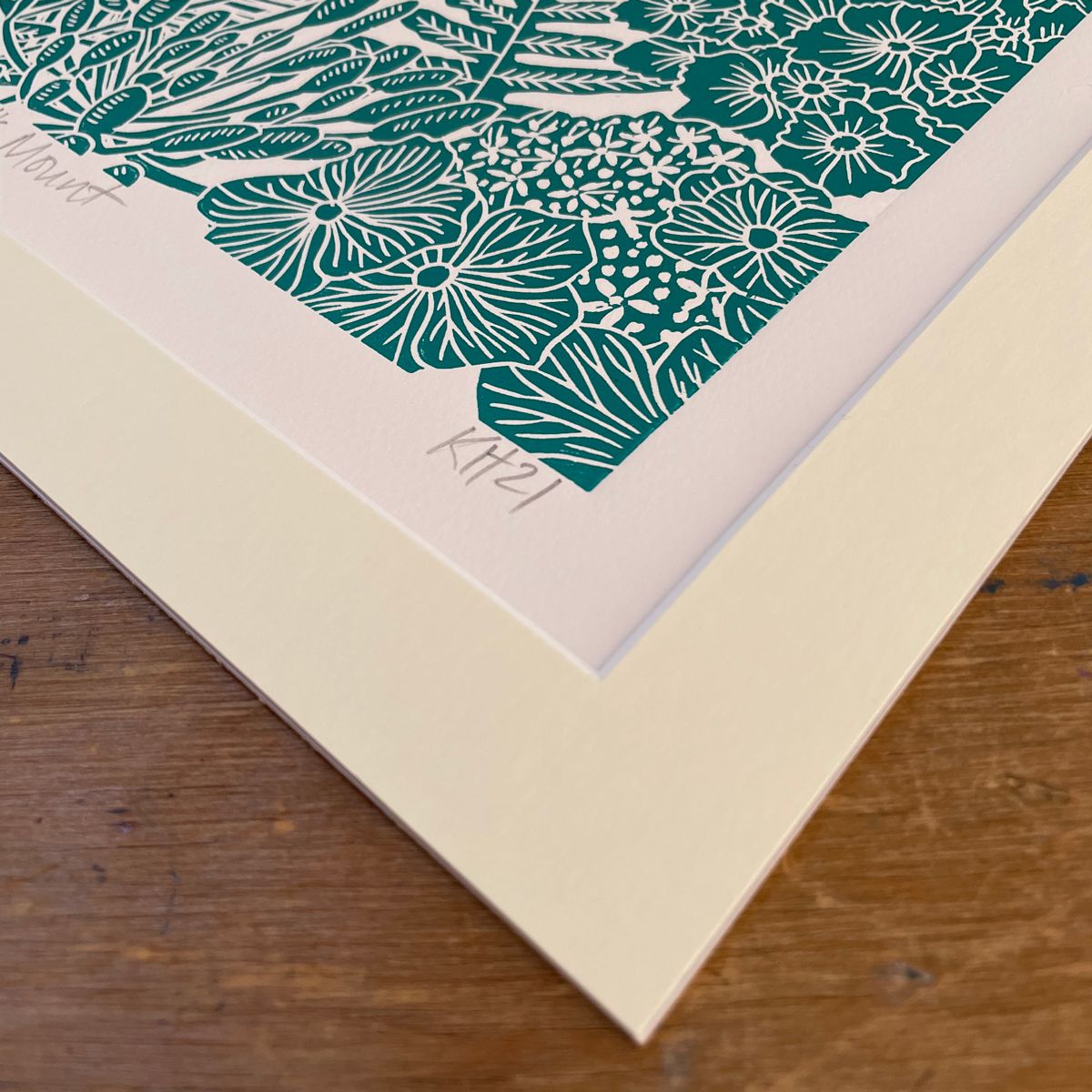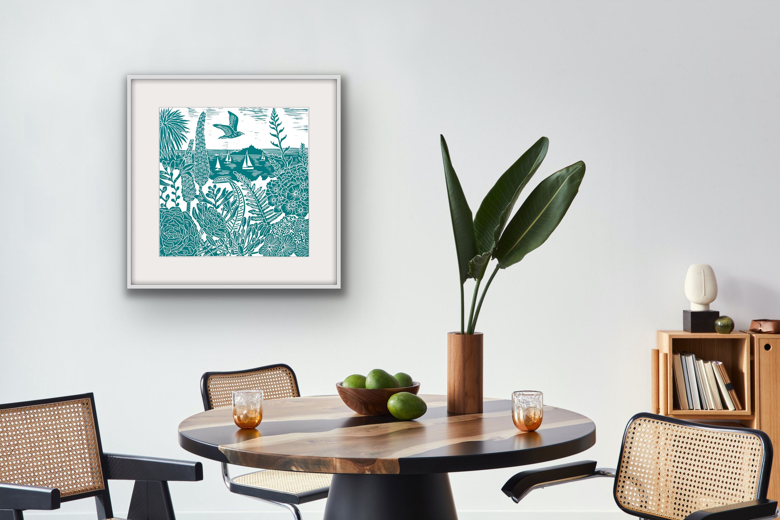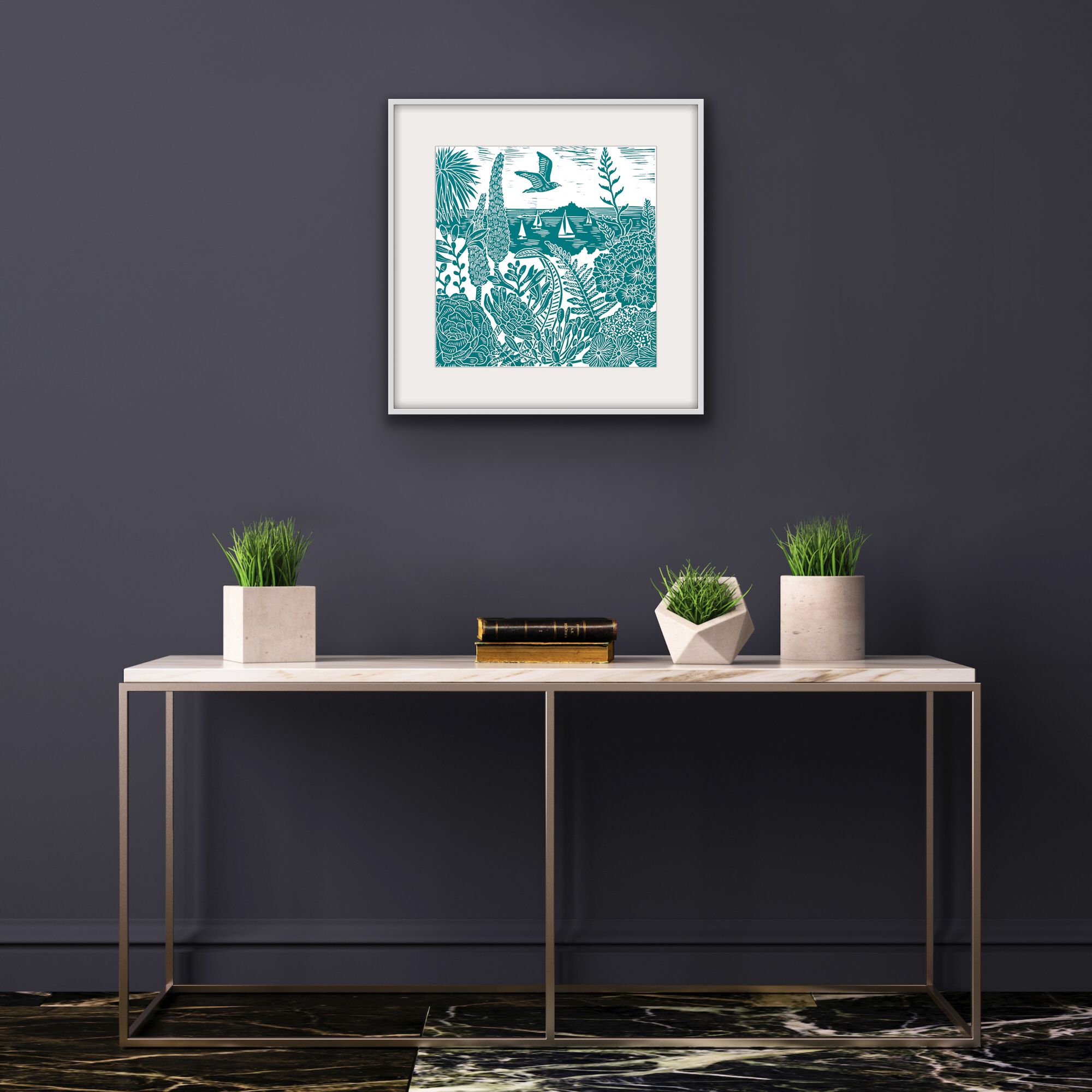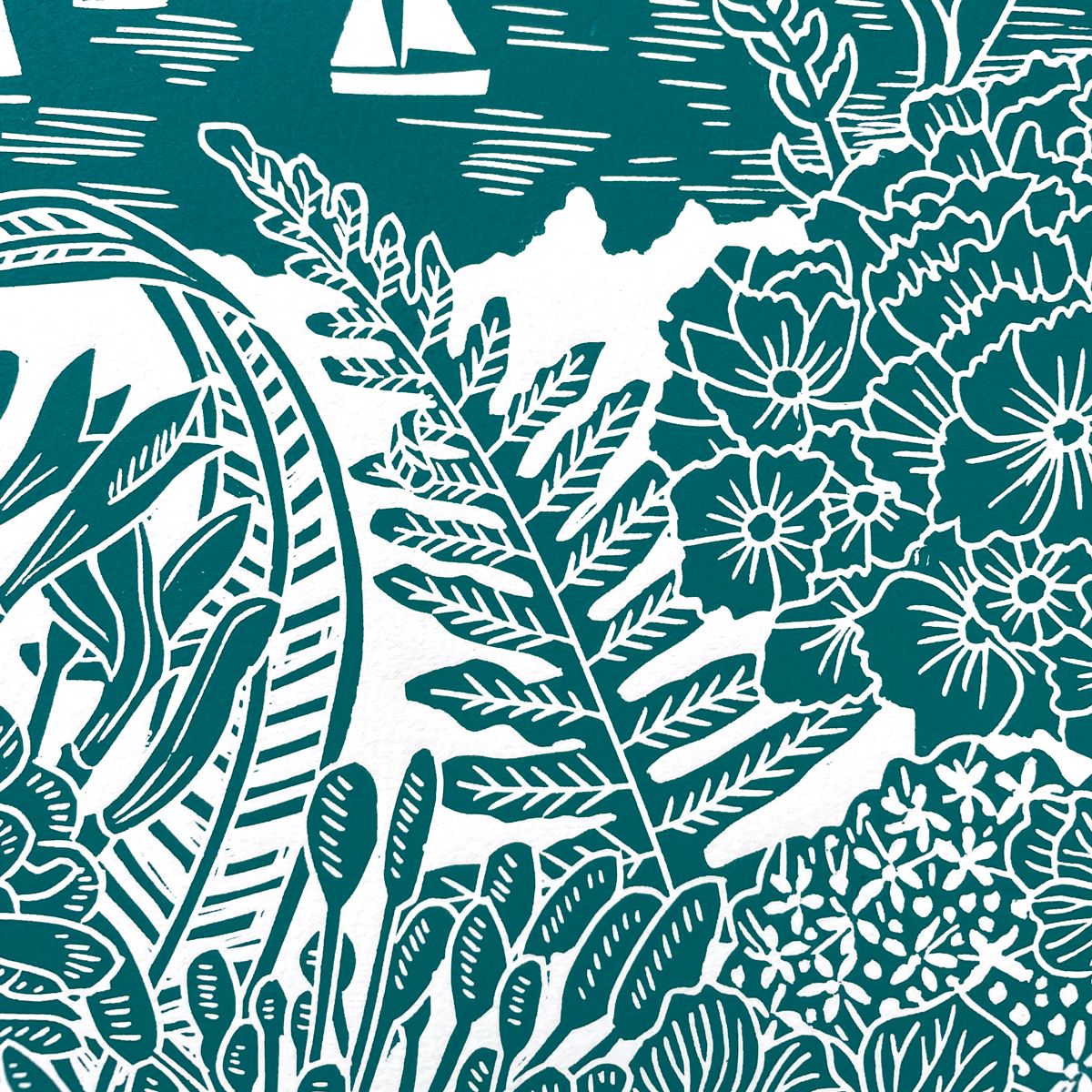 This hand made linocut print depicts the view of St Michael’s Mount in Cornwall from The Tremenheere Sculpture Gardens. It features a variety of tropical plants such as crocosmia, echium pininanas, aeoniums, palms, agapanthus, ferns and hydrangeas which all can be found growing in the sub tropical climate of Cornwall.