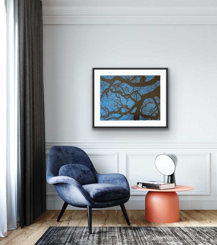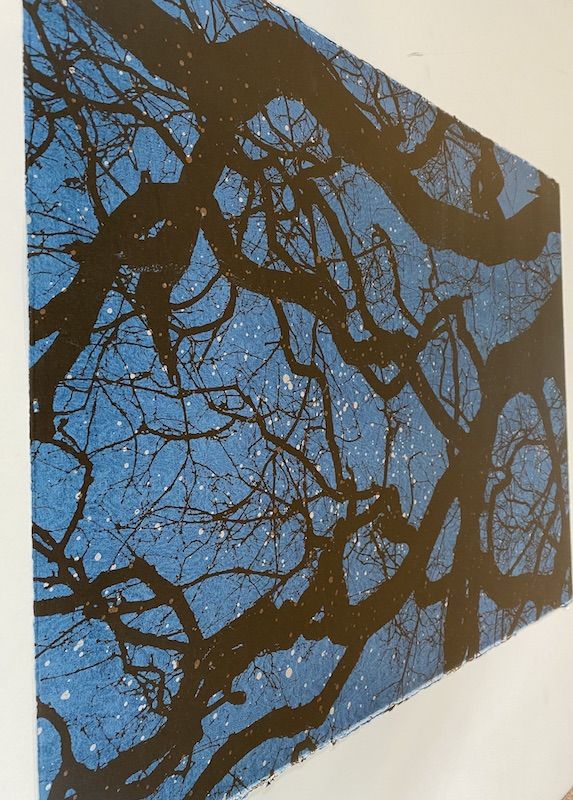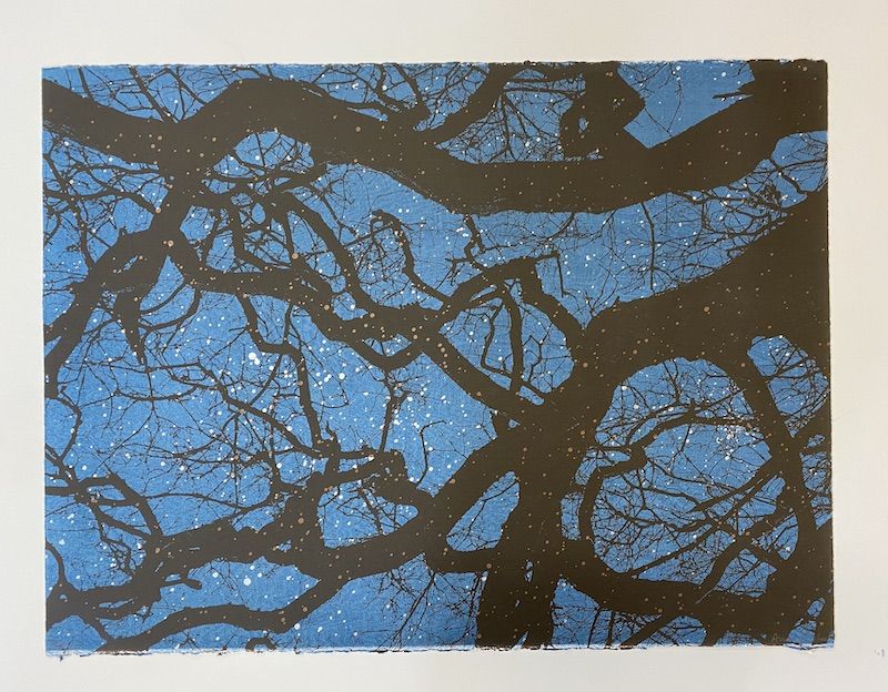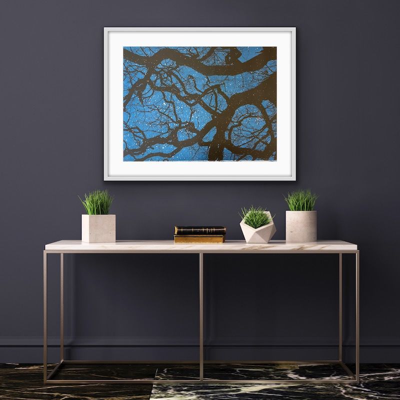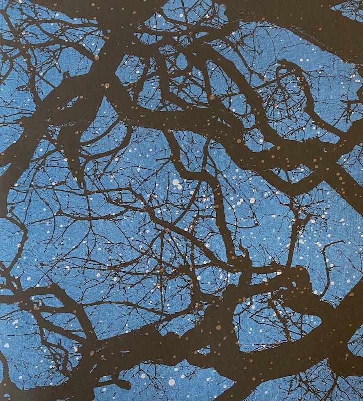 Starry Night (large) is a limited edition print by Anna Harley. This print depicts a scene of tangled branches with the night sky above filled with stars.