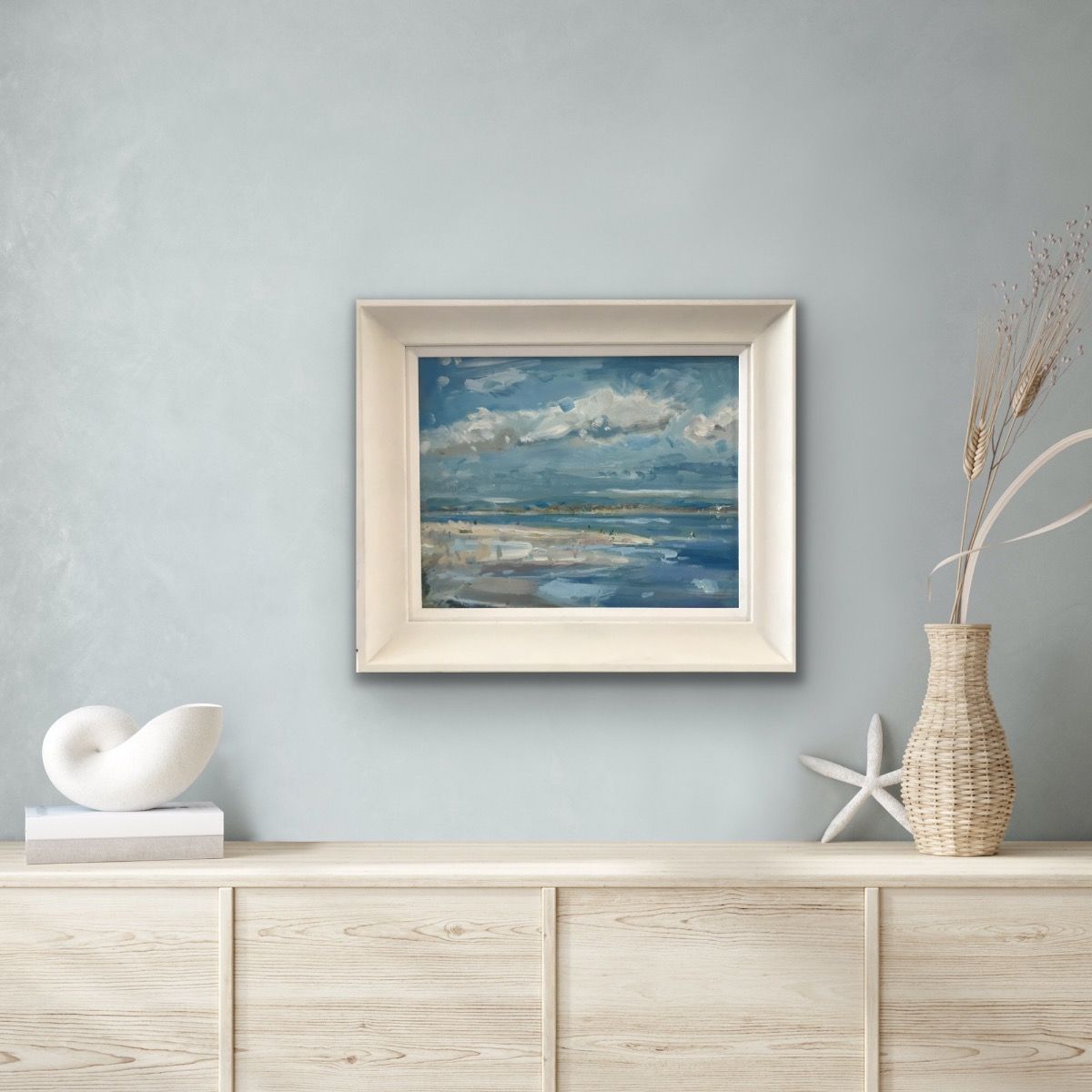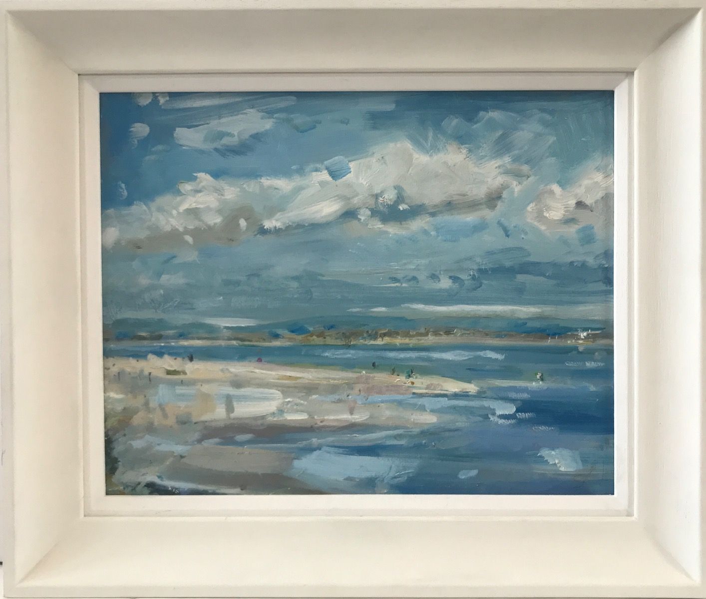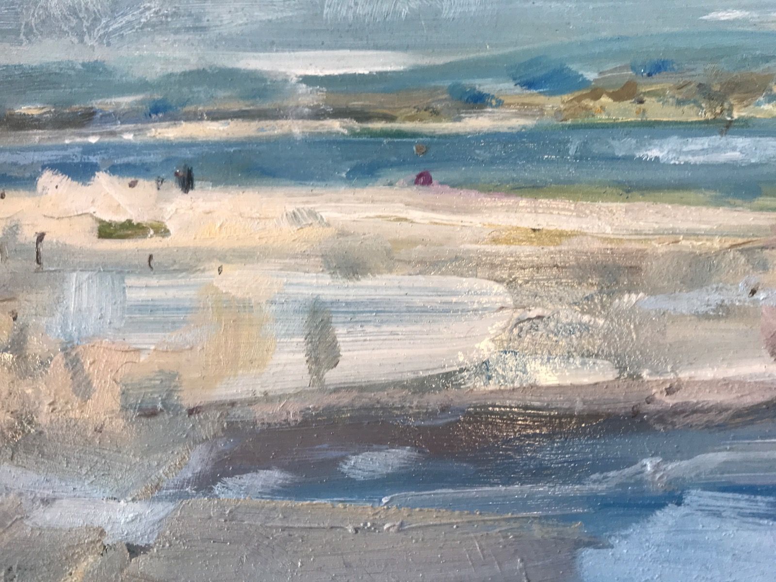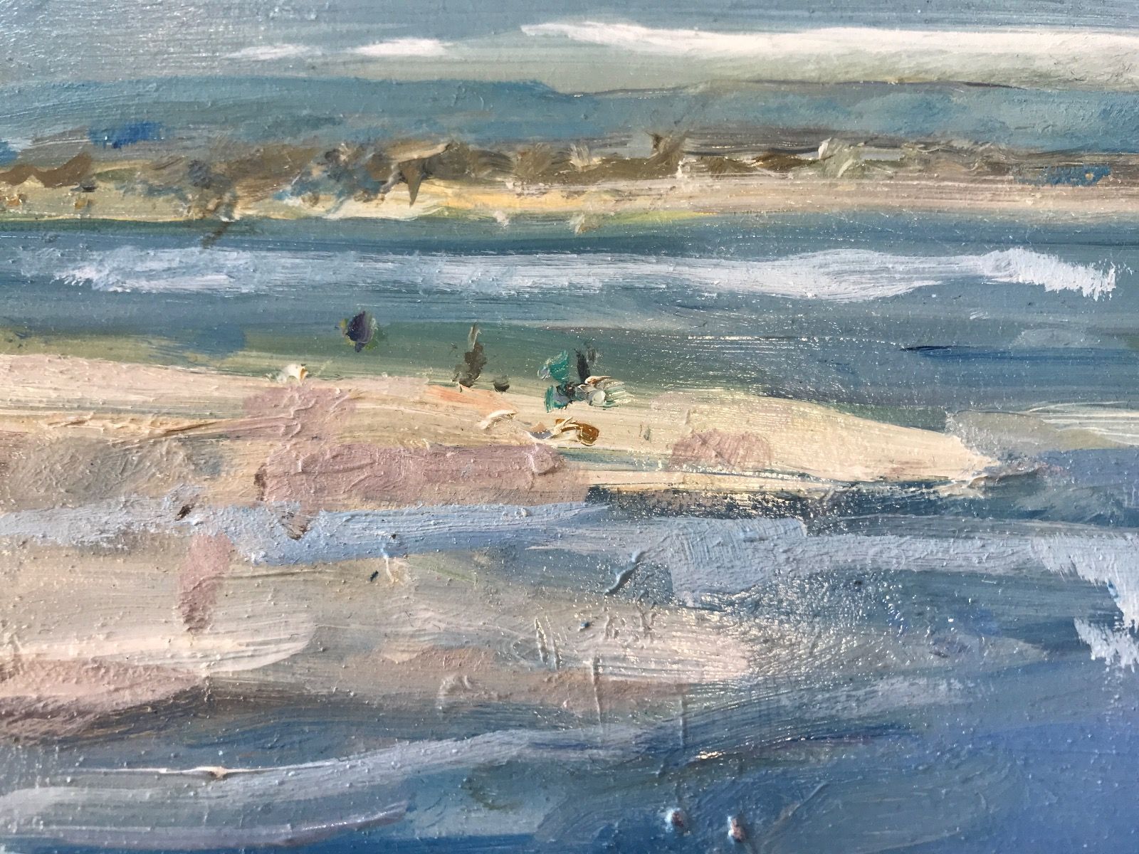 Stephen Kinder East Head windy day Original Landscape Painting Oil Paint on Board This painting was completed on location in the late summer of 2020. It was a breezy day on West Wittering and there was quite a lot of activity on East Head. I decided to paint the scene as